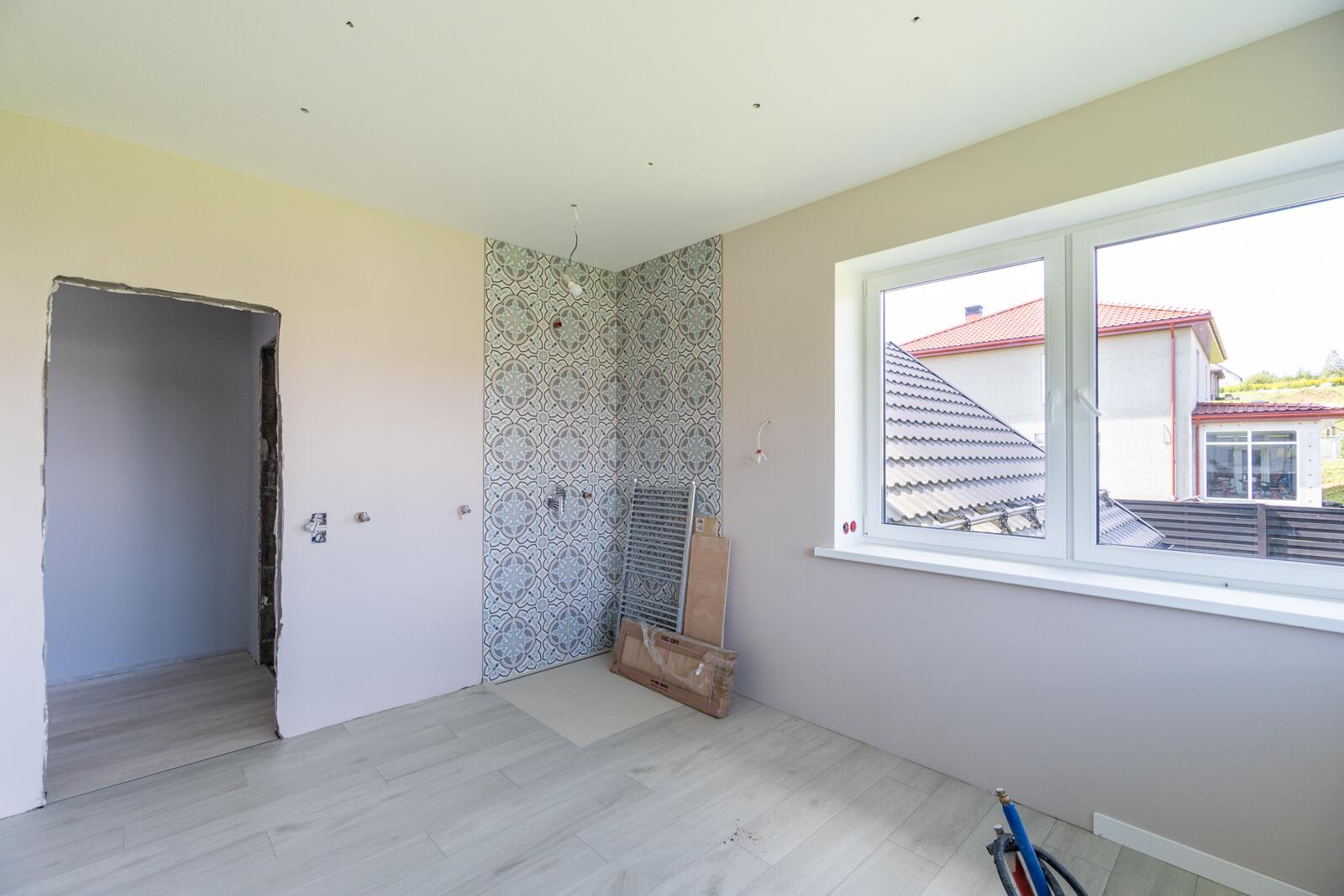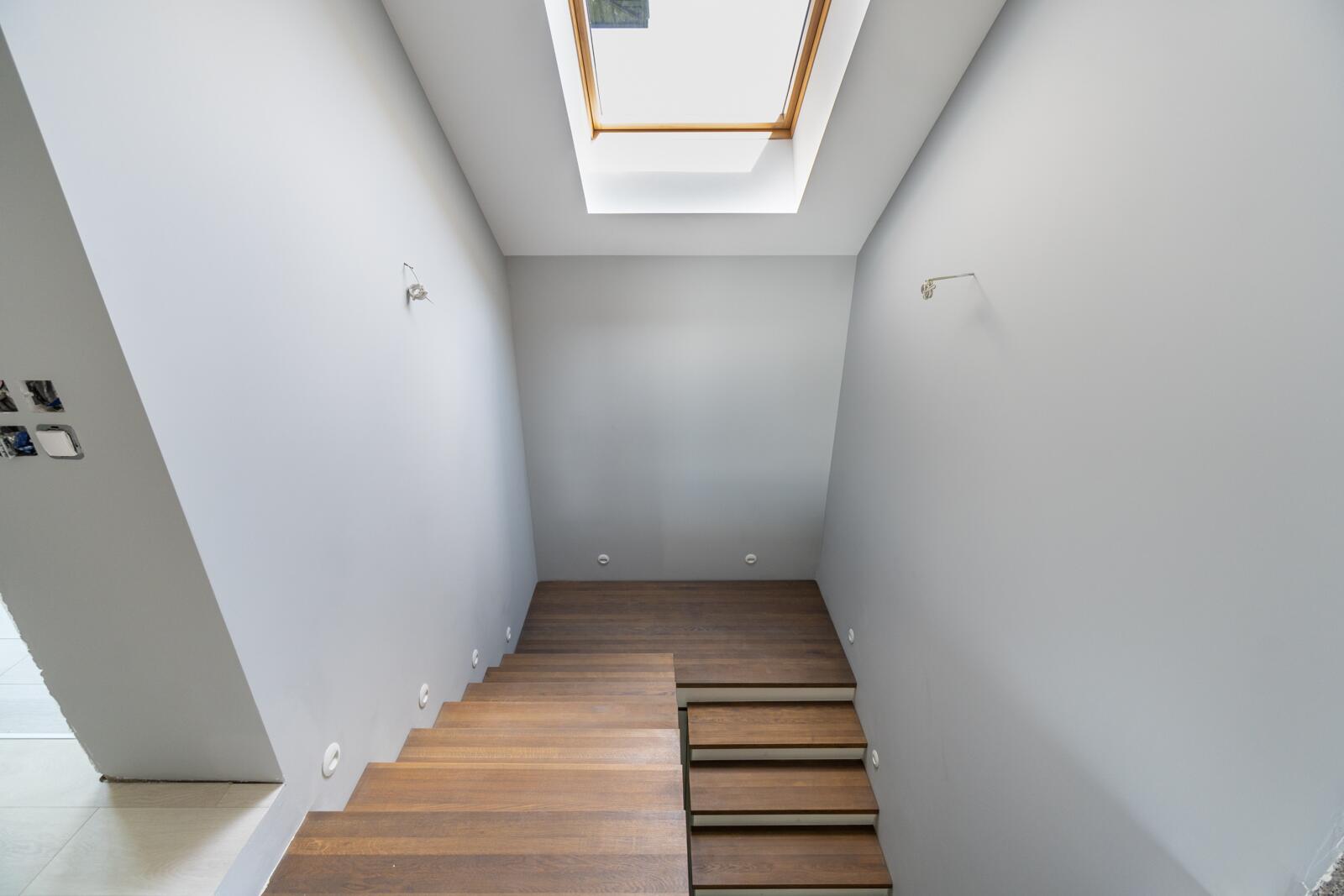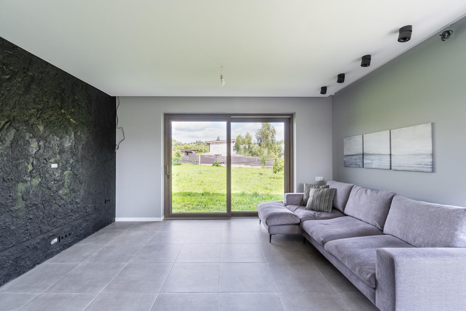Отделка: широкоформатный керамогранит в зоне камина, керамогранит на первом этаже, на втором – ламинат 12мм, лестница выполнена из дуба. Двухкамерные стеклопакеты немецкого производителя.