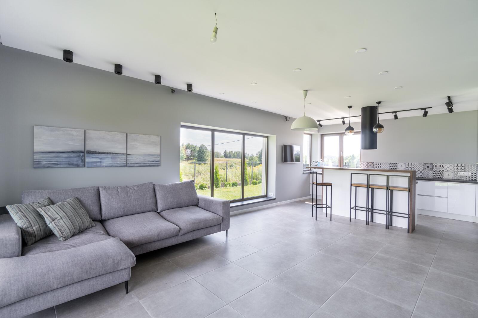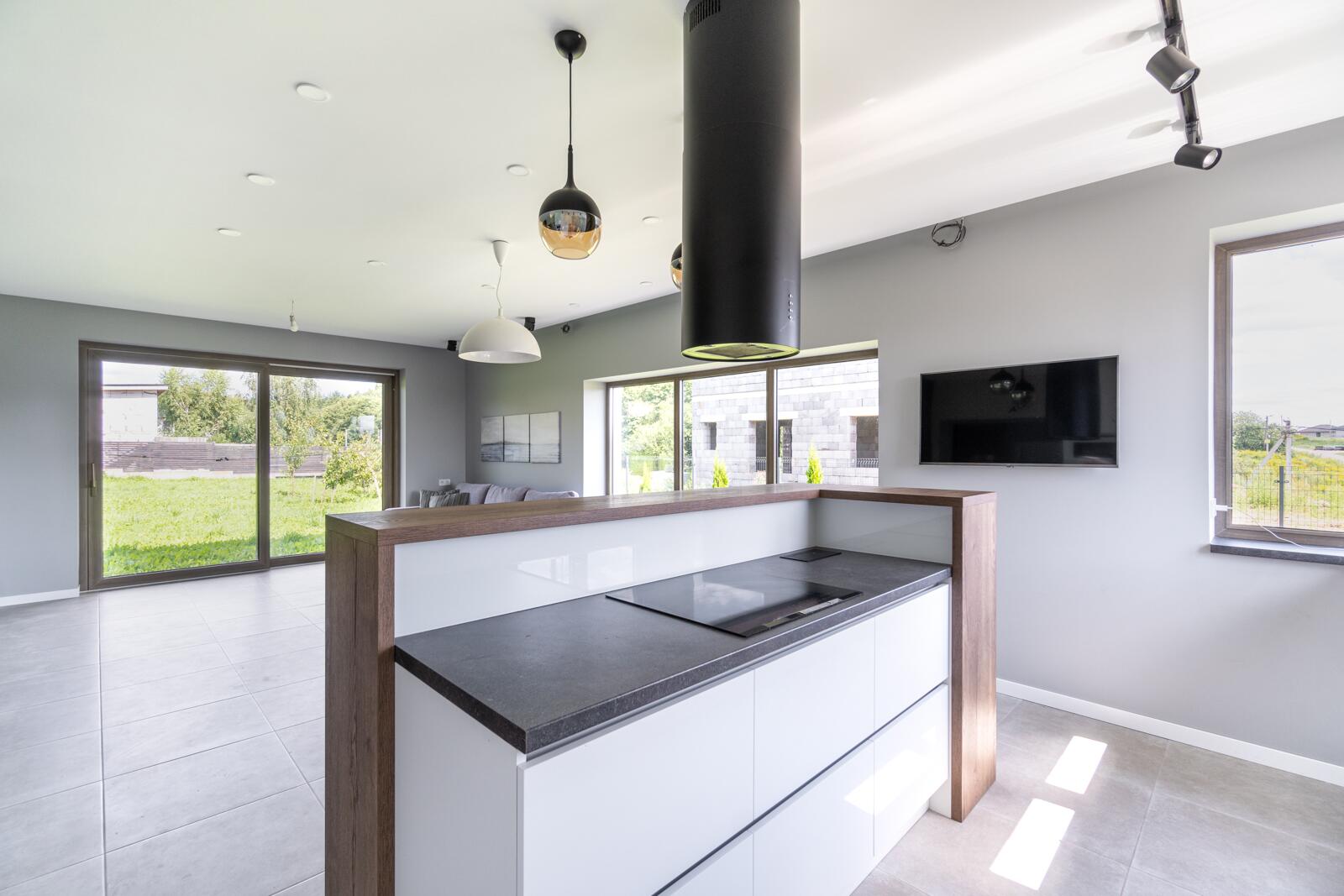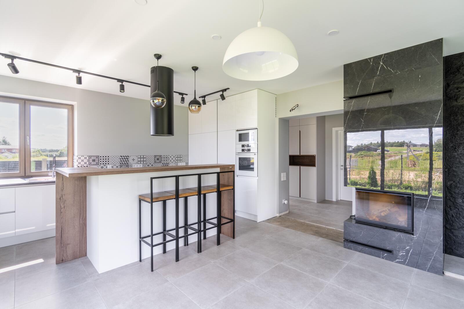 - современная кухня/столовая/гостиная с камином 40,6 кв.м.,