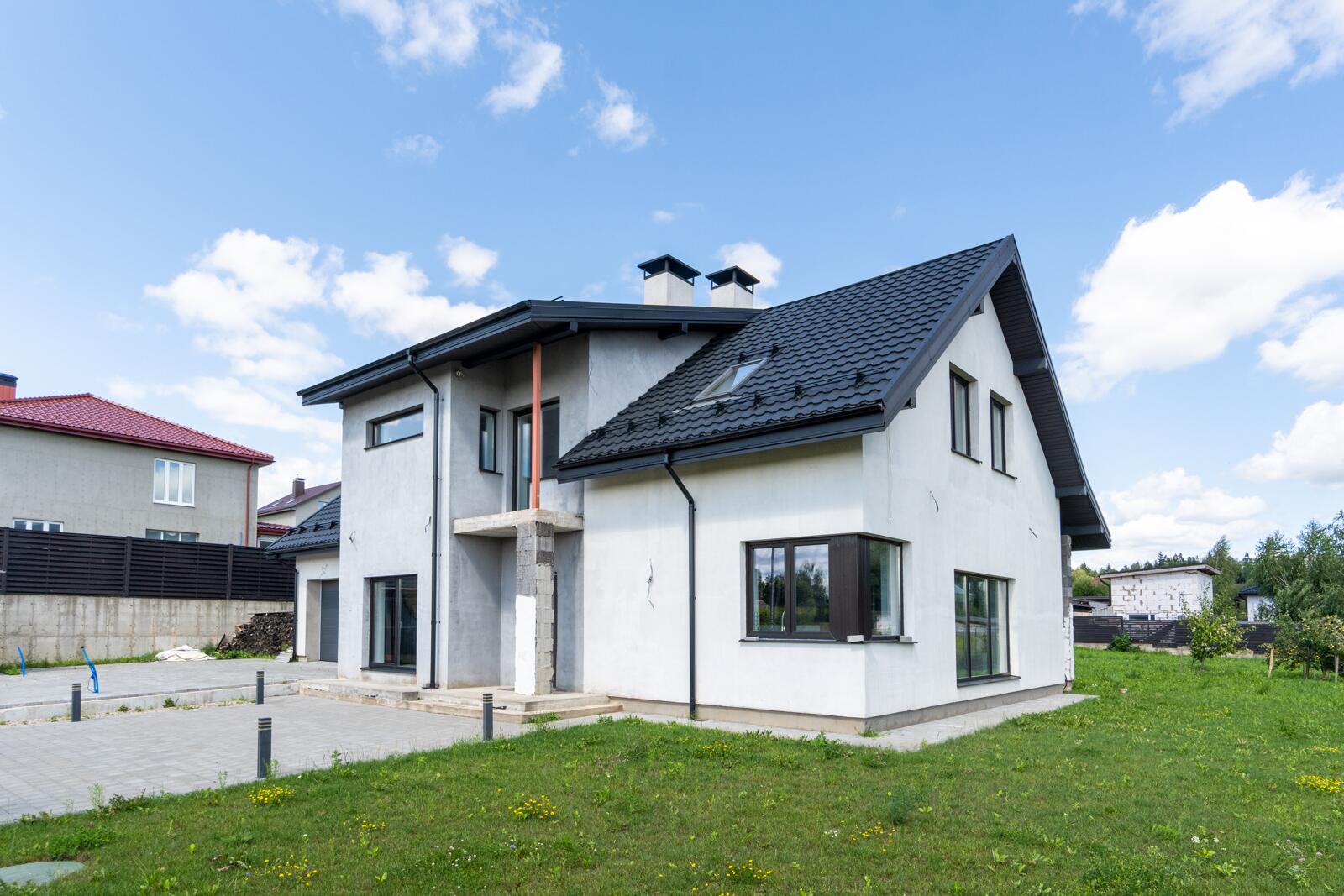 Конструкция дома: керамзитобетонные блоки шириной 400 мм + 100мм утеплитель. Крыша - металлочерепица, утеплена 250мм мин.ватой. Ливневка выведена в отдельный колодец для сбора воды на автополив. Фундамент: сборно-ленточный, утепленный 50мм пеноплексом.