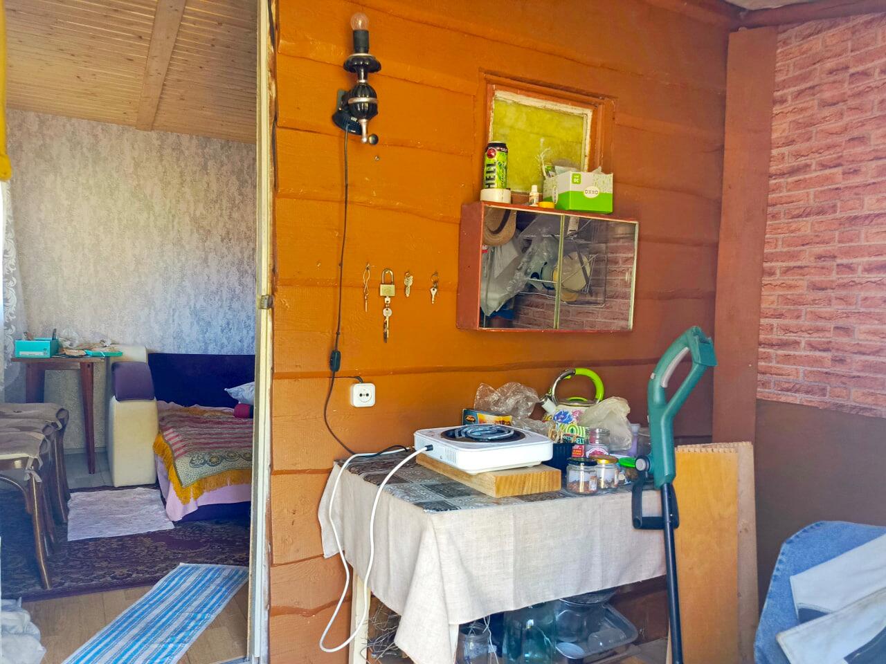 Дом сборно-щитовой, состоит из комнаты и прихожей, готов к проживанию, утеплены стены и потолок, обшит вагонкой, крыша шифер. Электричество заведено, вода – колодец на улице рядом с домом.