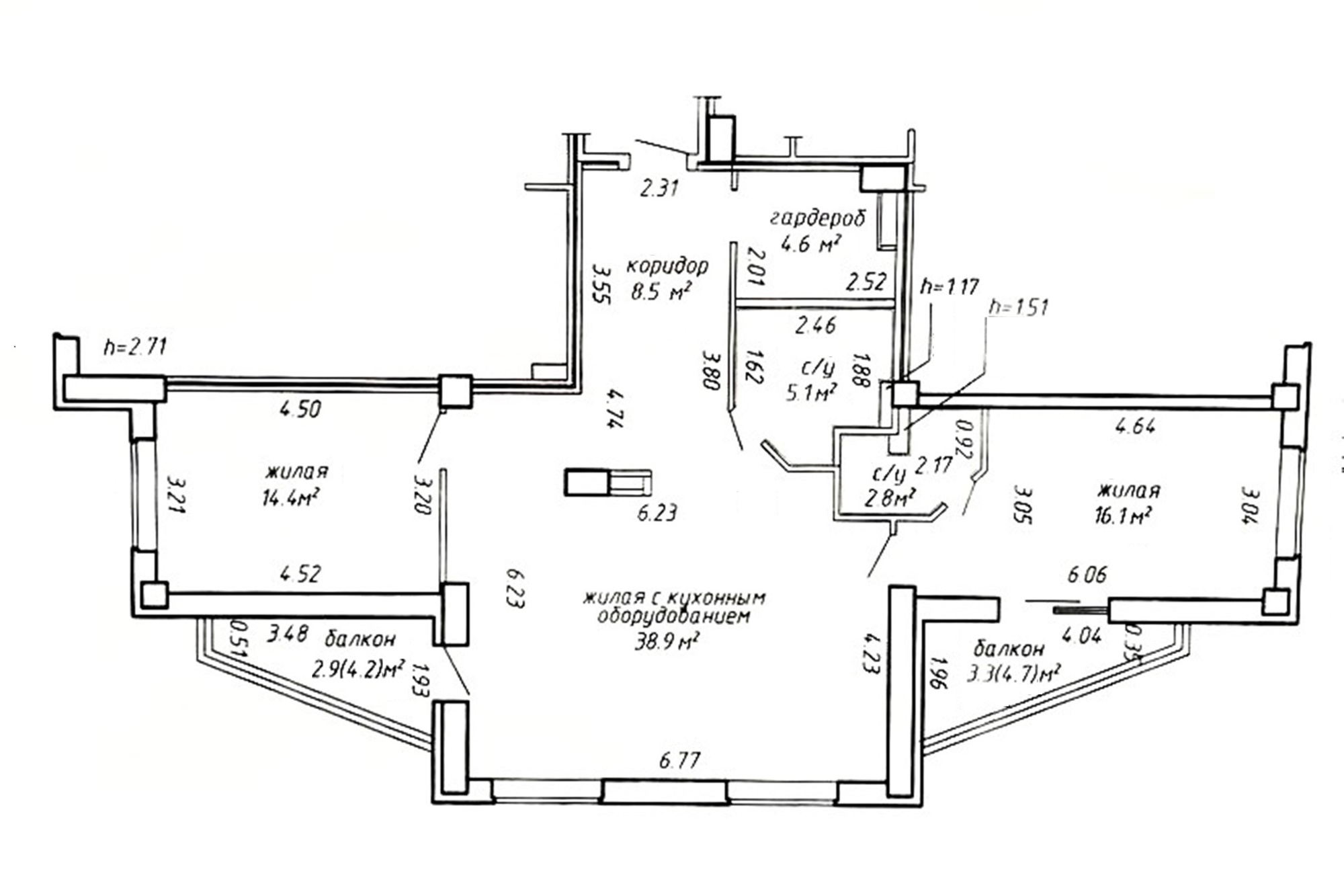 Жилое помещение расположено на 6 этаже 19 этажного каркасно-блочного дома 2016 года постройки. Общая площадь 90,4м2 (по СНБ 96.6м2). Жилая 69.4м2 состоит просторной гостиной 38.9м2 с кухонным оборудованием, большой спальни 16.1м2 и уютной детской 14.4м2. В квартире есть два санузла, две застекленных балкона и просторная гардеробная. Высота потолков 2.71м.
