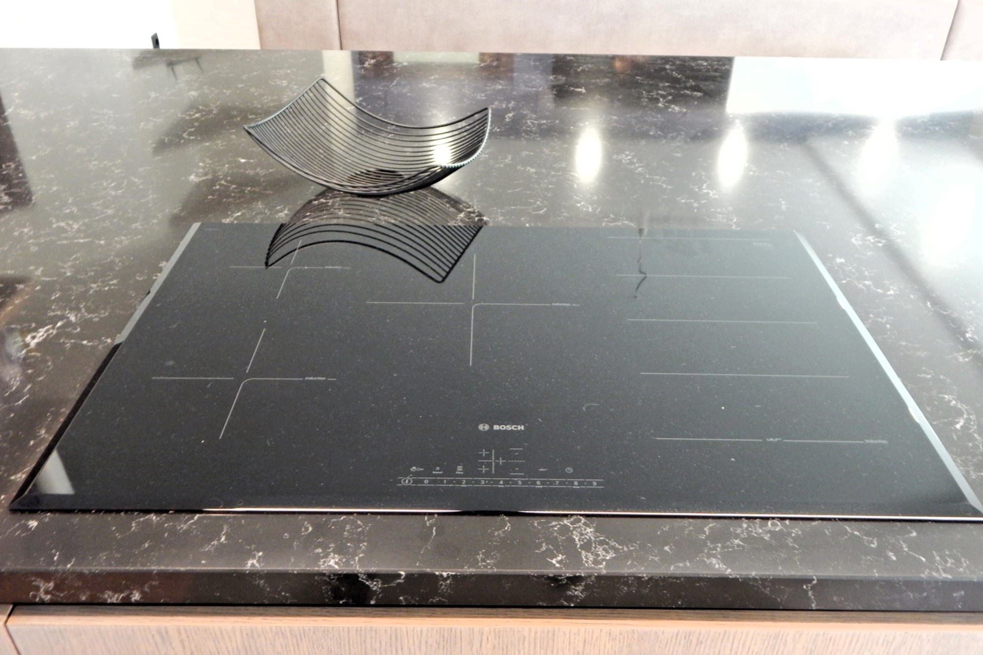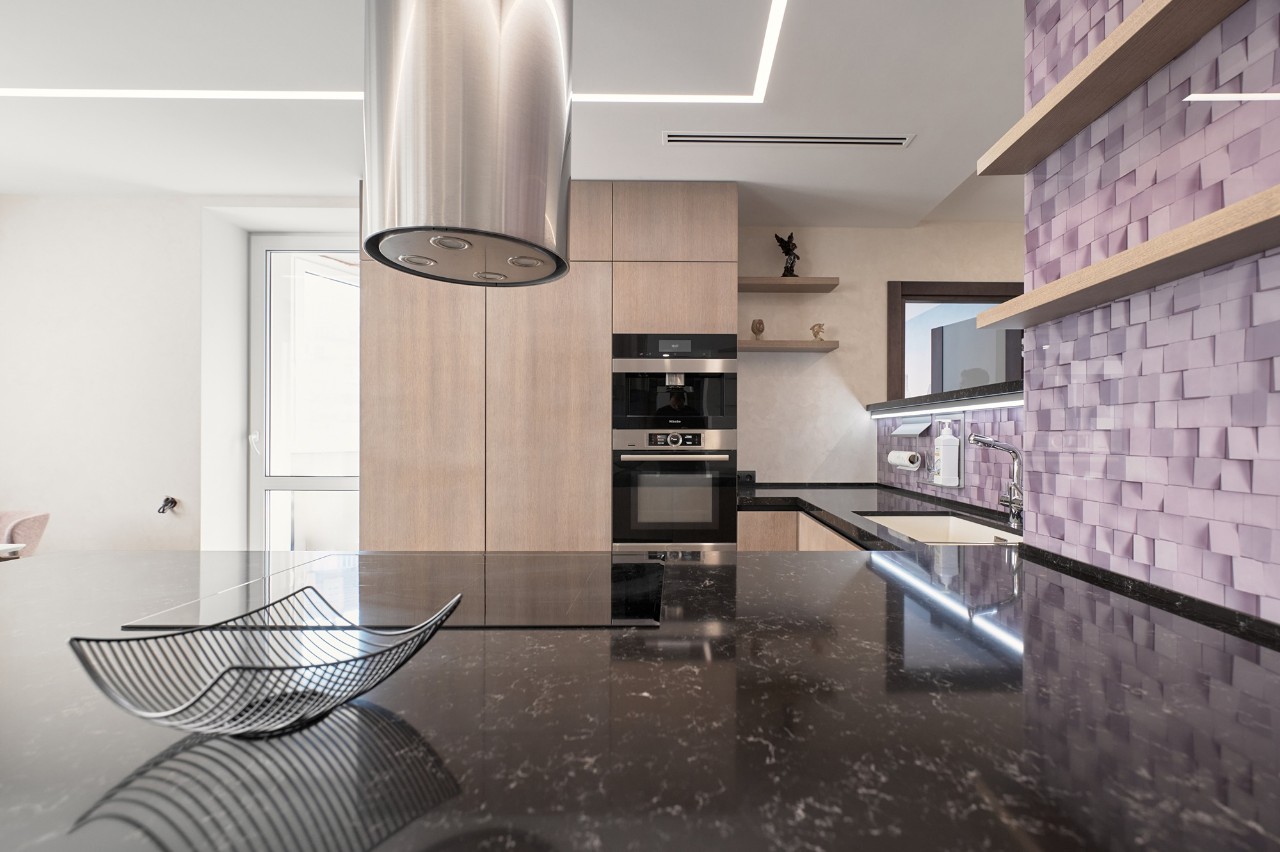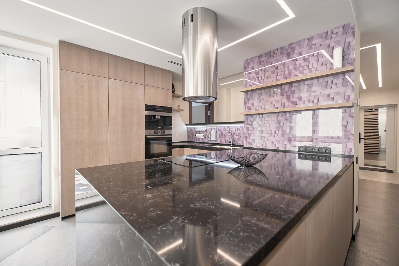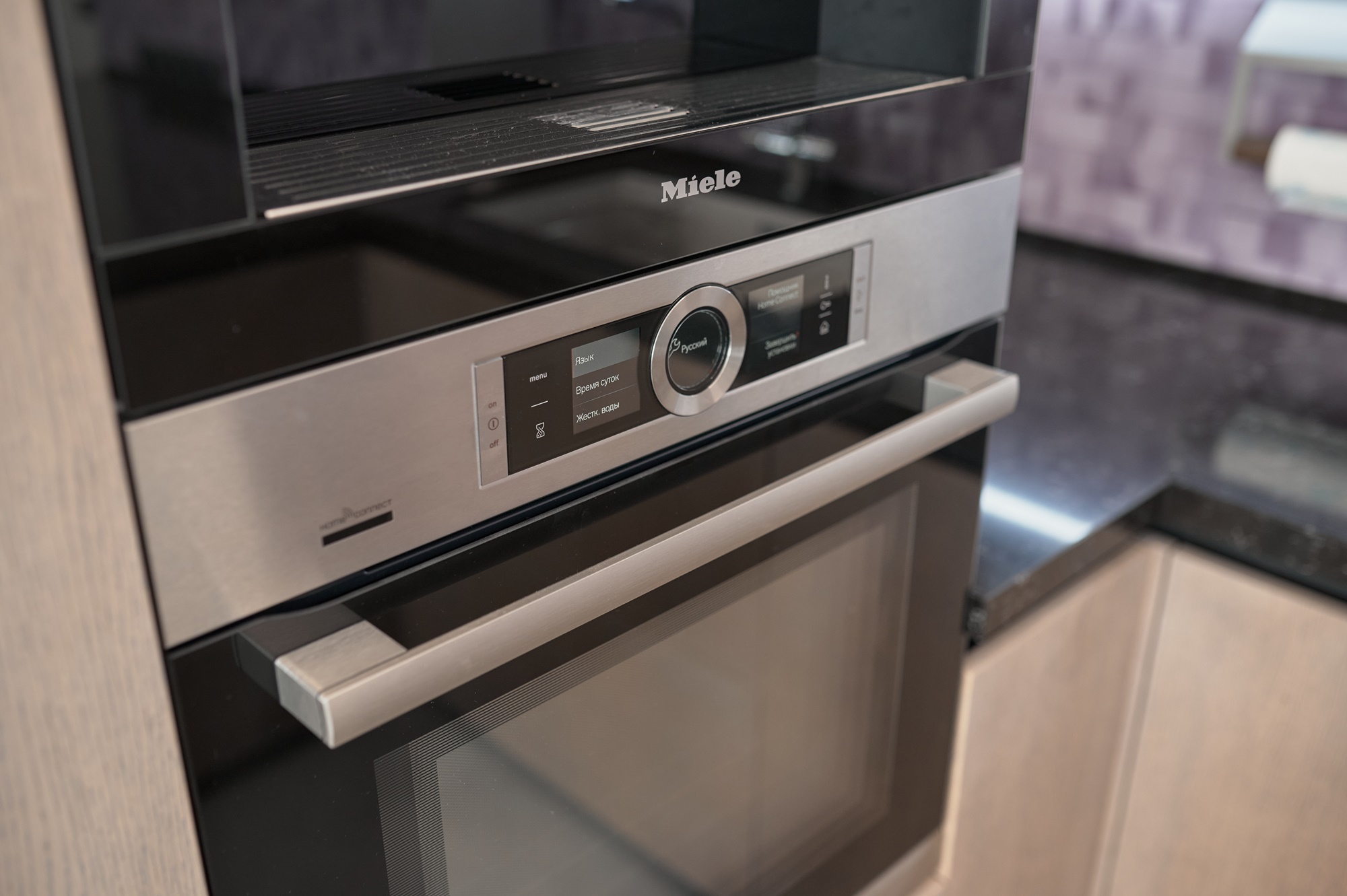Встроенная кухня из шпона, вся гарнитура Blum. Бытовая техника премиум класса. Индукционная варочная панель Bosh (6 конфорок), духовой шкаф Bosh c функцией СВЧ, посудомоечная машина Mile, встроенная кофемашина Бренда Mile, встроенный холодильник из акрила side by side "Liebherr", стиральная машина Mile. Столешница из кварцевого камня (производитель Belenco spa Black). Мойка бренда BLANCO. Телевизор Samsung .