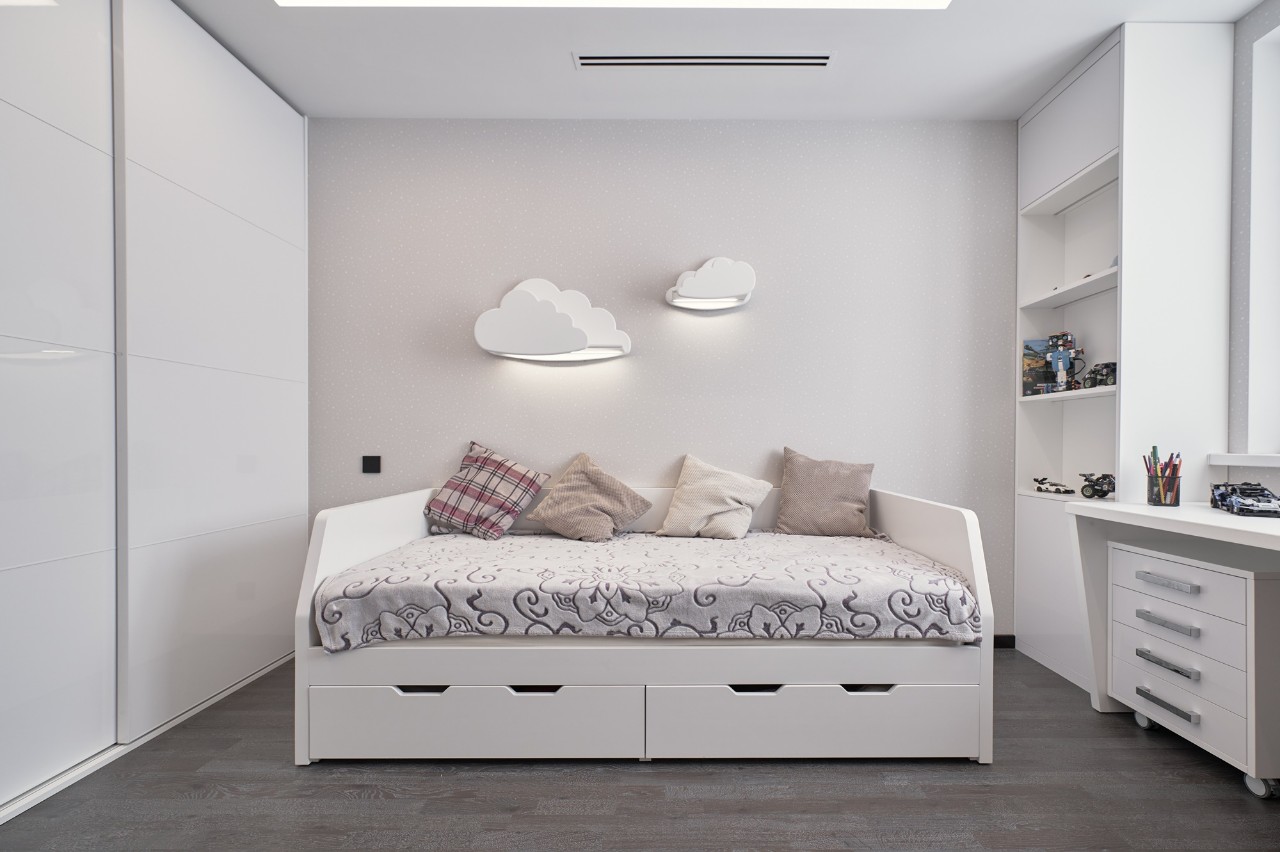 Мебель в спальне из массива с зеркалами. В детской шкаф из акрила, кровать и встроенные боковины мебели из массива ольхи.