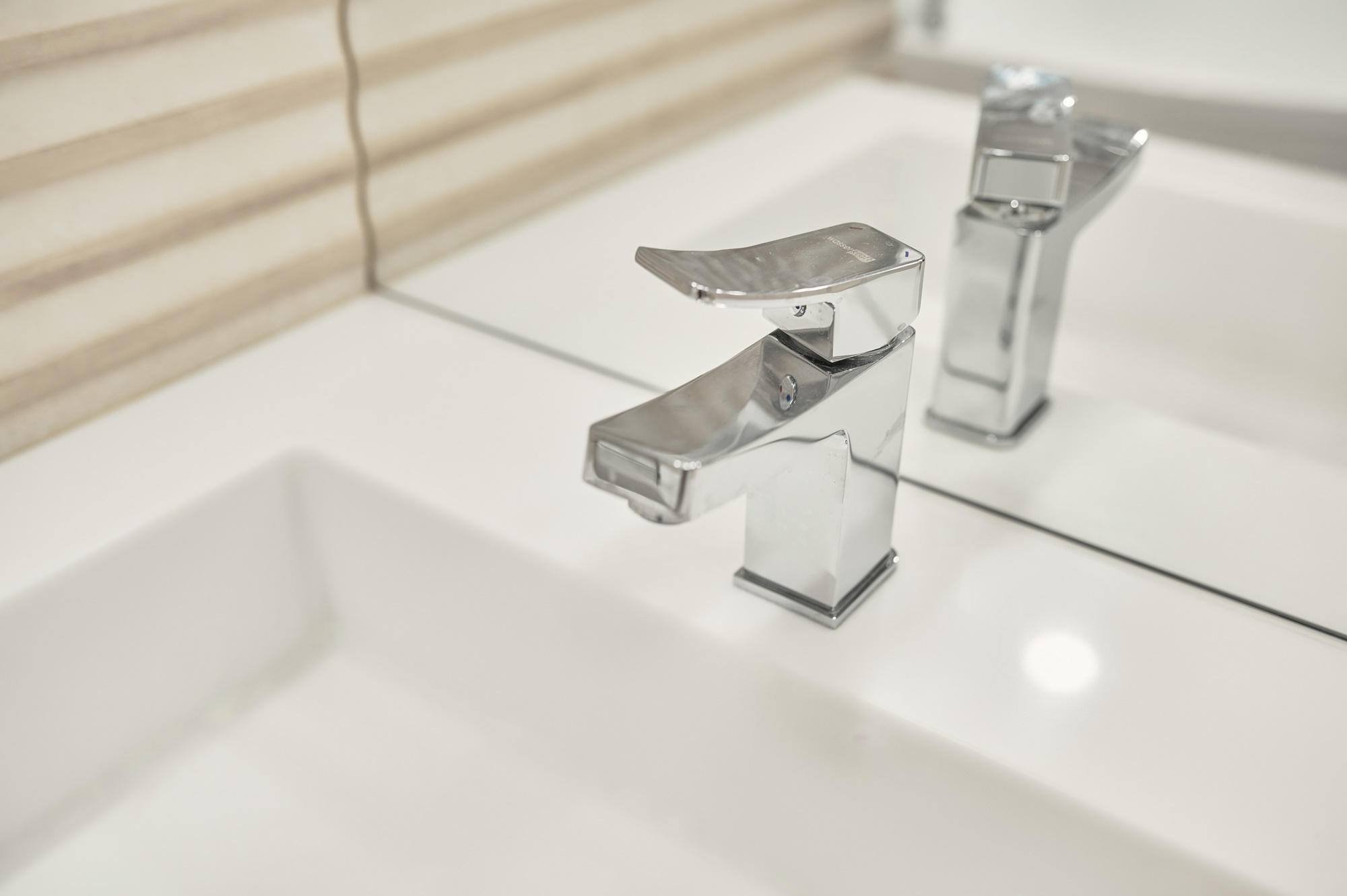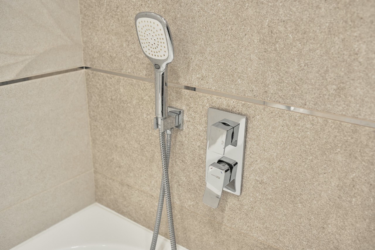 В санузлах вся сантехника Grohe. Угловая ванна Kolpasan, раковина из искусственного камня.