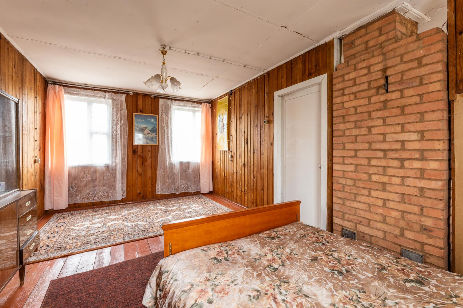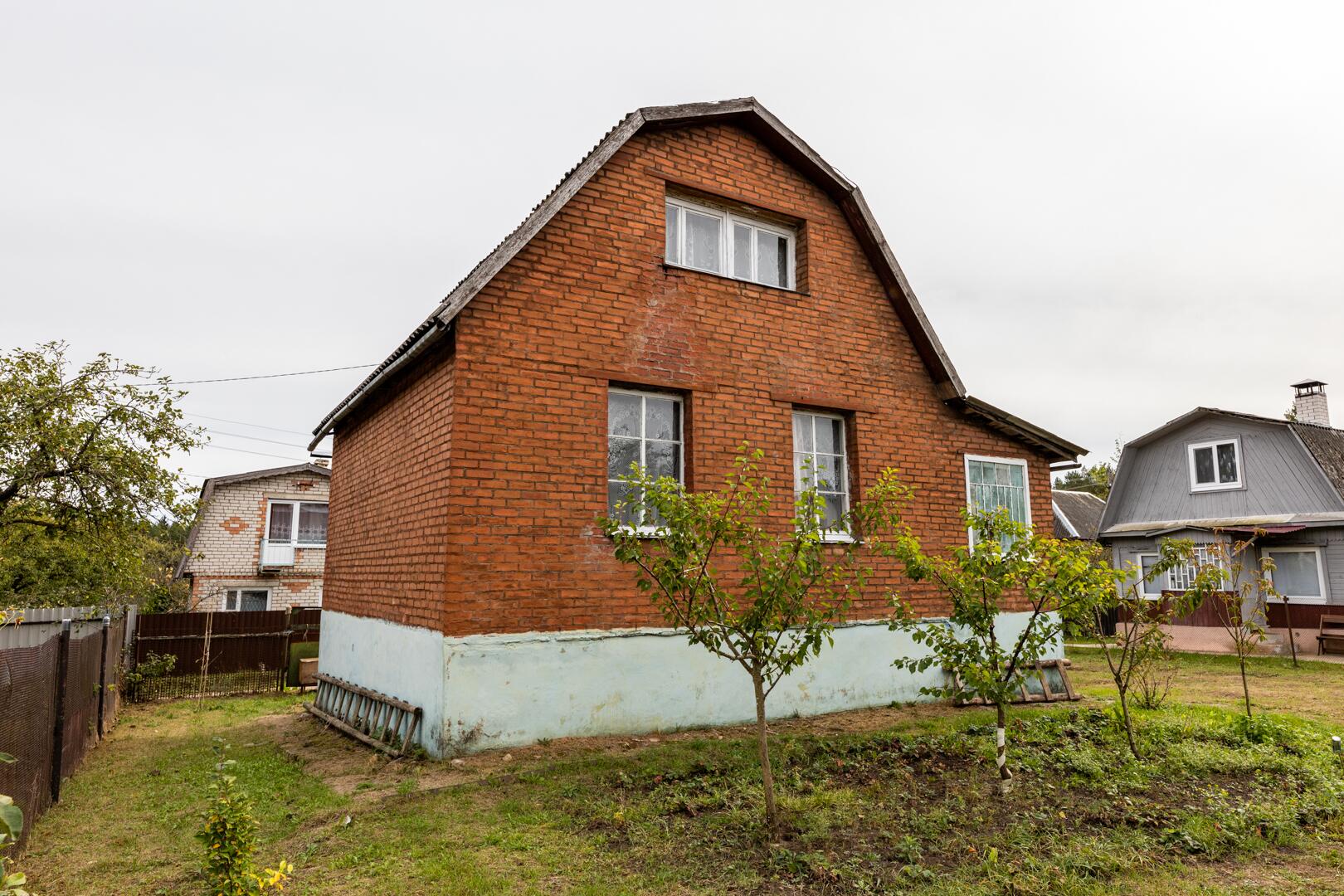Деревянный дом с тепло/влагоизоляцией обложен красным кирпичом.