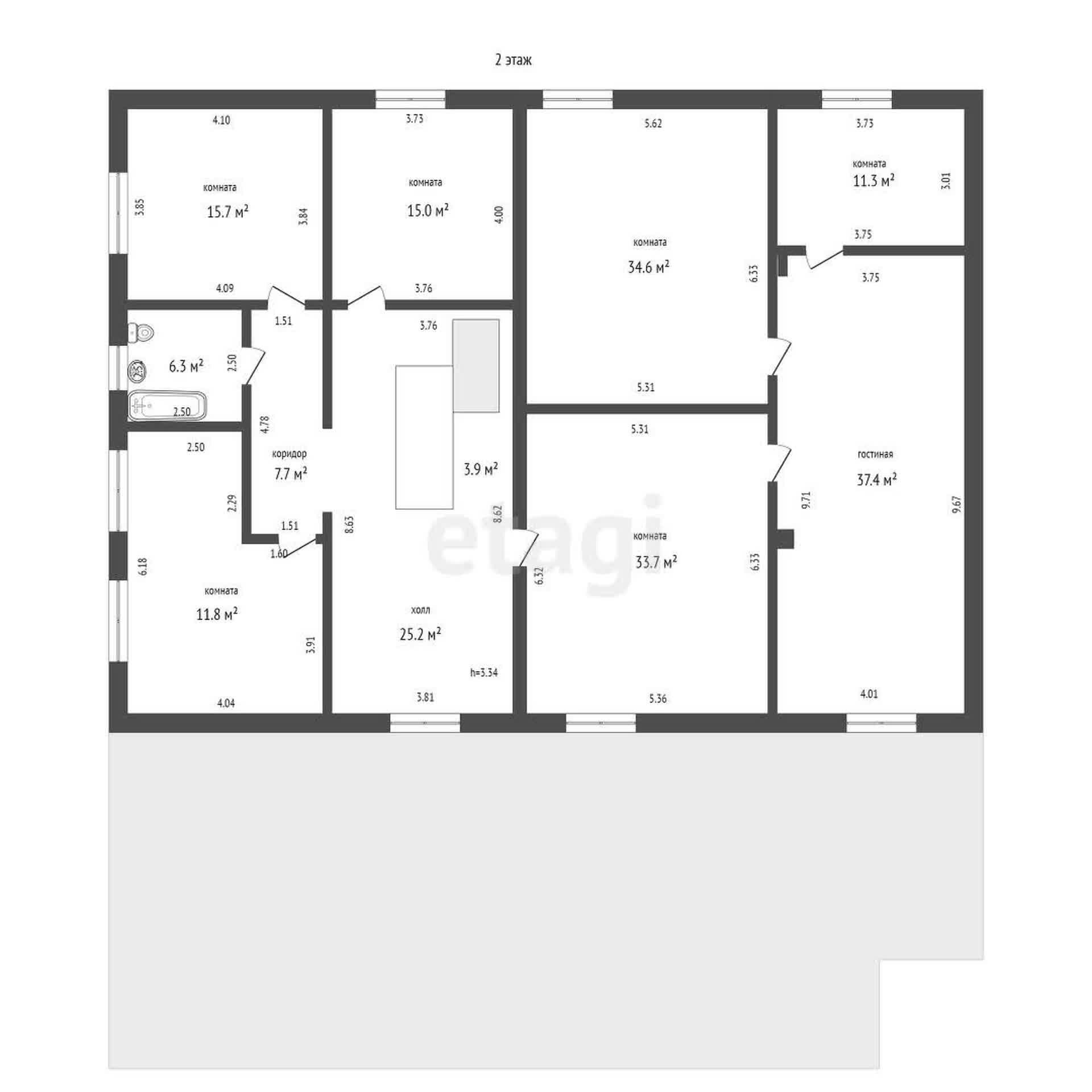 Второй этаж: 3 раздельные спальни (15.7 м2, 15 м2, 11.8 м2), совмещенный санузел 6.3 м2, холл 25.2 м2