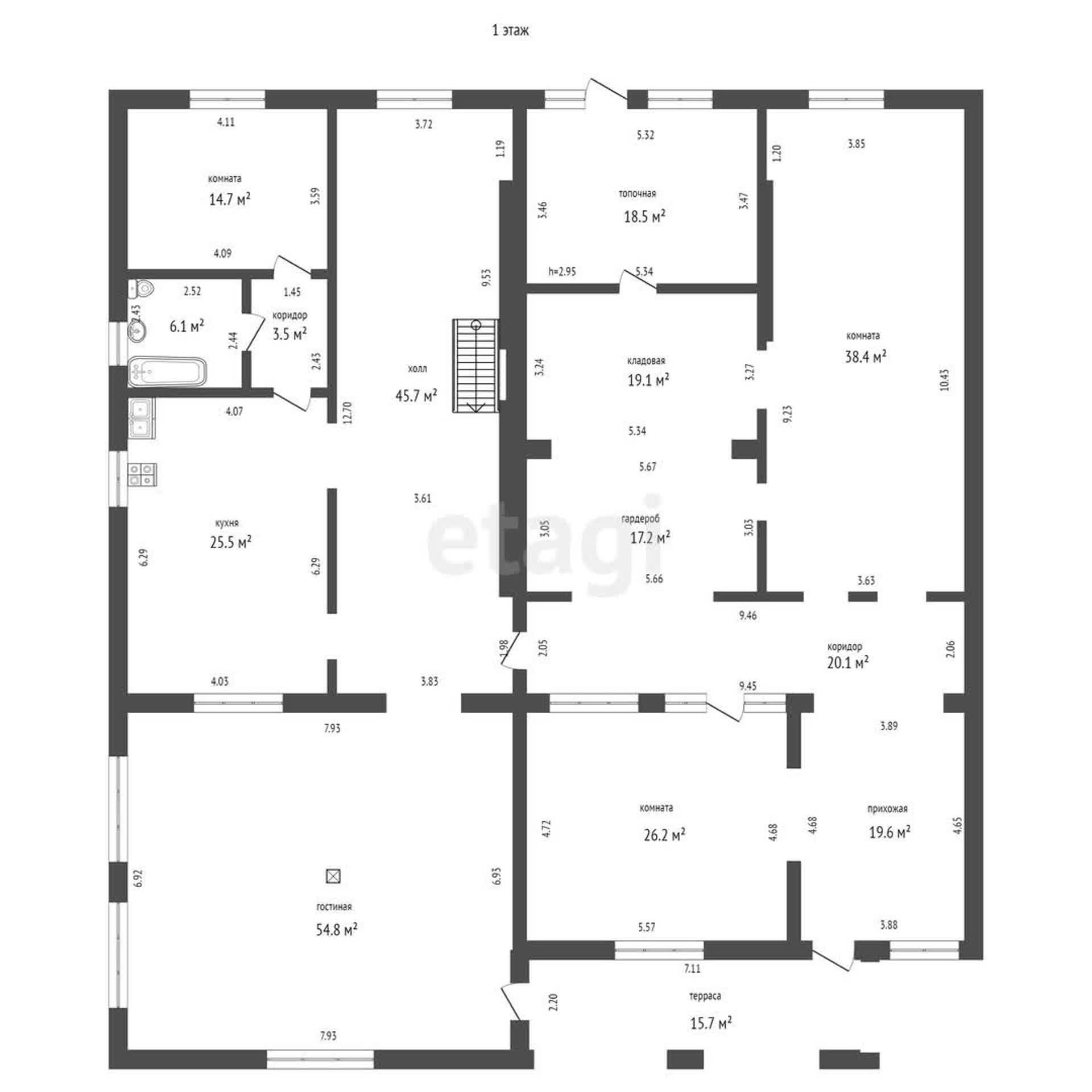 Первый этаж: гостиная с камином 54.8 м2, кухня 25.5 м2, жилая комната 14.7 м2, совмещенный санузел 6.1 м2, просторный холл 45.7 м2