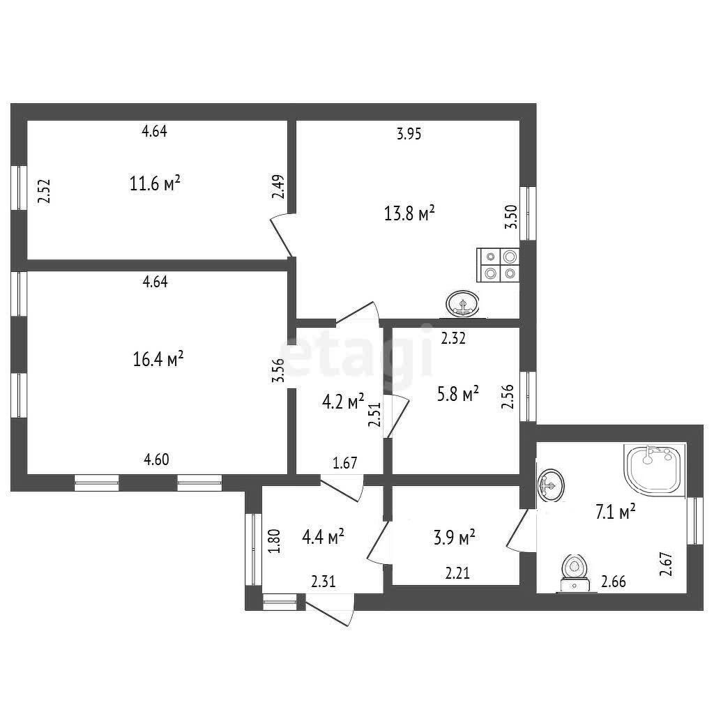 - 2 спальные комнаты 11.6 м2 и 16.4 м2;