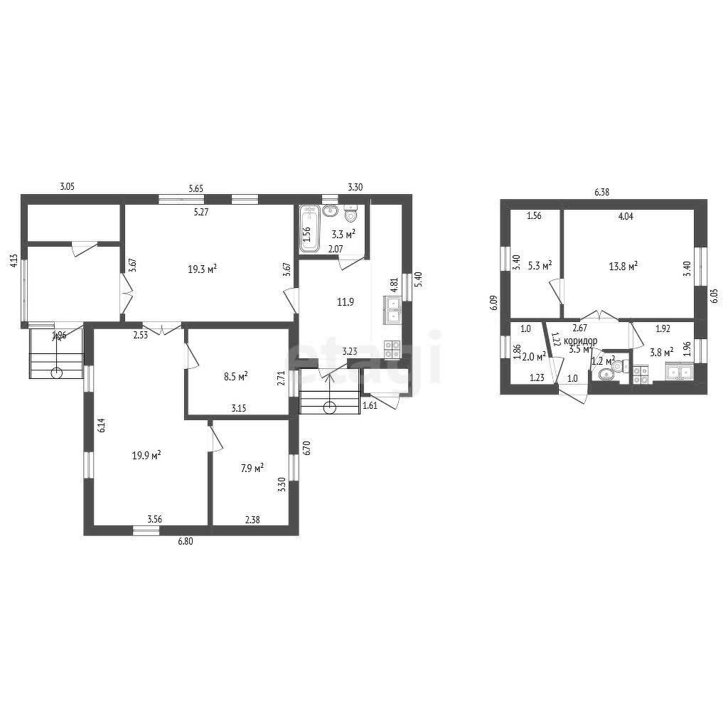1 дом деревянный, обложен кирпичом, состоит из: веранды, кухни 11,9 м2, 4 комнат (19,3 м2,19,9 м2, 7,9 м2, 8,5 м2),топочной. 2 комнаты отдельные, 2 проходные.