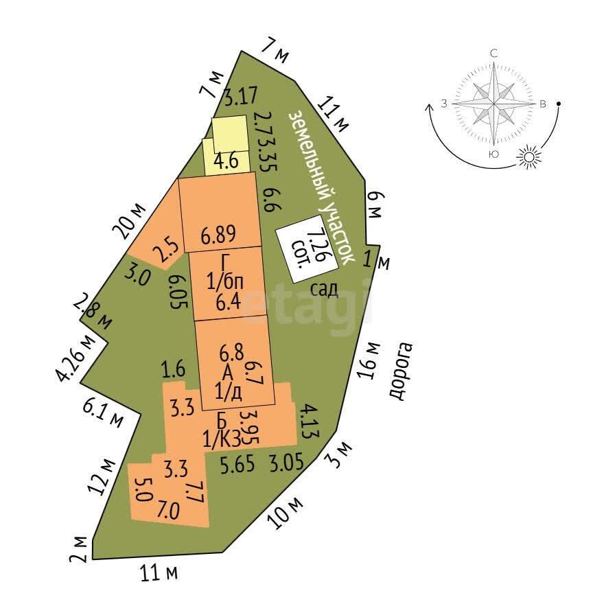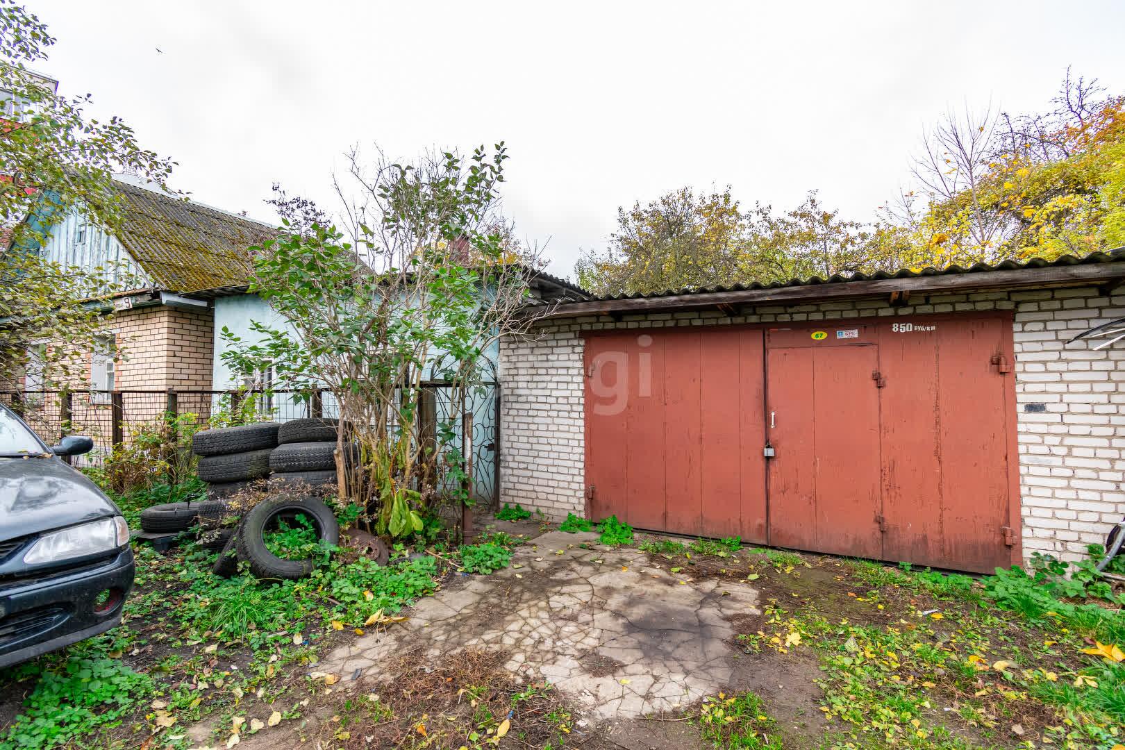 Земельный участок вокруг дома составляет 7,26 соток, под огород не используется. Огорожен забором со всех сторон. Находится в пожизненном наследуемом владении. Из насаждений есть груши, яблони. На участке расположены: кирпичный гараж на 2 машины, сарай, теплица.