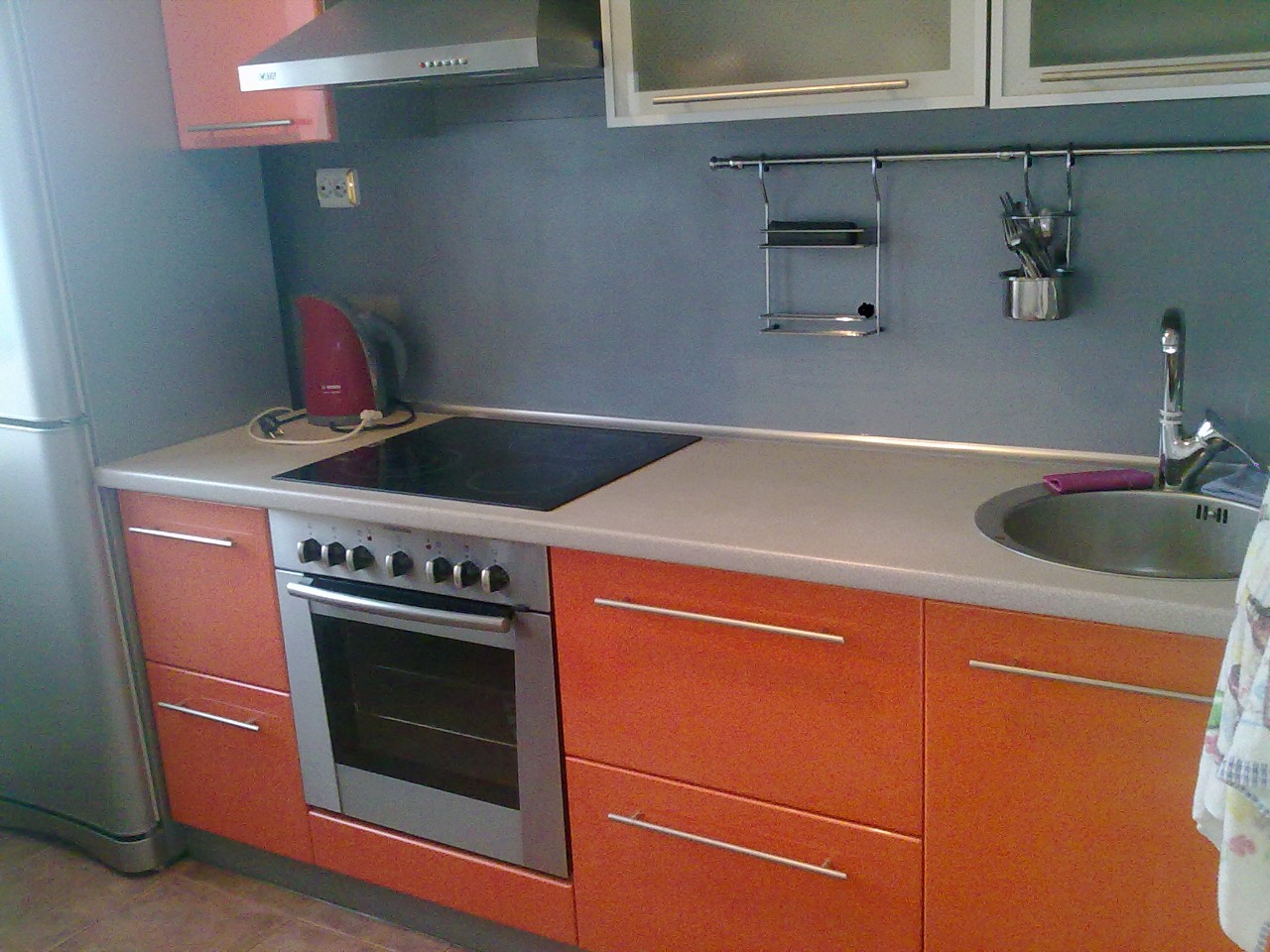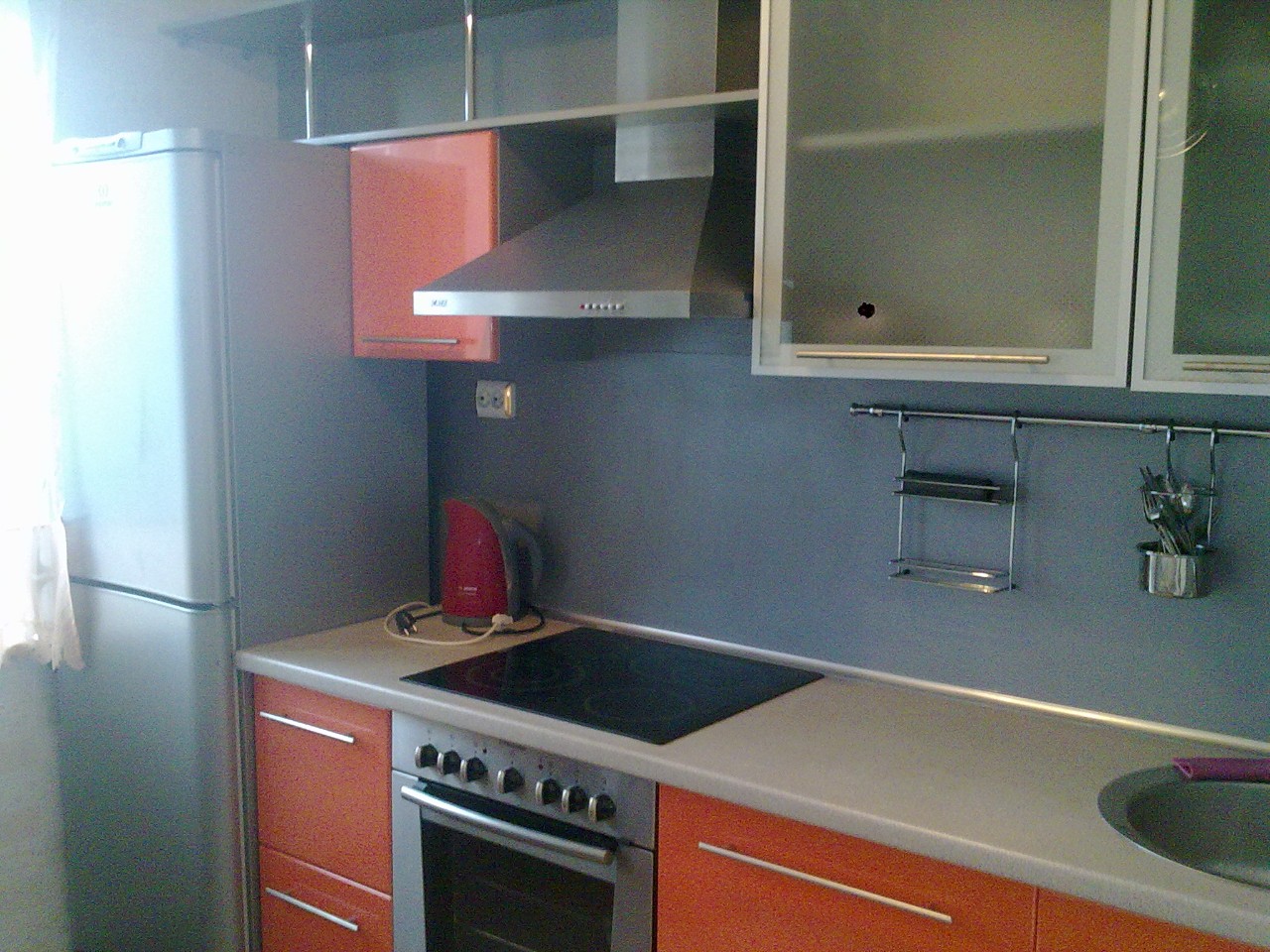 Кухня встроенная с метобоксами, большой холодильник, стеклянная варочная панель, духовка,