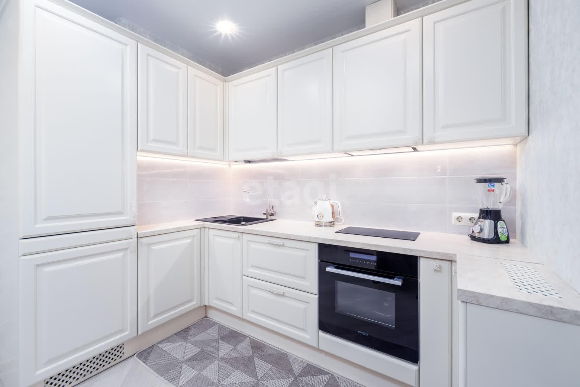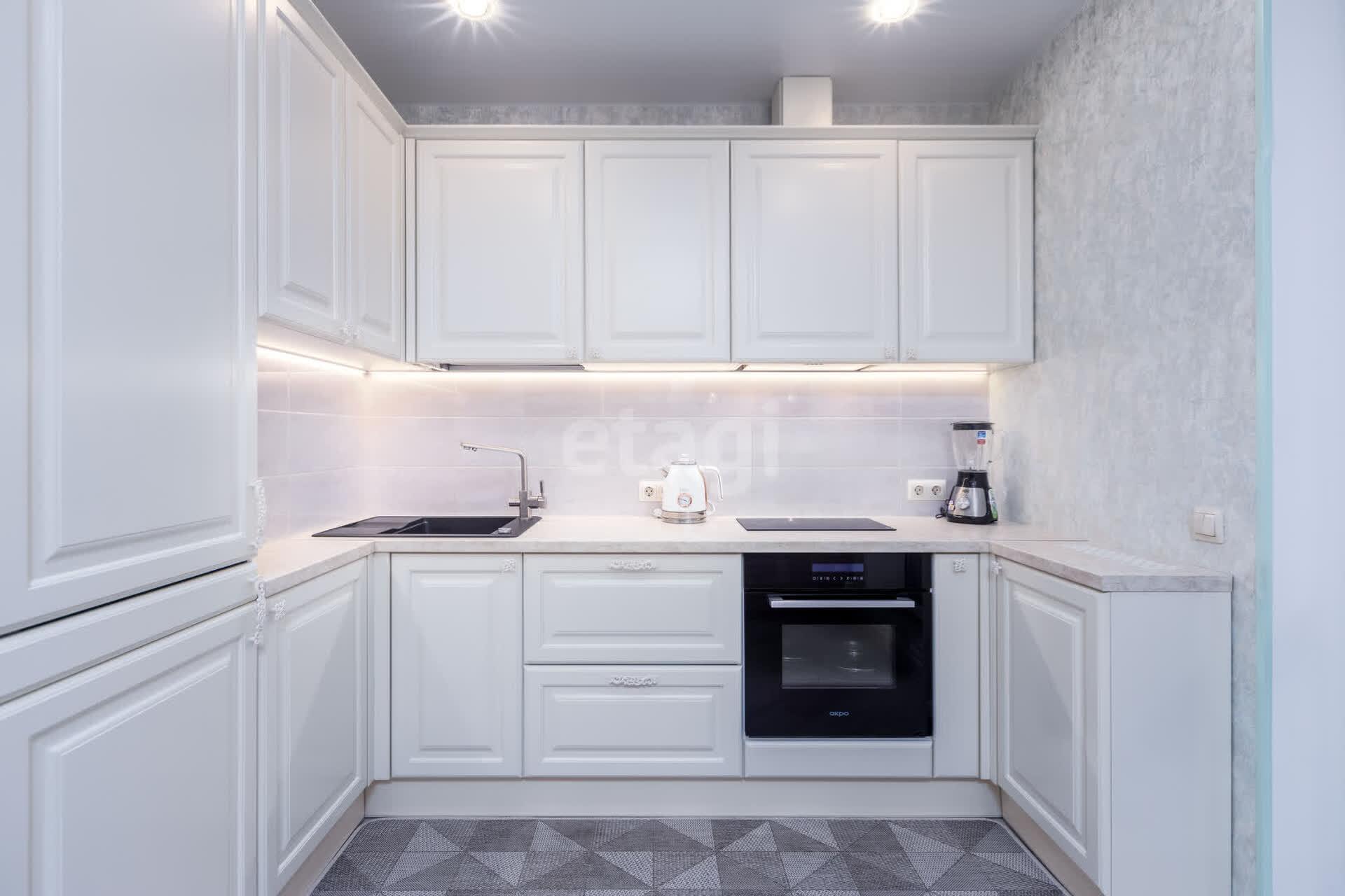 - Кухня с встроенной бытовой техникой: холодильник, варочная панель, духовой шкаф.