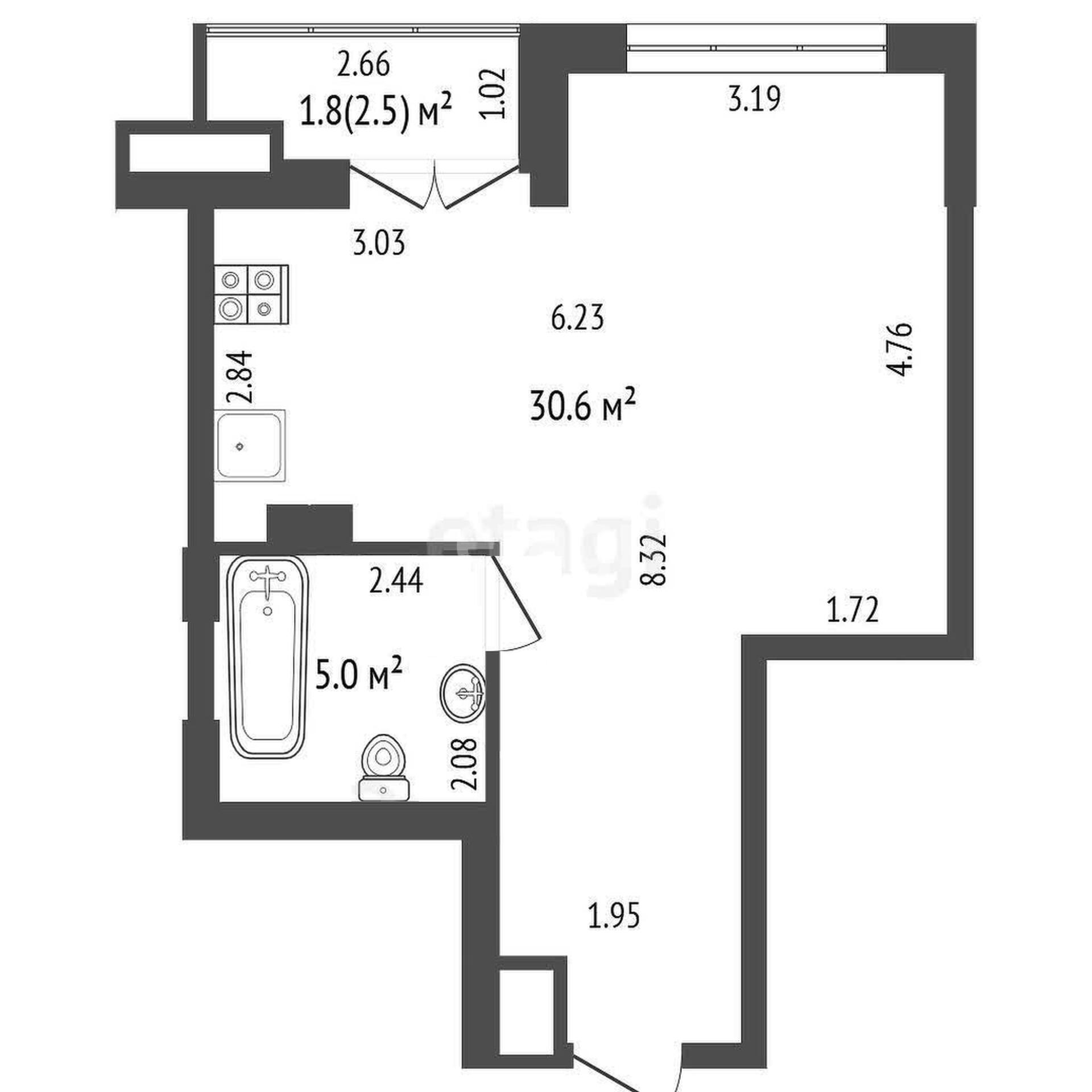- Студия на 3 этаже 14-этажного дома, общая площадь 37,4 м2 (жилая 30,6 м2), потолки 2,7 м.