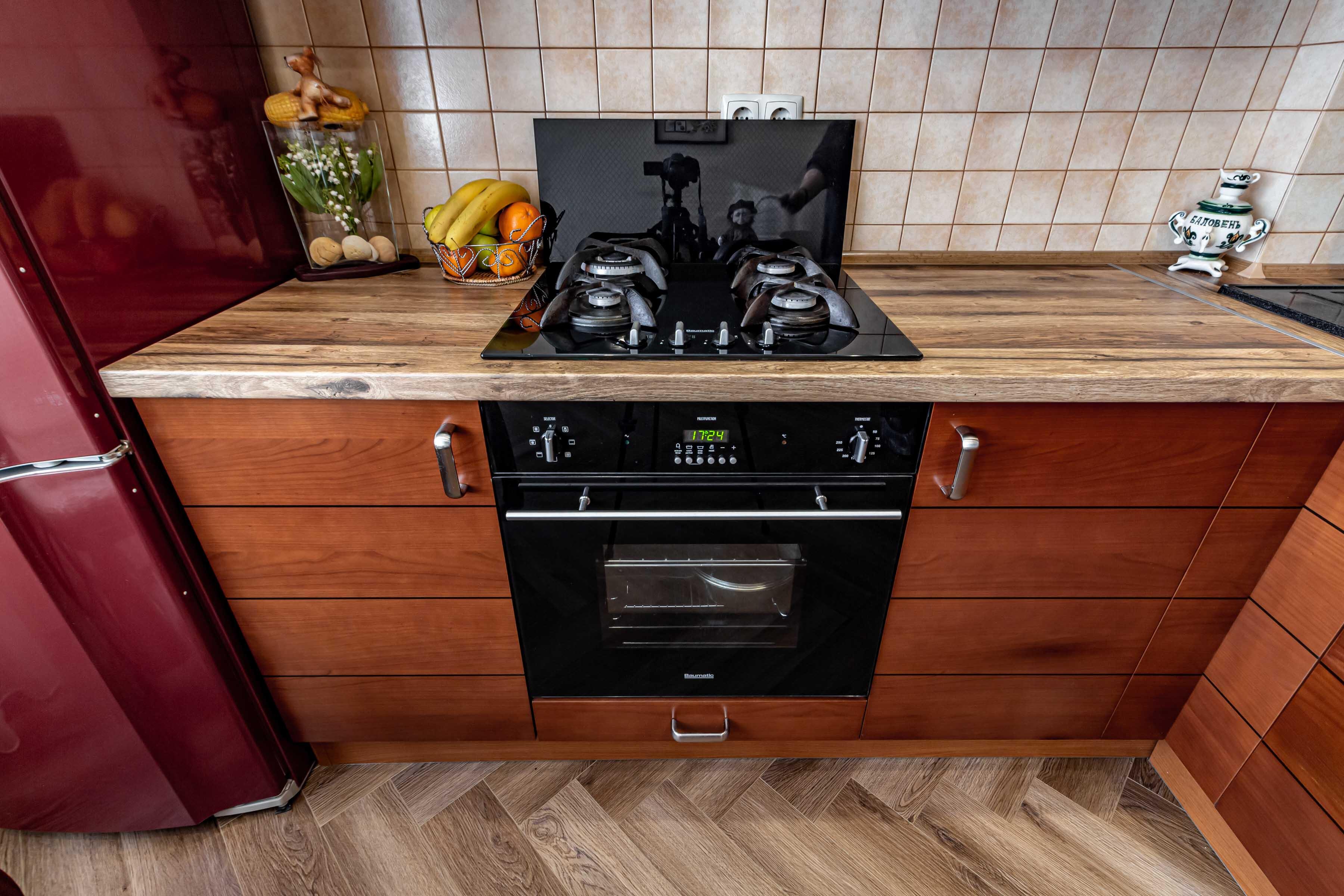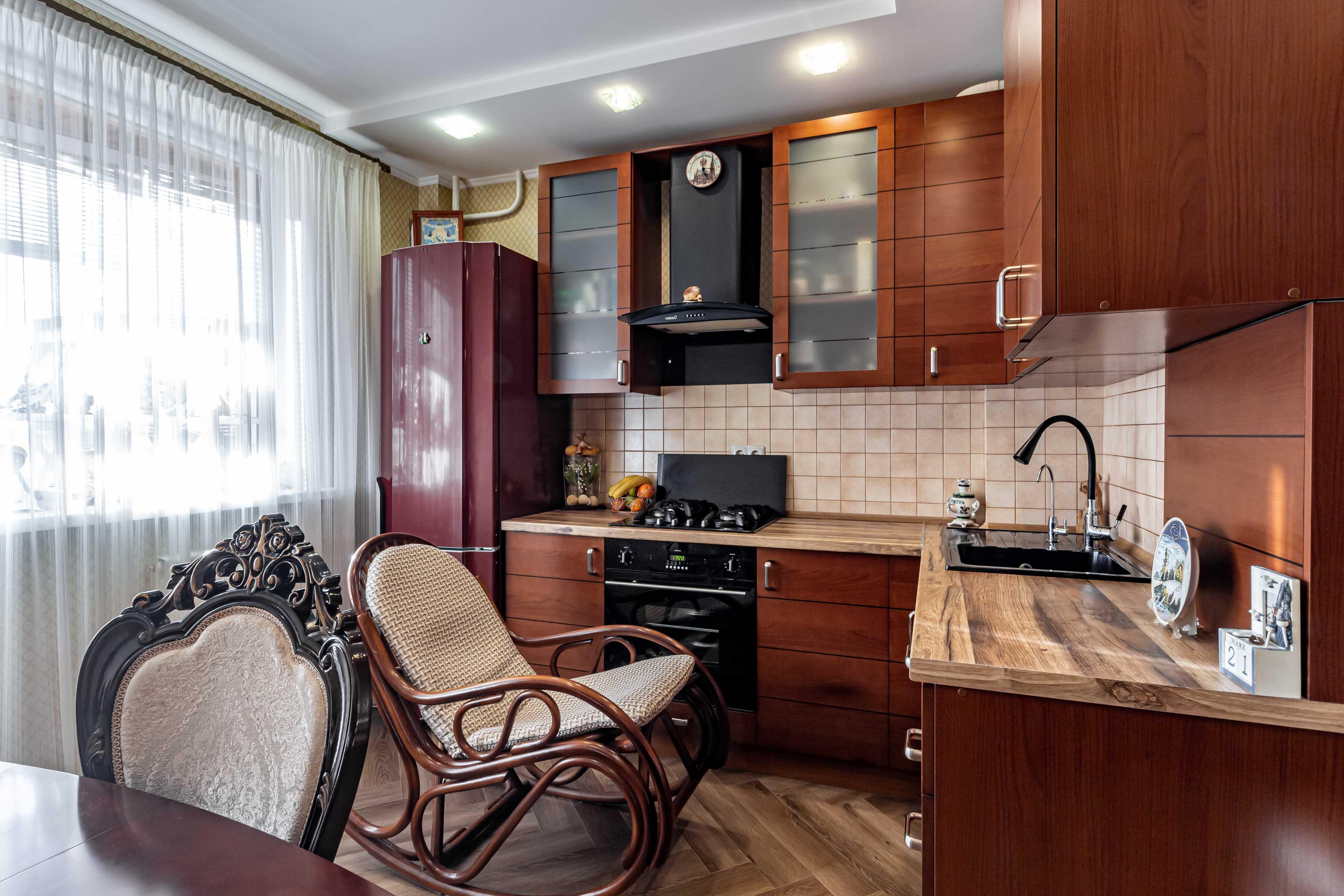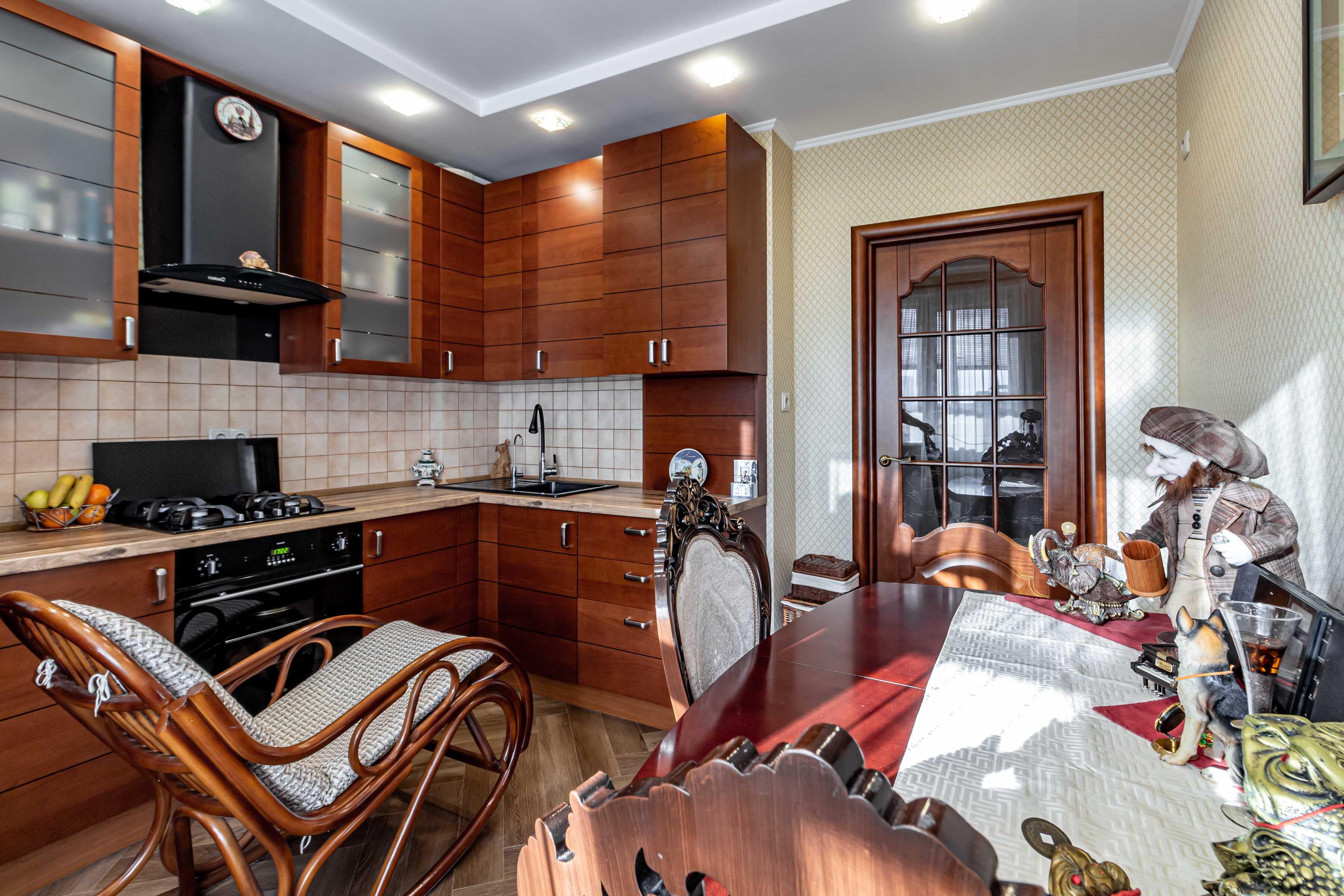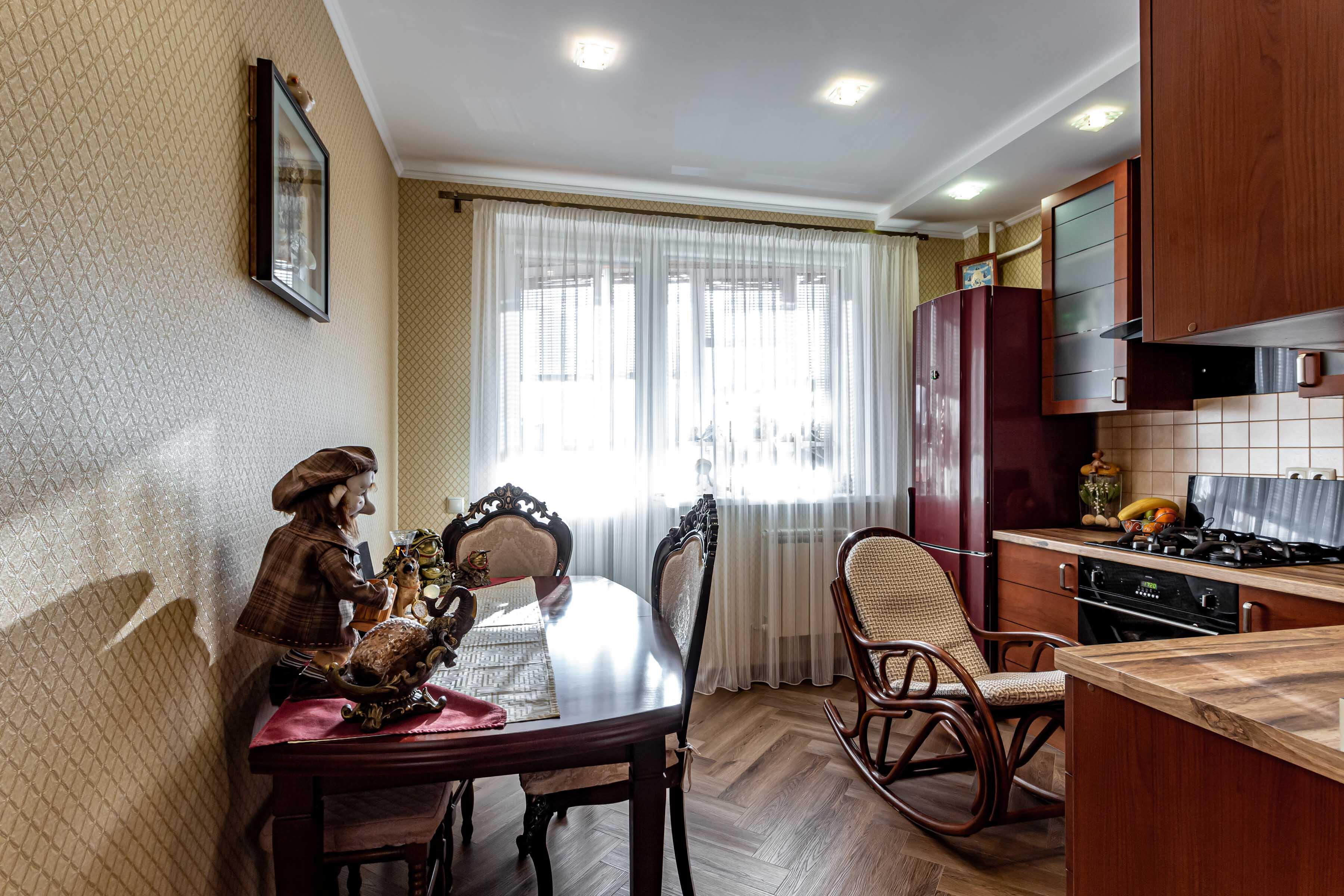 Большая кухня 10,4 м2, со всей необходимой кухонной техникой и мебелю, с выходом на утепленный балкон.