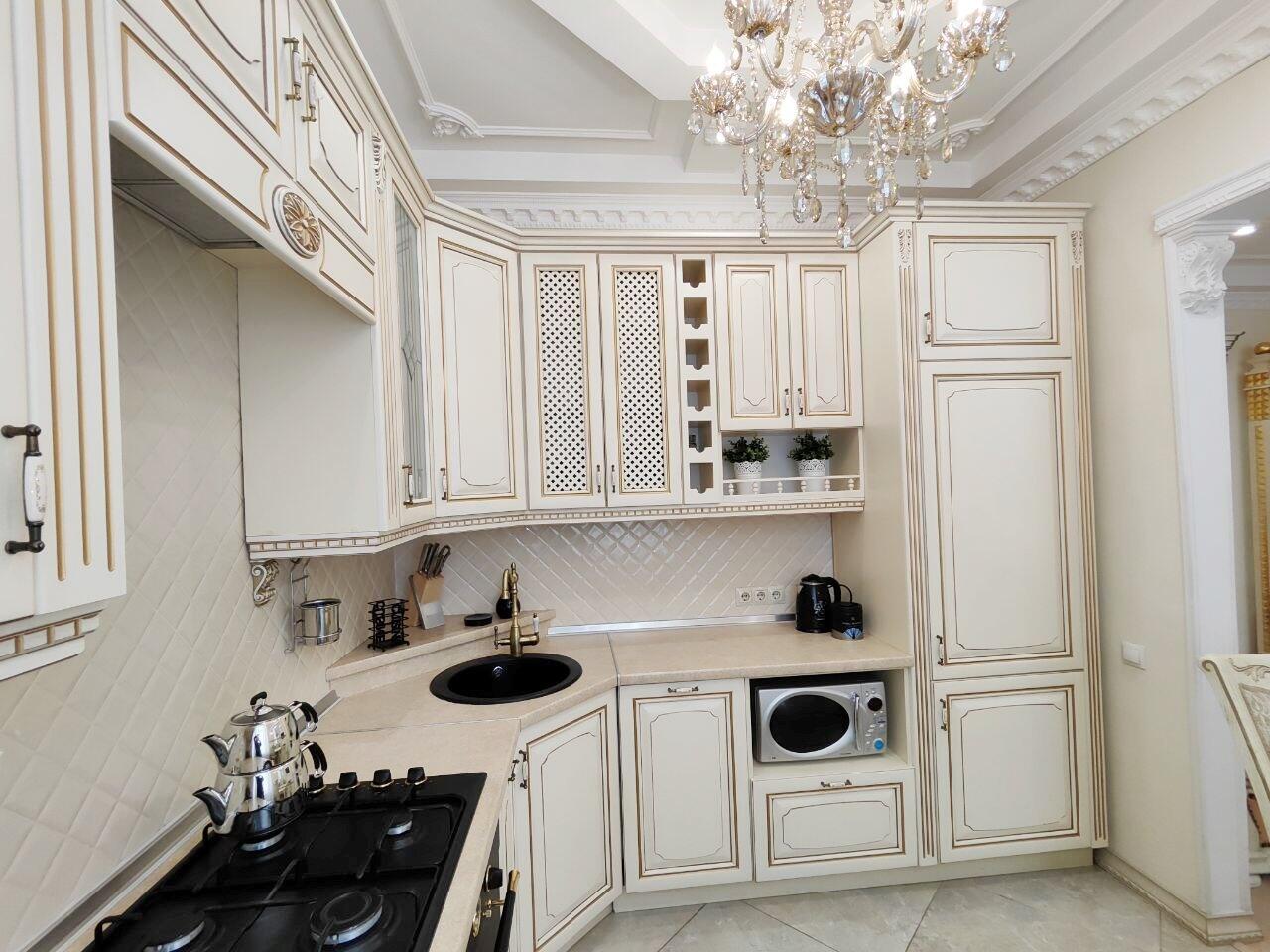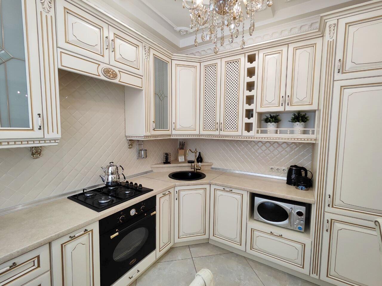 Полностью оборудованная встроенная кухня из массива со встроенной бытовой техникой: варочная панель - газовая, духовой шкаф - электрический, мойка-камень.