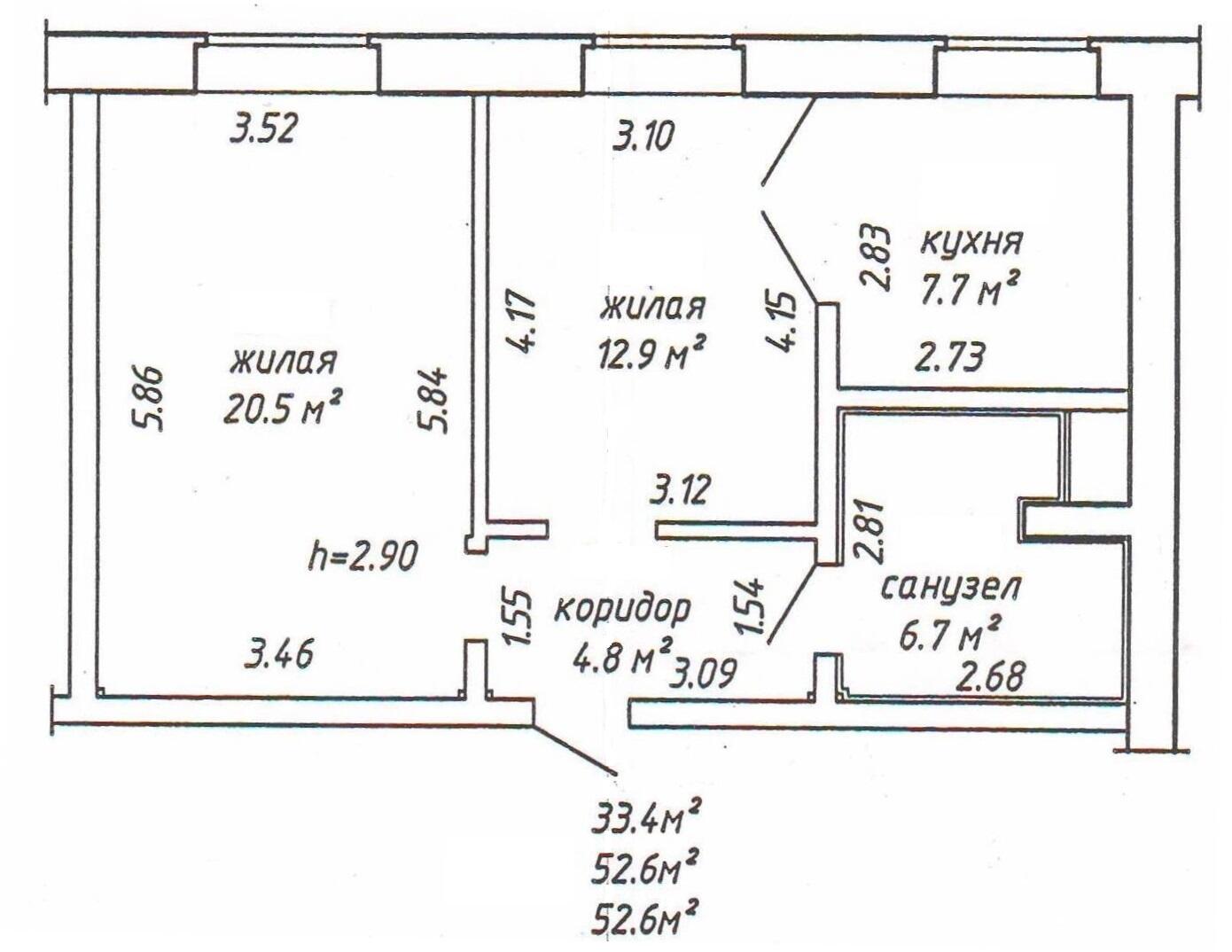 Общая площадь квартиры 52,6 кв. м., жилая площадь-33,4 кв. м., кухня – 7,7 кв. м
