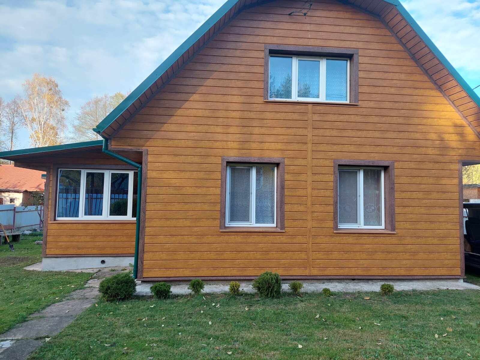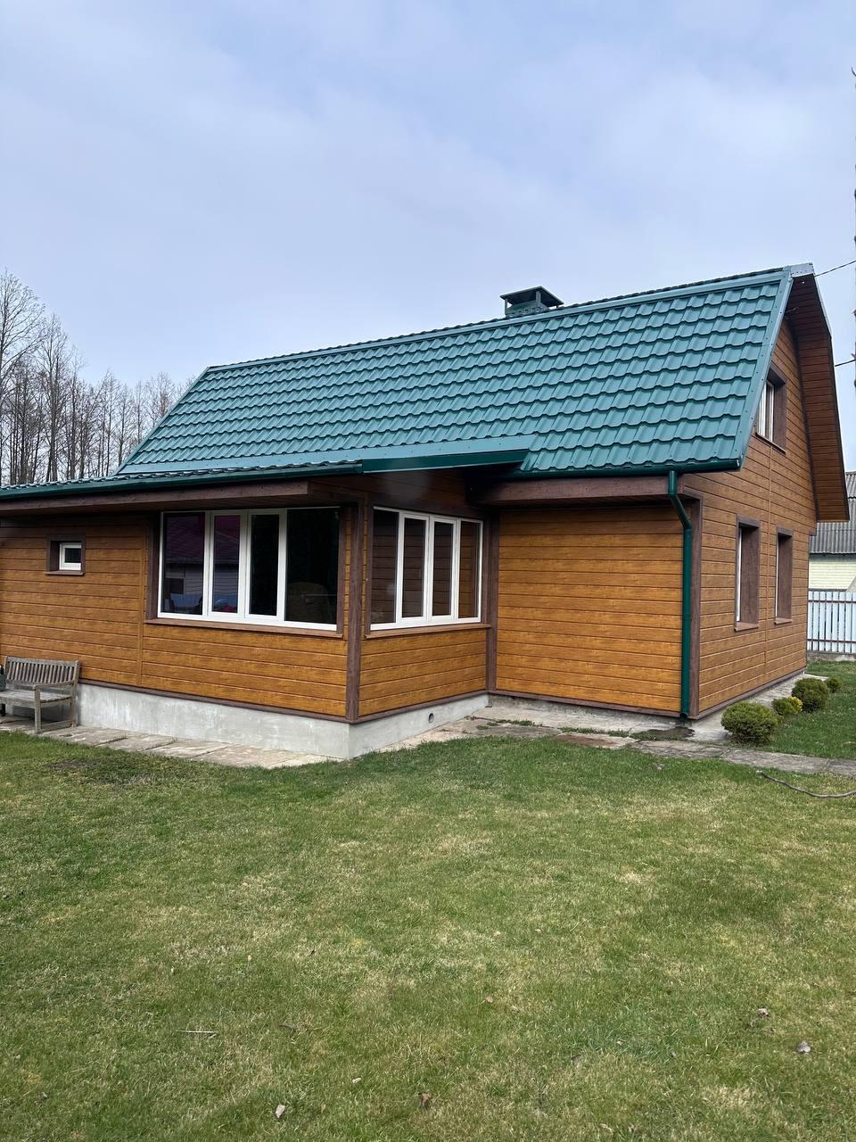 - Теплый и экологичный: брус обложен кирпичом и облицован металлопрофилем.