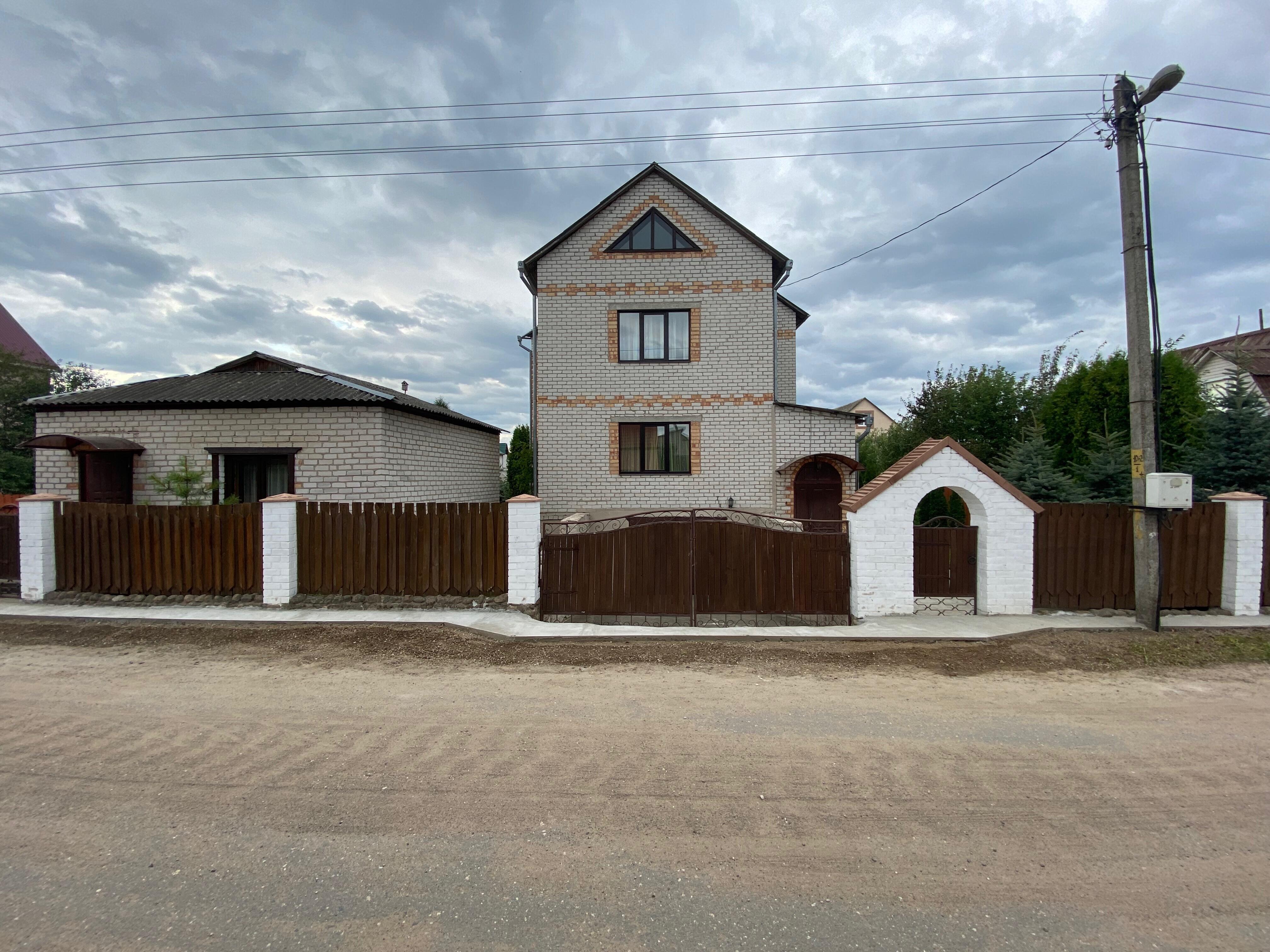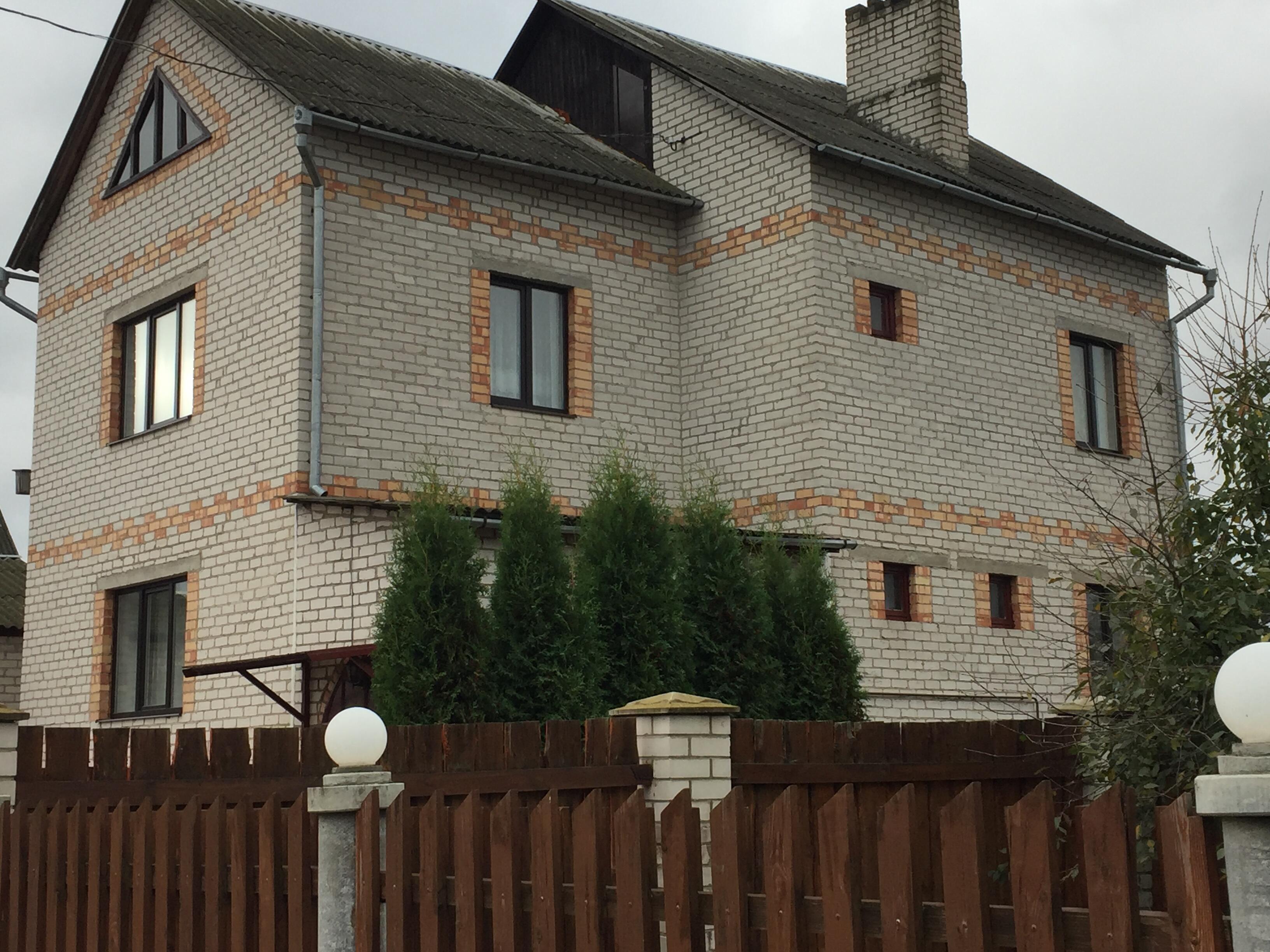 х на участке 9,26 соток распложен в коттеджной застройке г. Сморгонь (городская черта) по ул. Ф. Скорины, 23. Площадь дома 197 кв. м. + отдельное строение на участке под магазин (нежилой фонд) - 45 кв. м. Газовое отопление, а также имеется котел на твердом топливе, центральный водопровод, канализация, электричество, телефон. Благоустроенная территория, уложена тротуарная плитка, бетонные дорожки. Дом со всеми удобствами, добротный, сухой, имеется 2 входа (центральный и задний). Забор деревянный, ворота и калитки дубовые, ковка. Деревянная винтовая лестница от цокольного до 3-его этажа.
