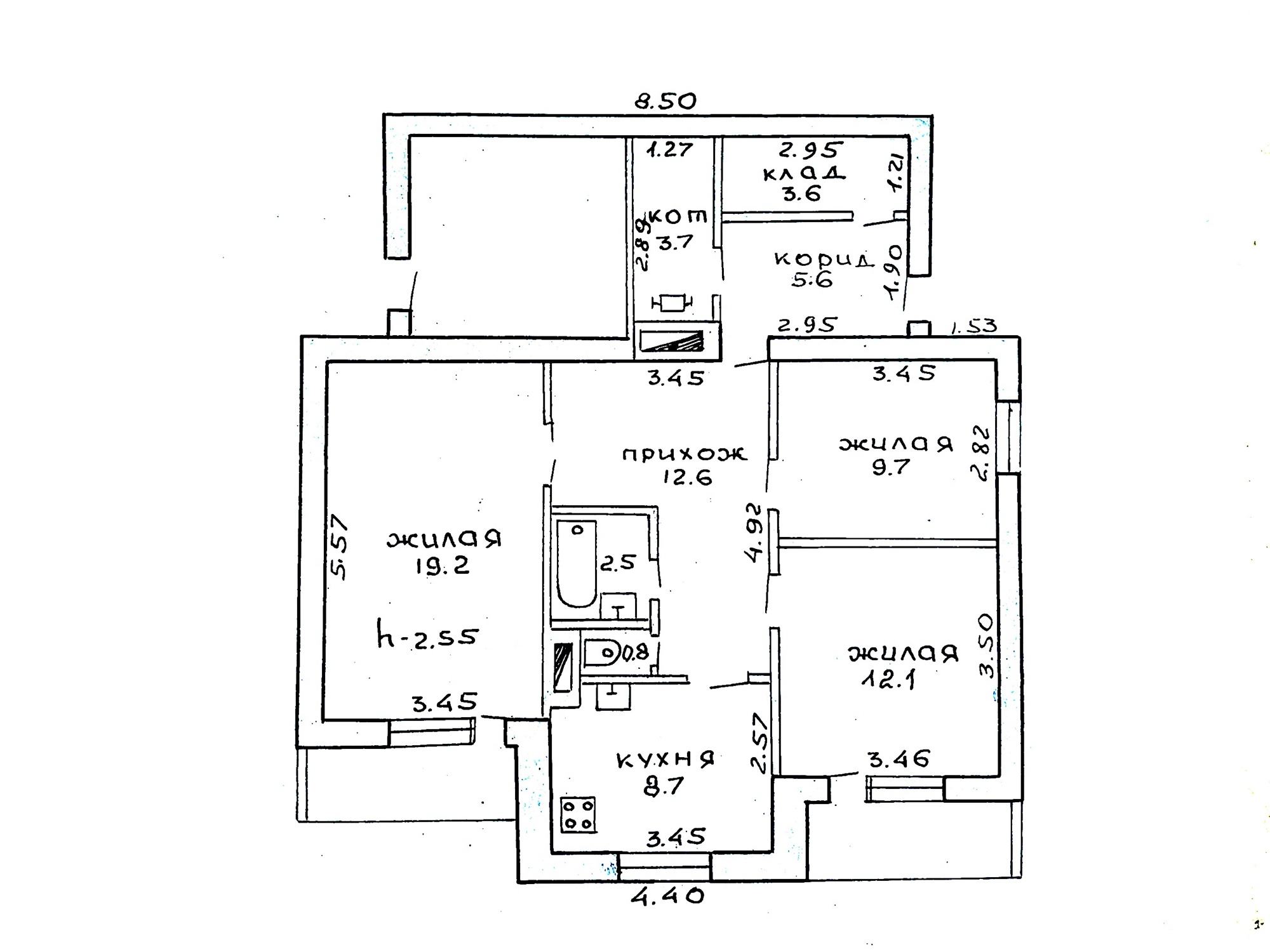 Общая площадь составляет 78.5м2, жилая состоит из трех изолированных комнат 41.1м2, просторная кухня 8.7м2, высота потолков 2.55м, санузел раздельный, 2 балкона.