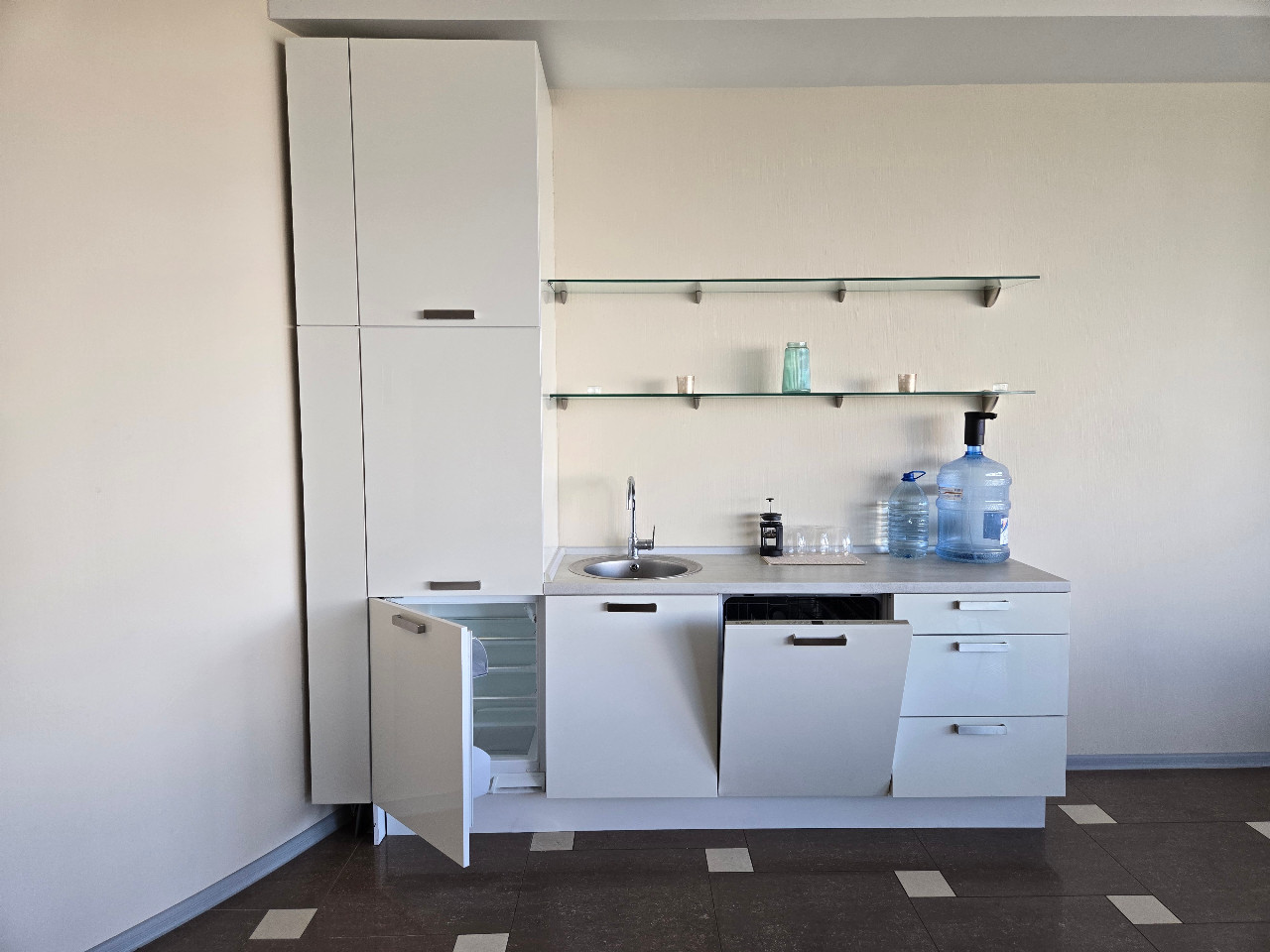 Кухня с посудомойкой и холодильником