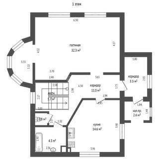 1 этаж. Перекрытия бетонные. Огромная светлая гостиная 32.2 кв.м2 Кухня 14.6 кв.м2. Туалет. Ванная.