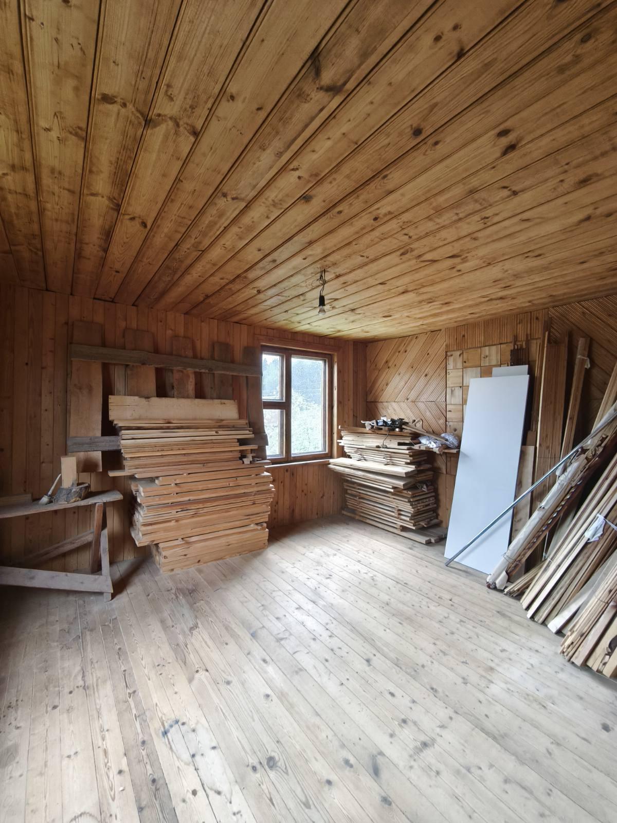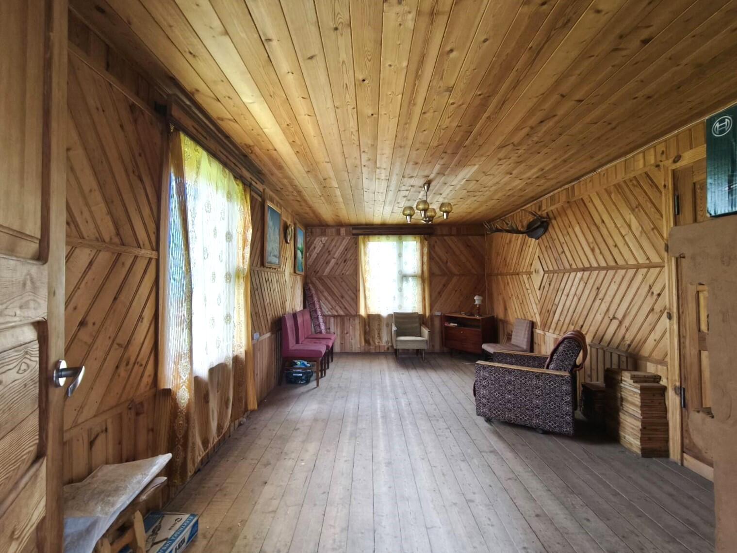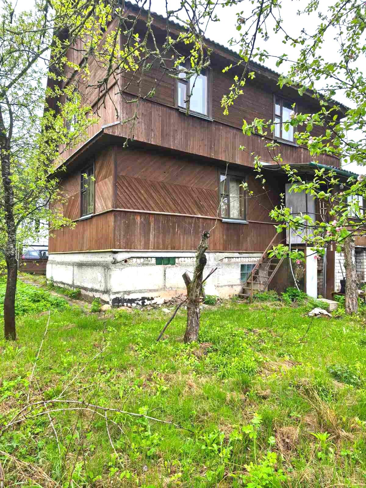 Дом 1990 года постройки, рубленый сруб, 3 уровня. Фундамент – блоки ФБС. Под домом по всему периметру цокольный этаж - используется как гараж и хоз блок. А также есть большой погреб для хранения овощей. Погреб сухой, ничего не подтекает и не топит. Между цоколем и первым этажом – плиты перекрытия. Полы в доме – доска, натуральное дерево. Дом внутри и снаружи обшит вагонкой и покрыт лаком.