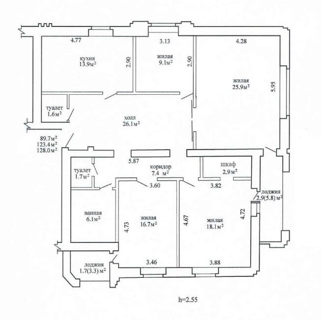· Площадь по СНБ 128,0 м.кв., общая – 123,4 м.кв., жилая – 89,7 м.кв.