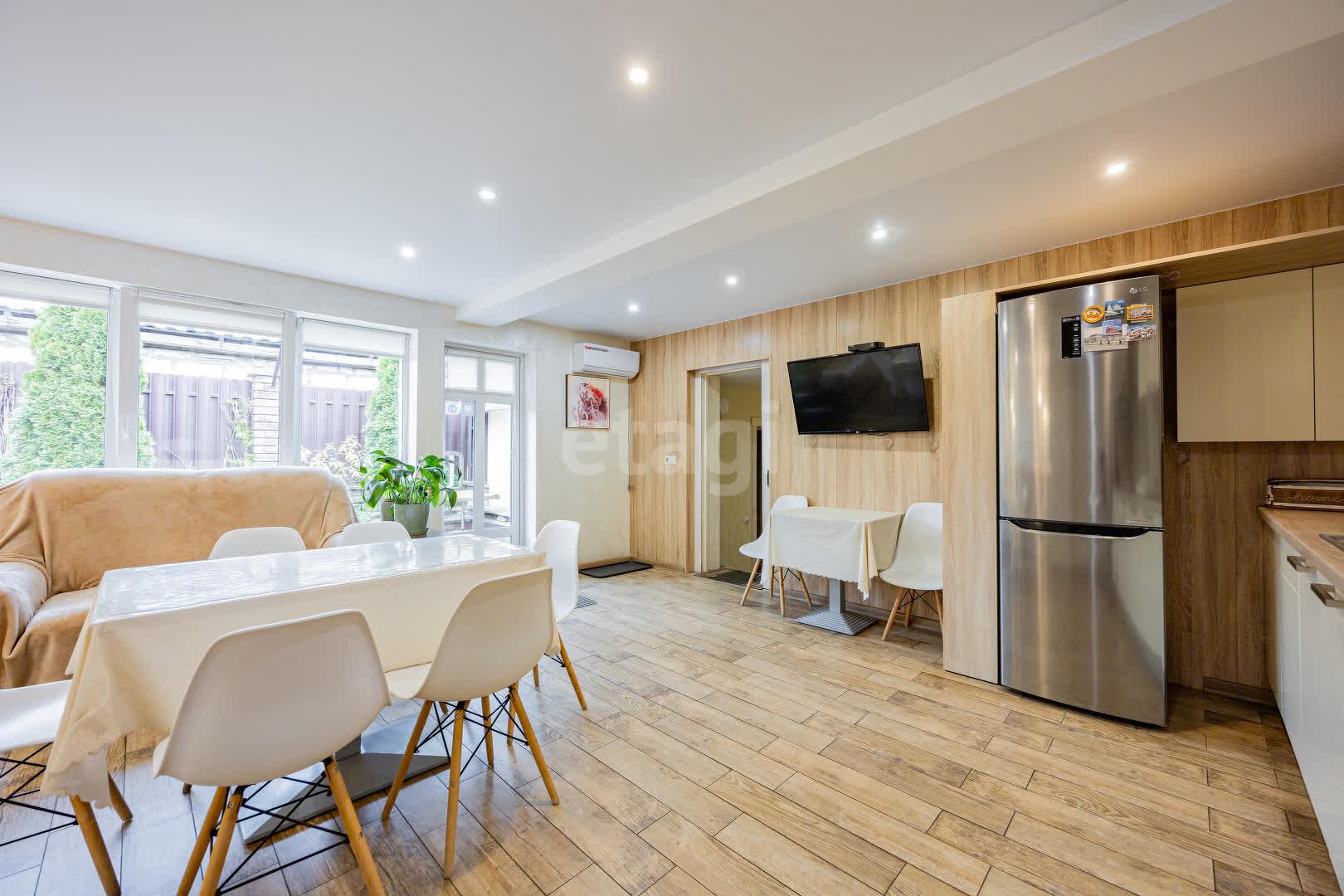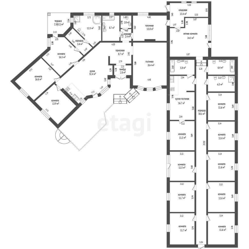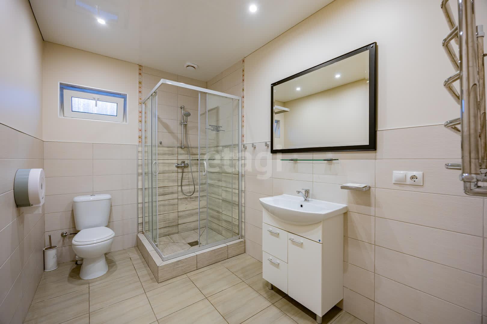Гостевой дом представлен 10 номерами, большой кухней площадью 40 м2 с высококлассным гарнитуром, бытовой техникой и просторной столовой зоной, двумя совмещёнными санузлами c новой и качественной сантехникой, застеклёнными душевыми.