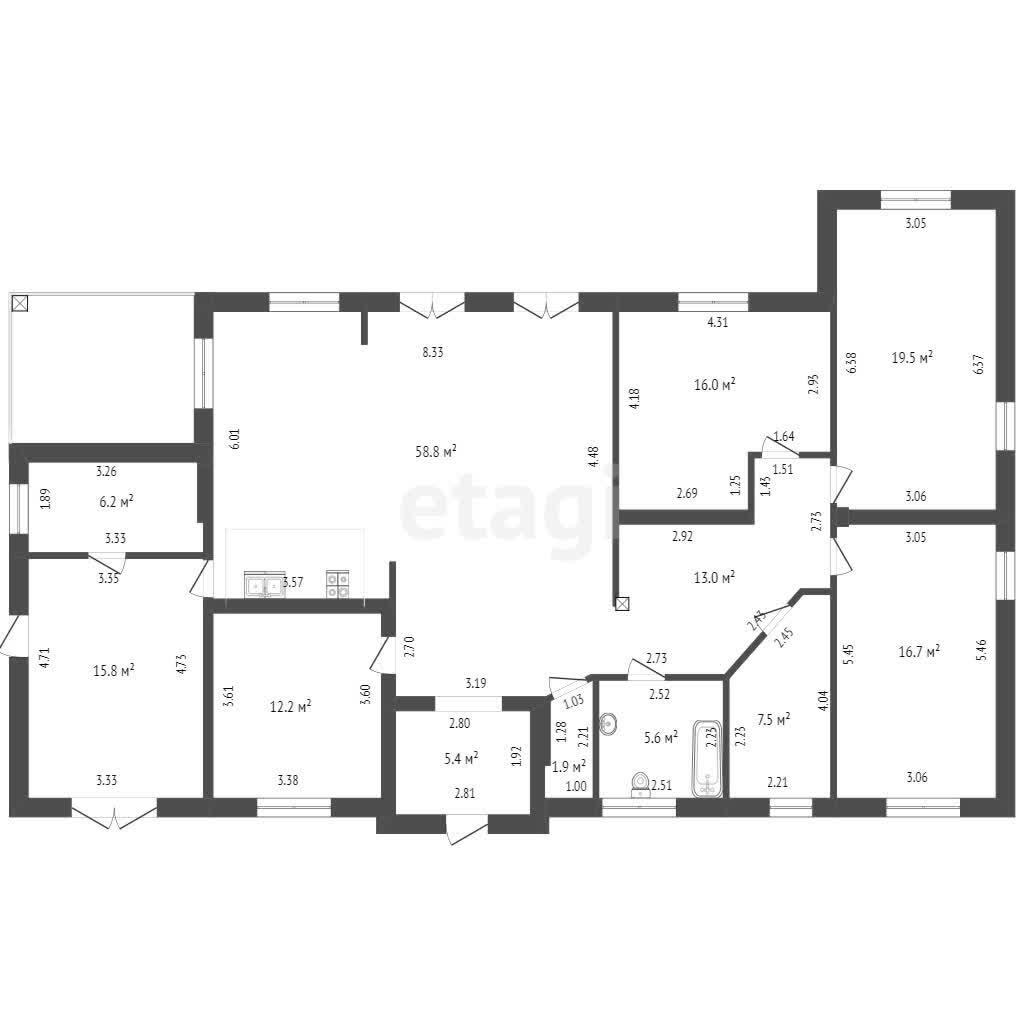 Площадь дома - 178,6 м2 и имеет 5 комнат и 2 сан узла: