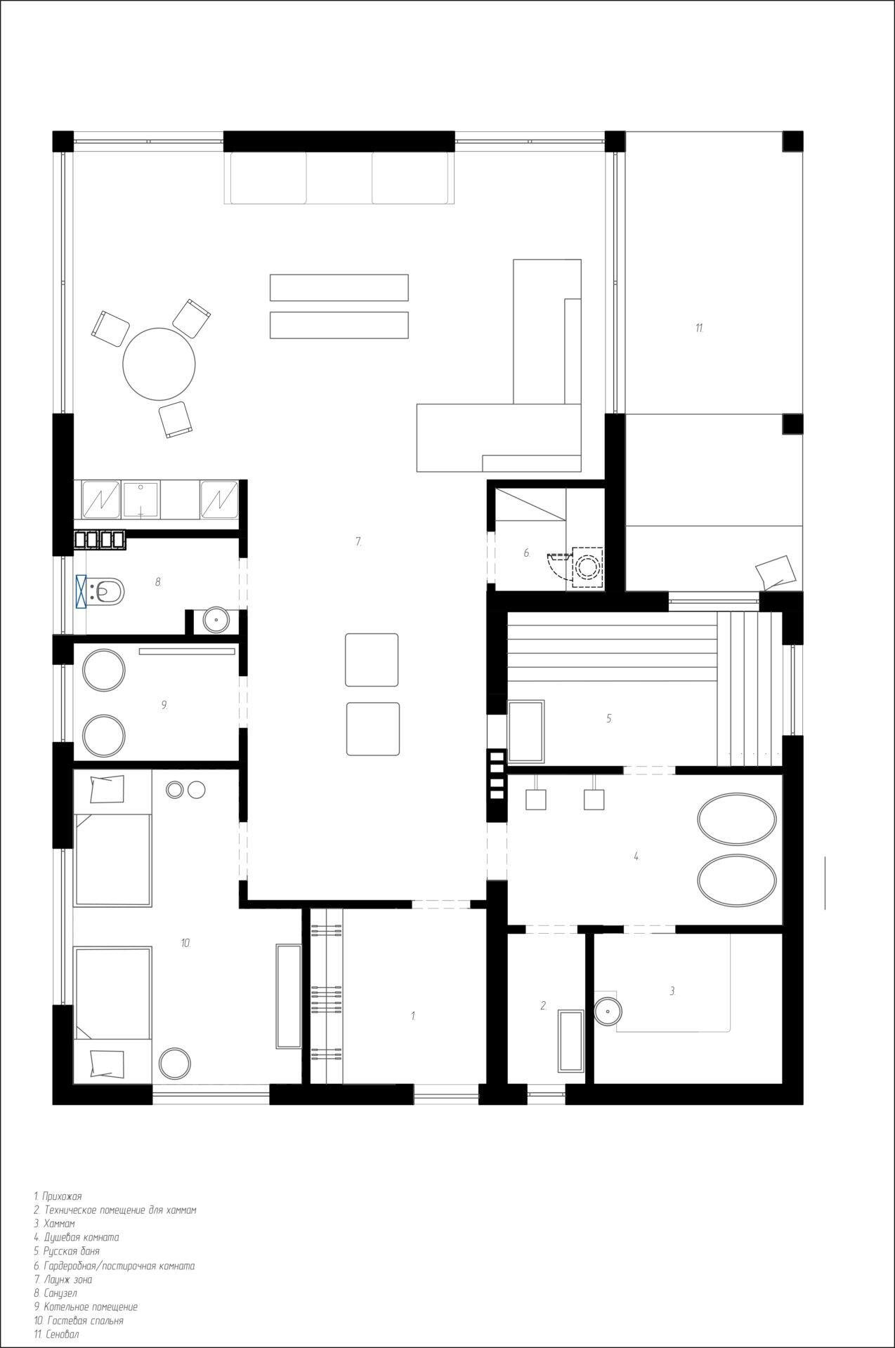 I. Дом в 1 этаж с Русской баней, Хаммамом и Купелями площадью - 145м2 (2023г.п.):- Спроектирован опенспейс гостиной-кухни-столовой с панорамными окнами, которые открывают красоту природы в разное время года;