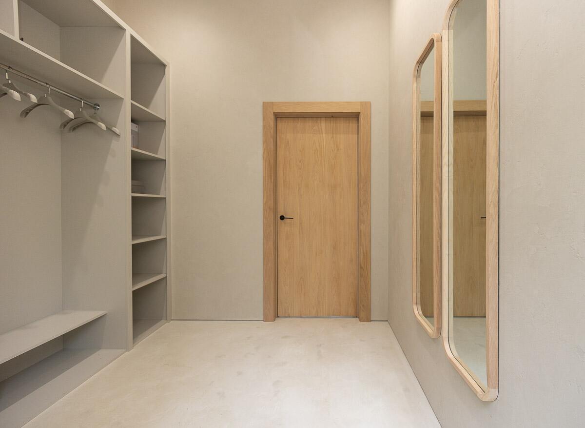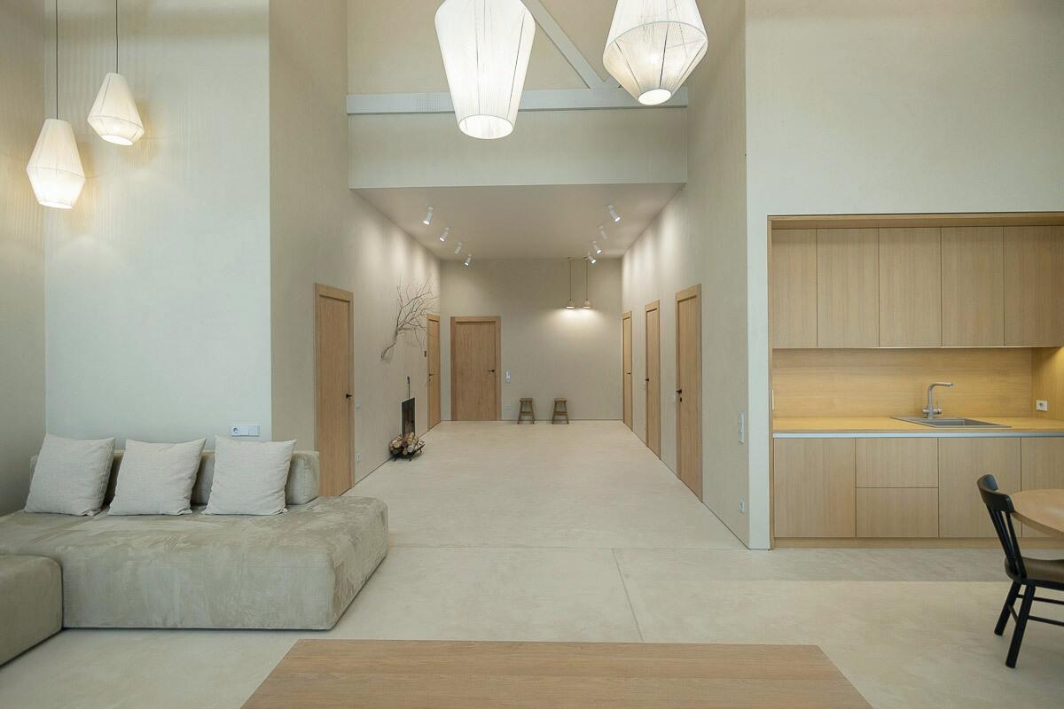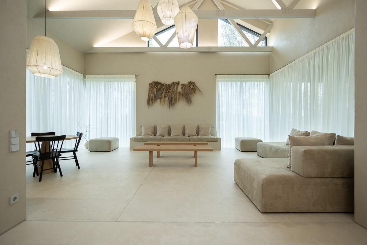 Интерьер выстроен в единой палитре, что делает пространство лаконичным и уютным. Во всех помещениях, кроме хаммама и русской бани, в отделке использован микроцемент. Датские стулья дизайна Ханса Вегнера, Сarl Hansen & Son, органично вписались в белорусский деревенский интерьер. Как и приставные столики-пеньки Gervasoni. Все столярные изделия, обеденный стол и лавки из дуба спроектированы Леной Коваленко, мягкая мебель и кровать изготовлены местной мастерской Studio Furniture. Подвесные светильники из крученой веревки – работа белорусского дизайнера. Все душевые гарнитуры и смесители – от компании Tres.