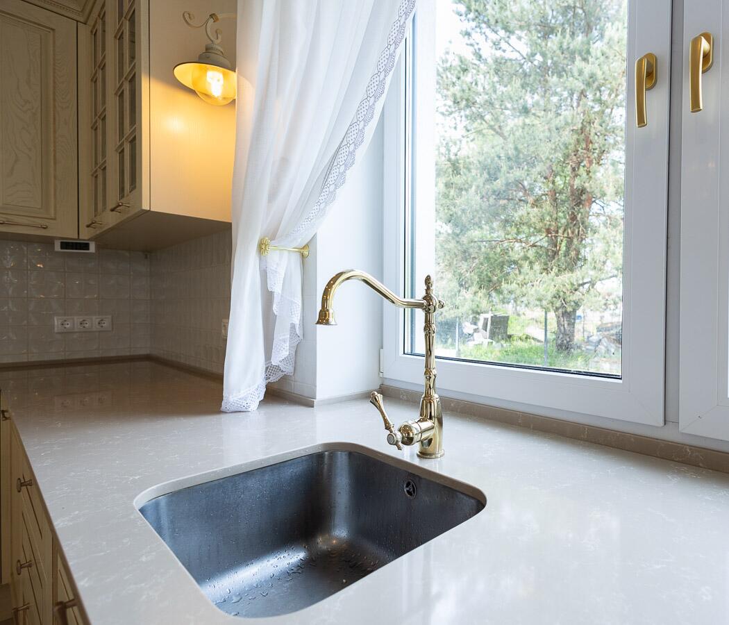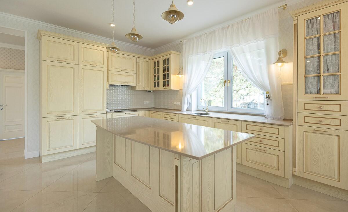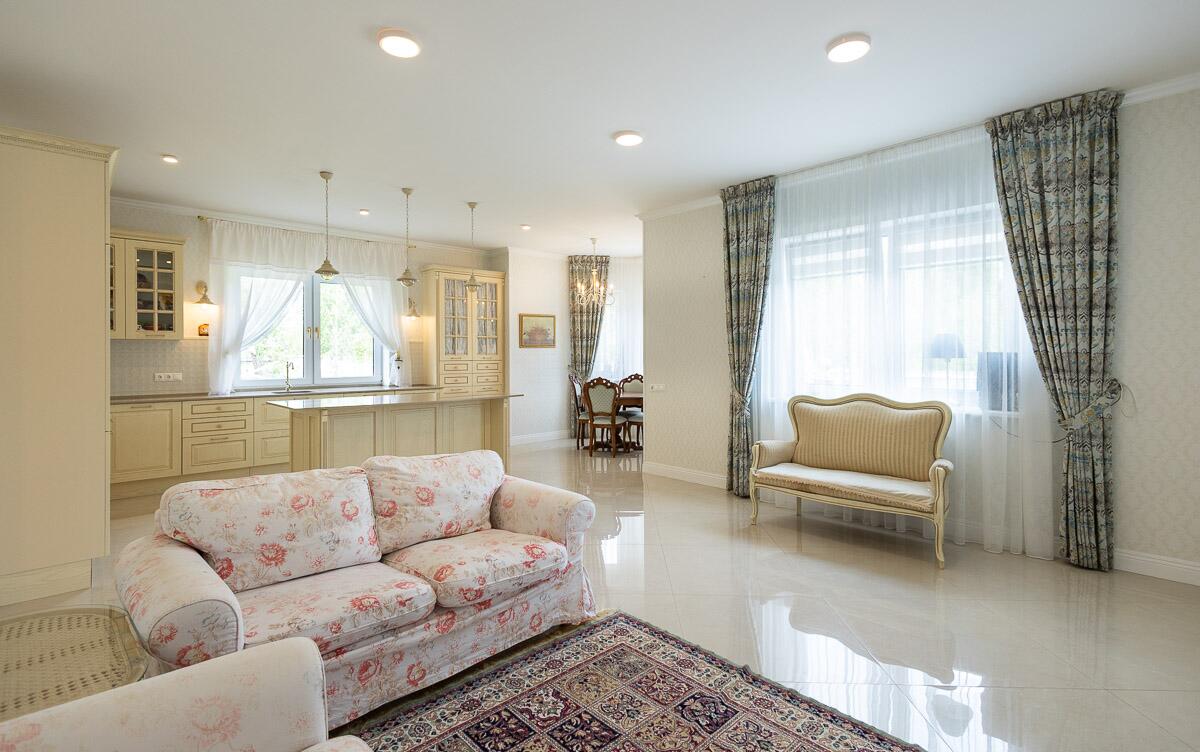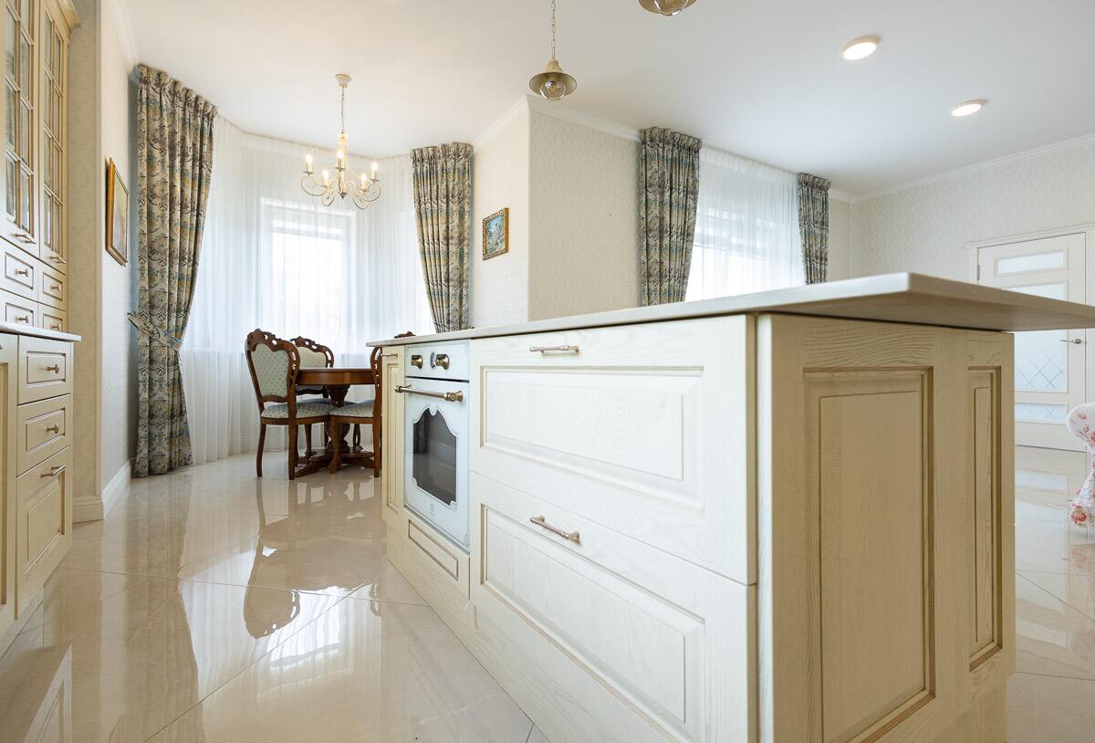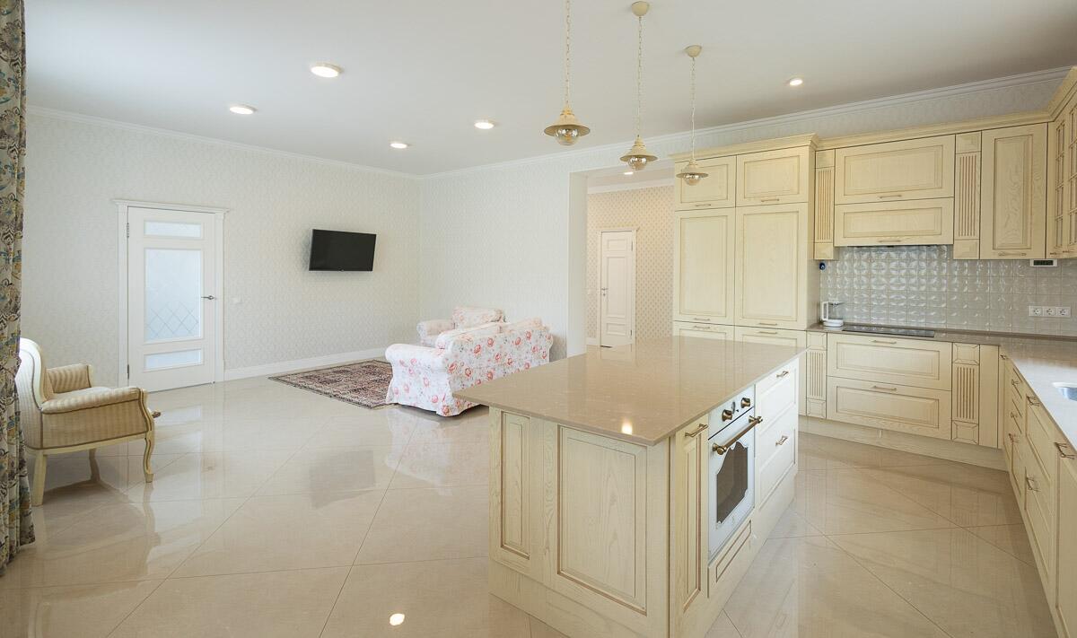 · Большая кухня-гостиная с большими окнами, встроенной бытовой техникой