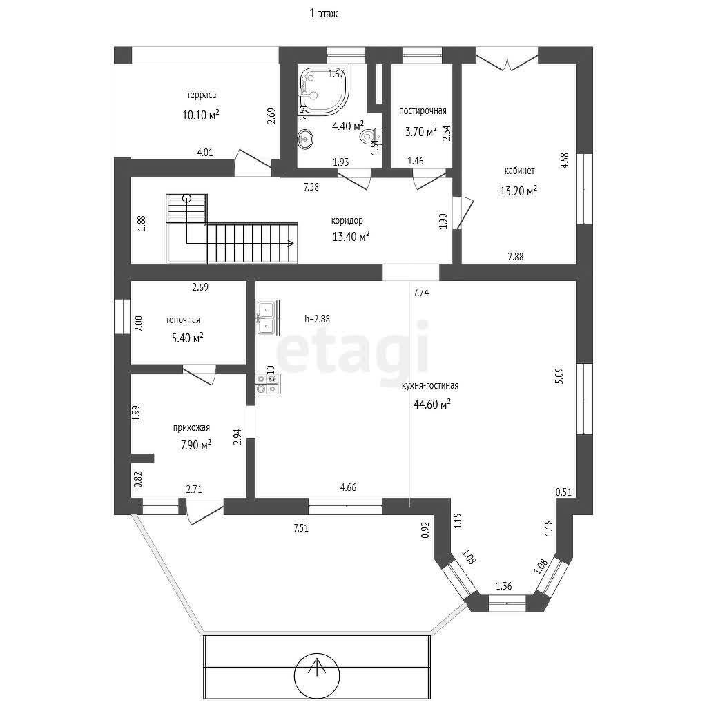 · На первом этаже расположена большая кухня гостиная площадью 44,6м2; кабинет 13,2м2; санузел 4,4м2; постирочная 3,7м2; топочная 5,4м2 и прихожая 7,1м2.