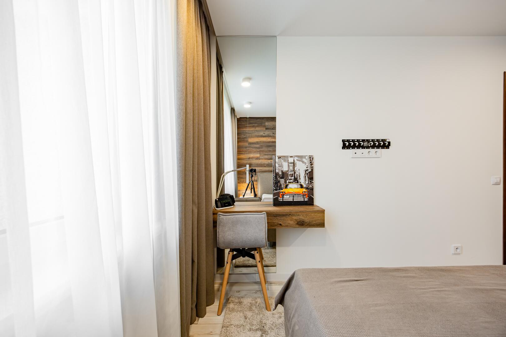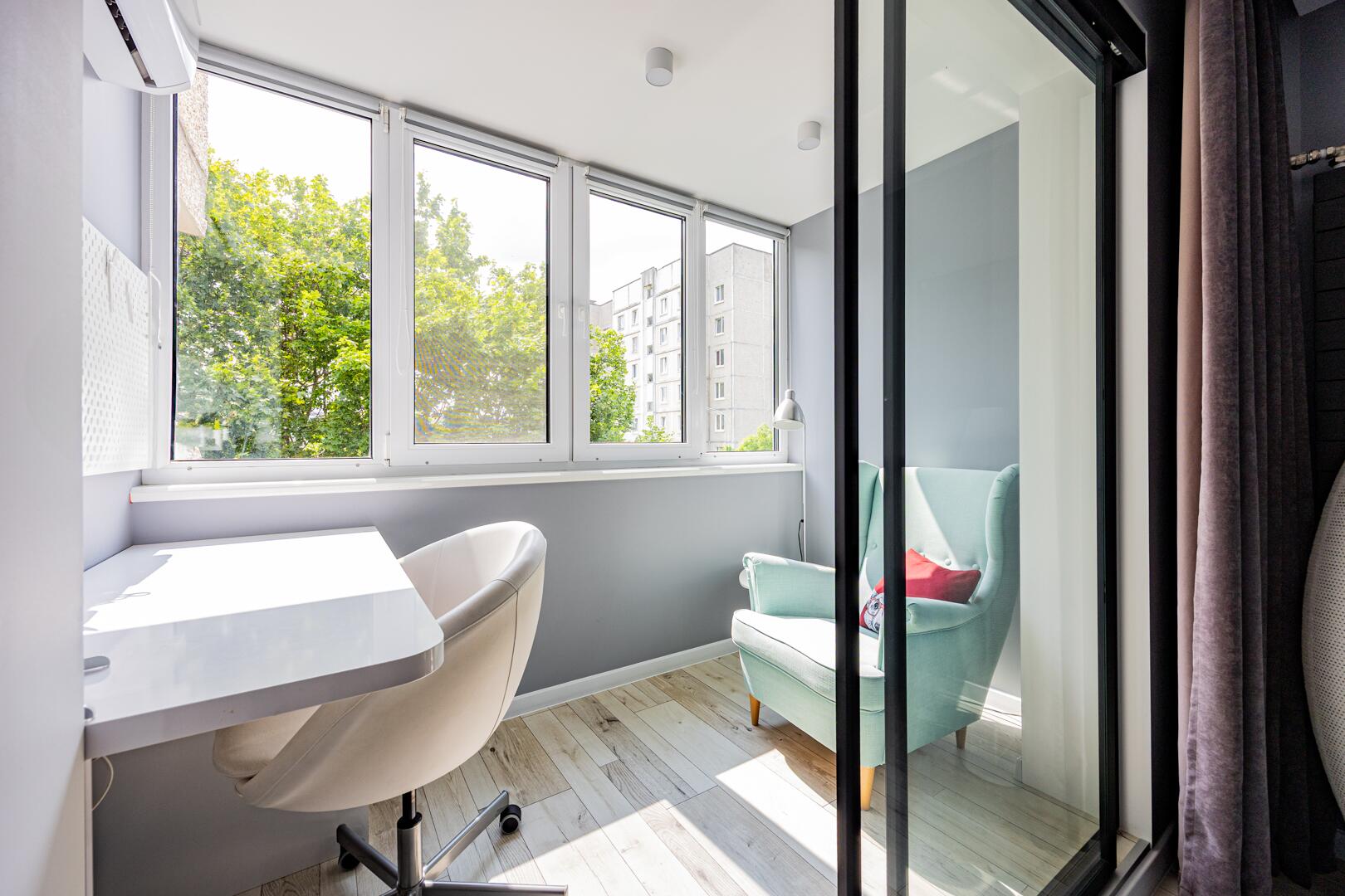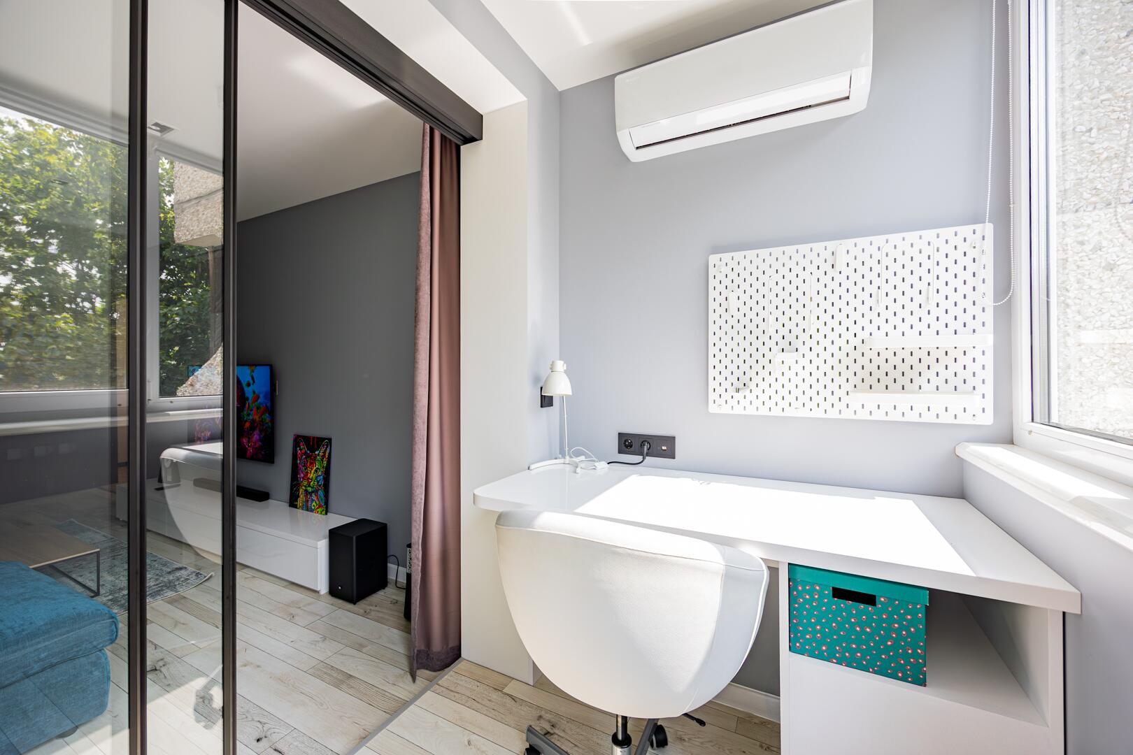 Особое внимание уделено функциональности пространства. Лоджия оборудована как дополнительная зона — здесь можно организовать рабочий кабинет, место для отдыха или чаепитий. Установлены теплый пол и кондиционер, обеспечивающие комфорт в любое время года.