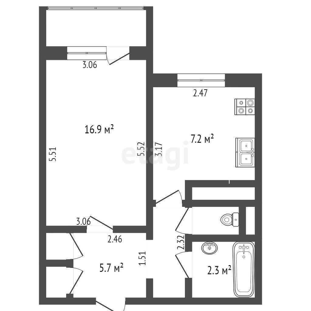 Просторная и светлая однокомнатная площадь — 34.7 м2 по СНБ, жилая 16.9 м2, кухня 7.2 м2
