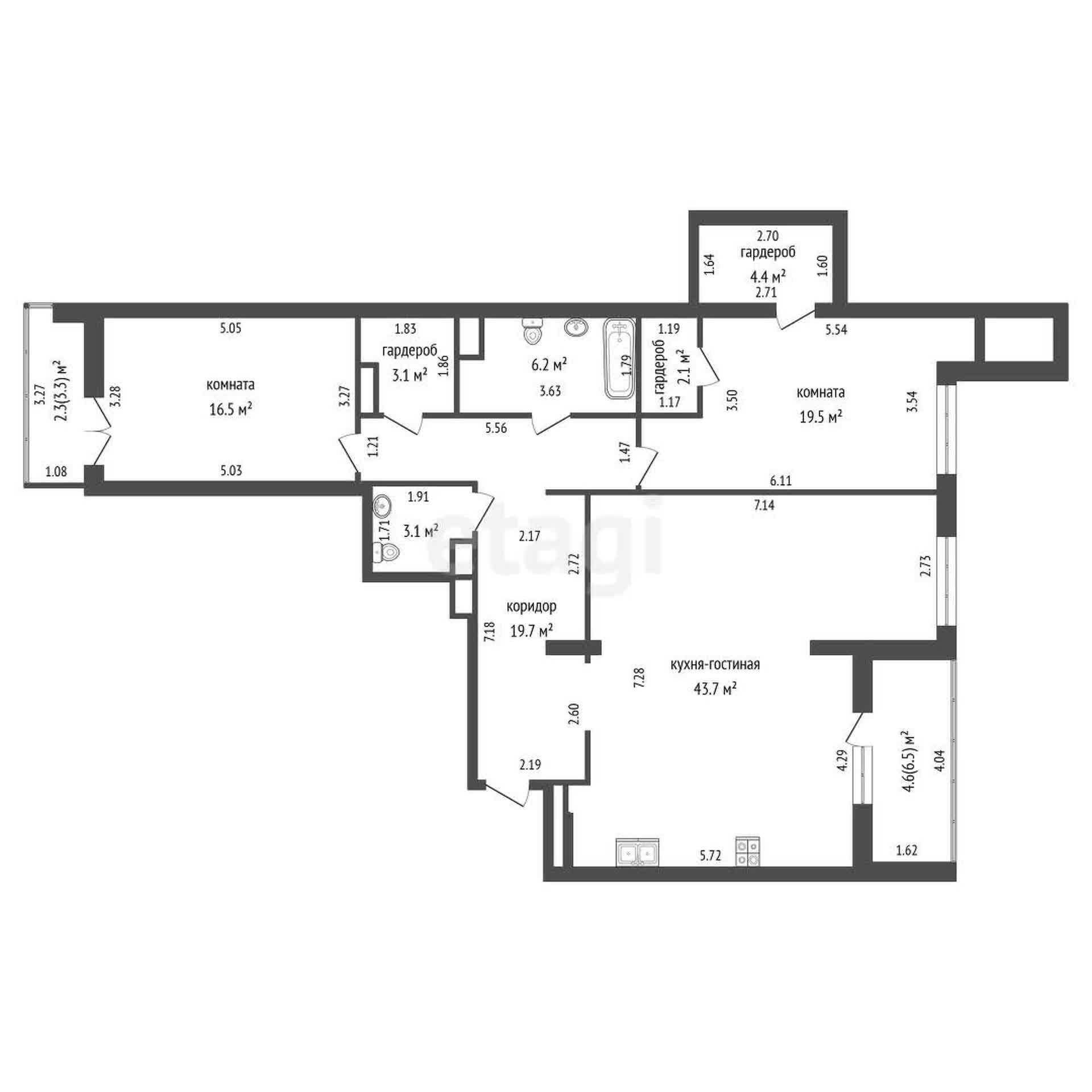- Общая площадь квартиры по СНБ – 125,2 м2
