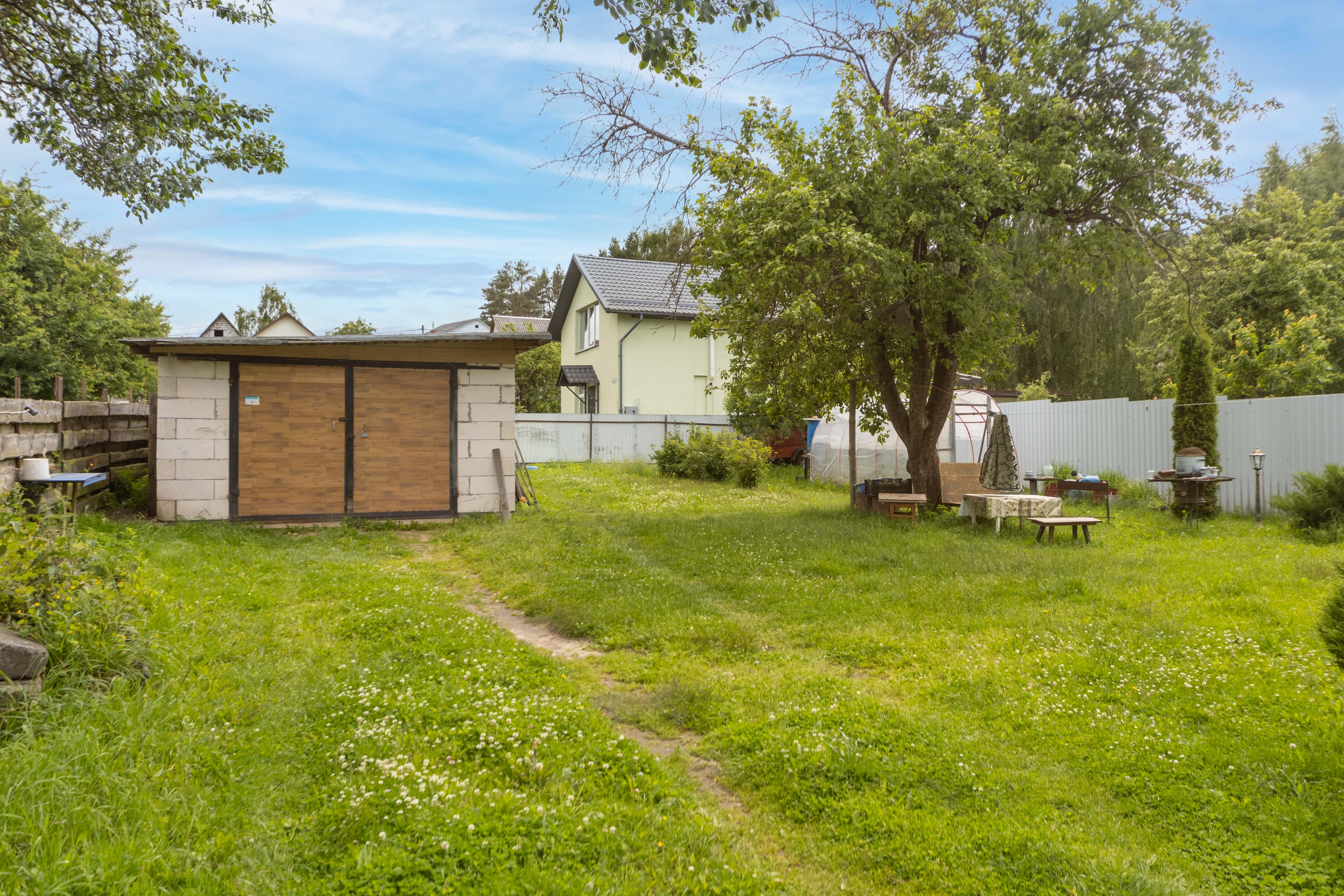 Ровный, плодородный участок 7,98 соток. По всему периметру установлено ограждение из металлопрофиля. На территории участка построен гараж с ямой.