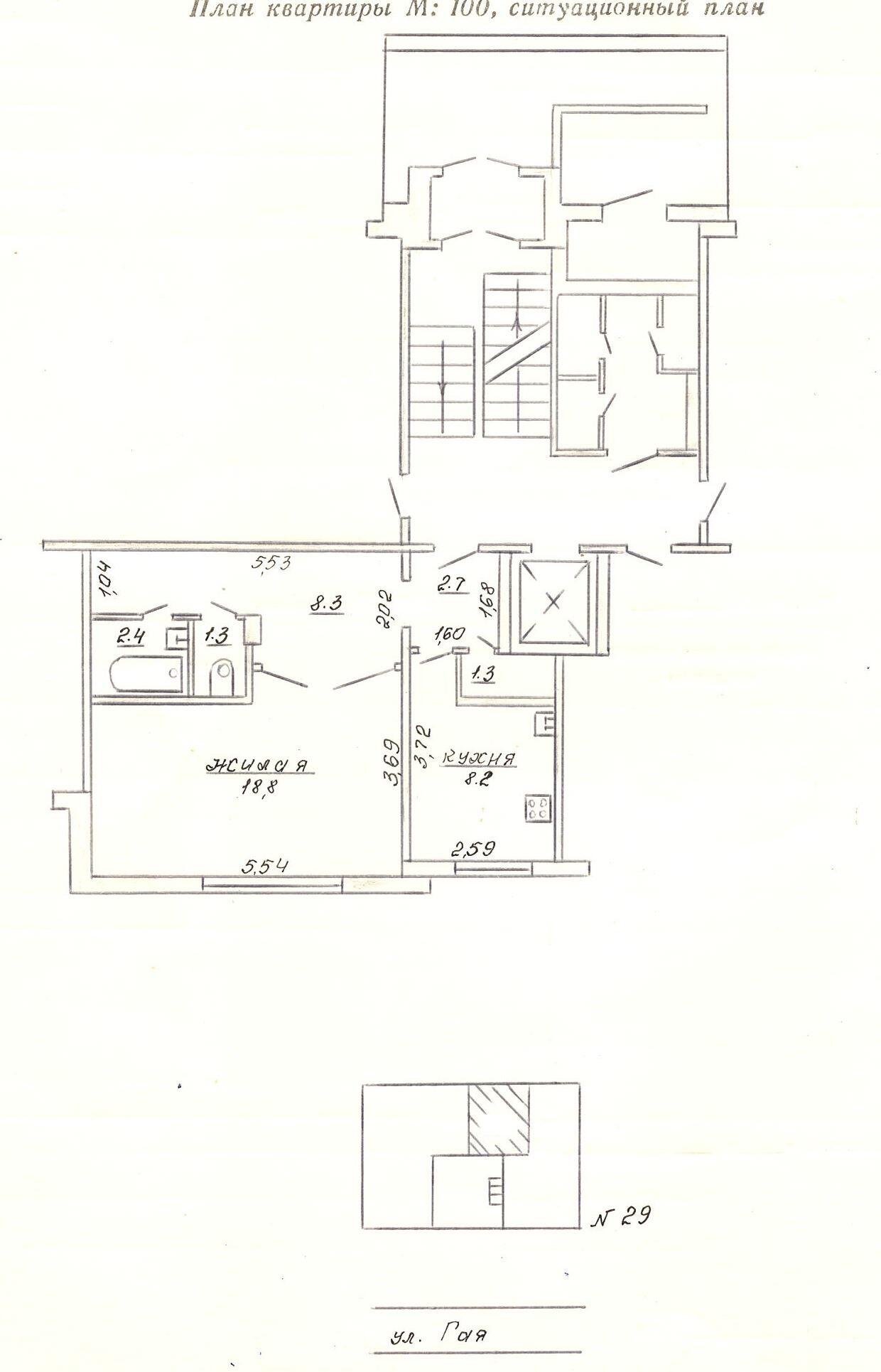 Общая площадь квартиры 43 м. кв, жилая 18.8 м. кв., кухня 8.2 м. кв.