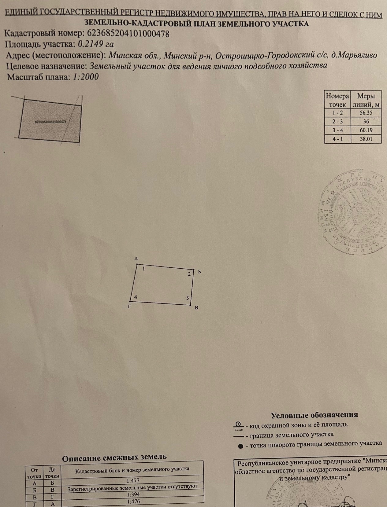 Продам земельный участок с кадастровым номером 623685204101000478. Координаты: 54.037743, 27.663186. Адрес объекта Минская обл., Минский р-н., Острошицко-Городокский с/с, д. Марьяливо. Участок находится рядом с домом по ул. Криничная, 29-А. Назначение - Земельный участок для ведения личного подсобного хозяйства. Участок правильной формы. Плюсы участка: Возможность смены целевого назначения. Живописная природа, тихая деревня, при этом - 10-15 минут до Минска. Рядом жилые дома, развитая коттеджная застройка. Звоните или пишите.