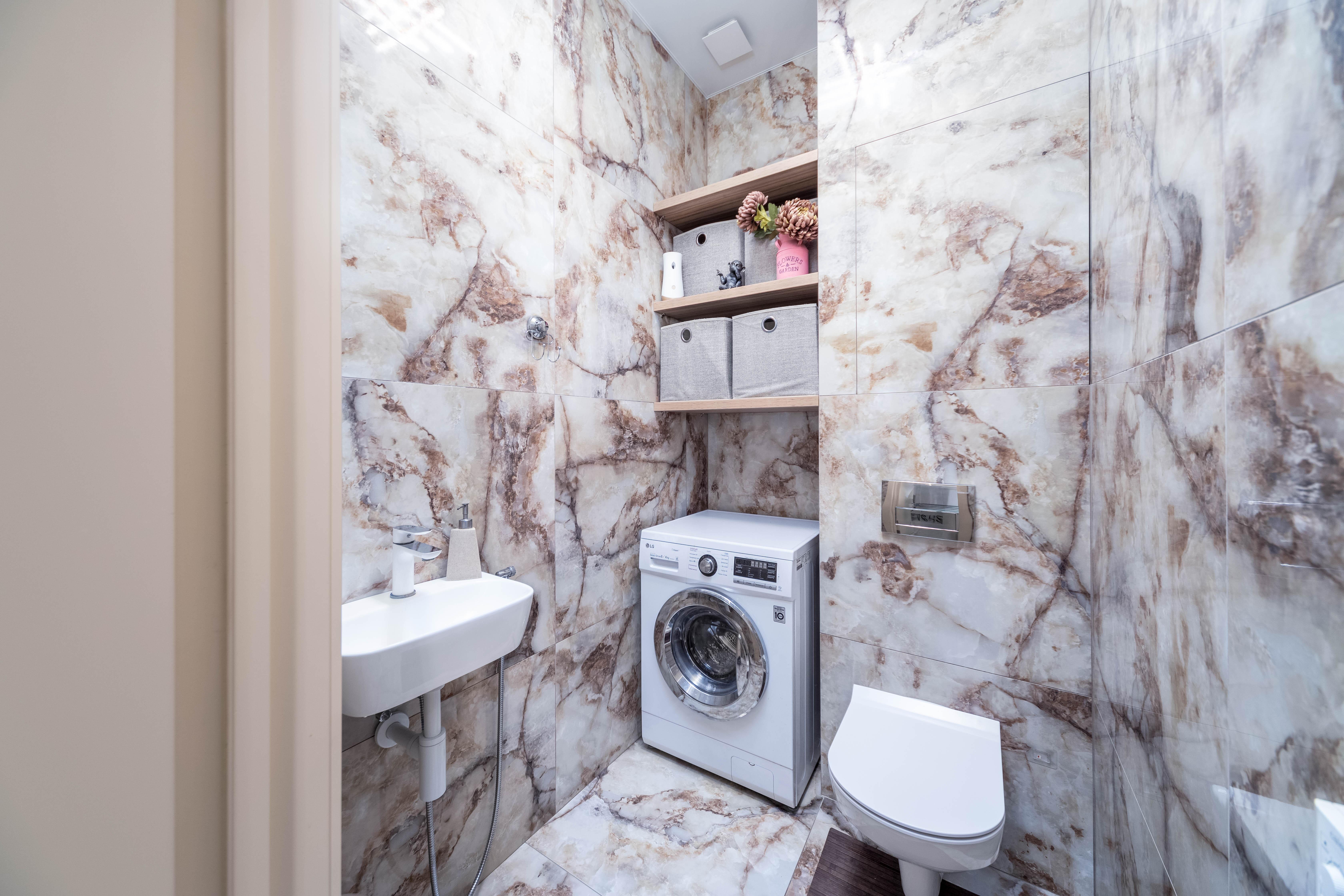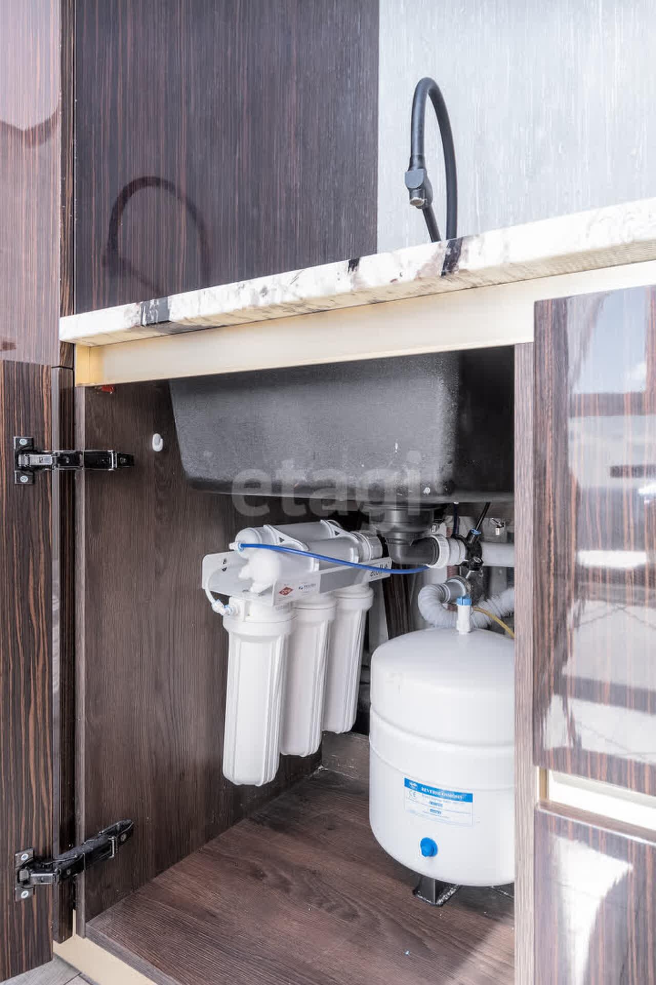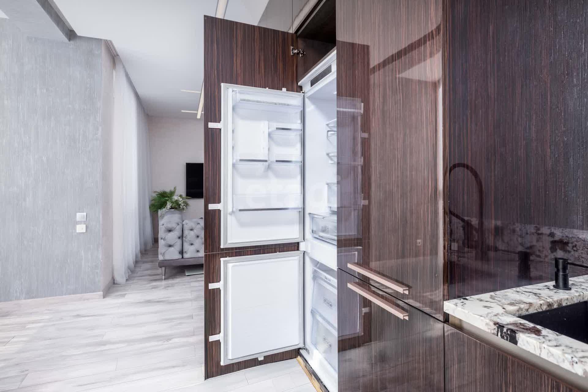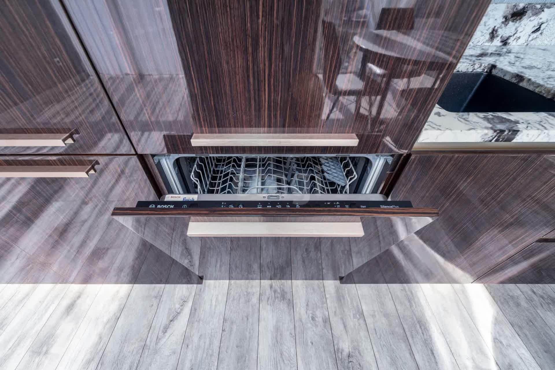 Кухня – лакированный шпон. Столешница – натуральный бразильский мрамор. Доводчики Blum. Встроенный холодильник, посудомоечная машина, стационарный фильтр для воды.