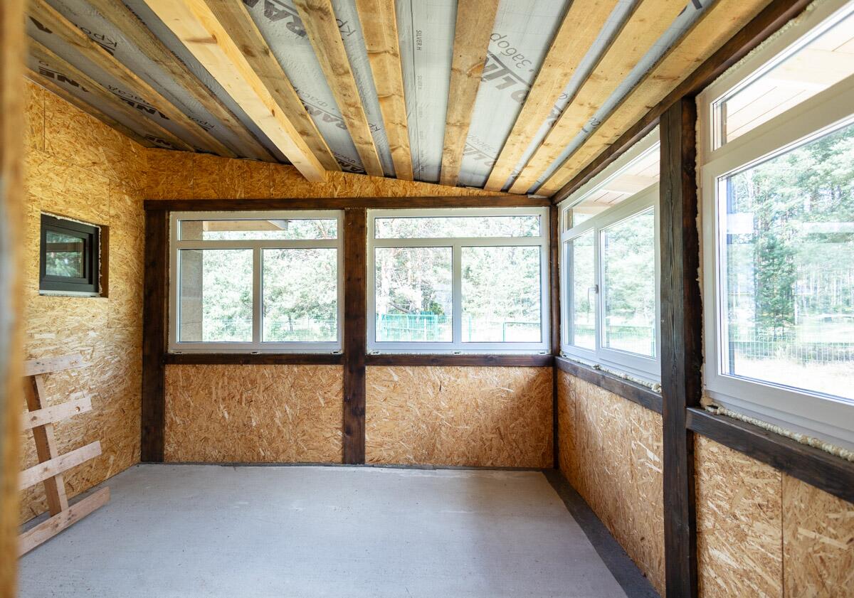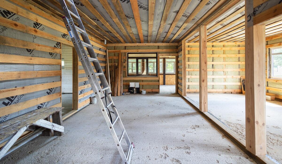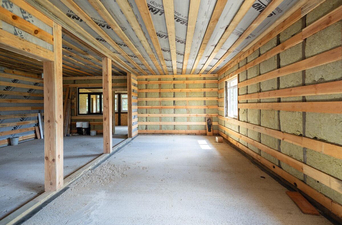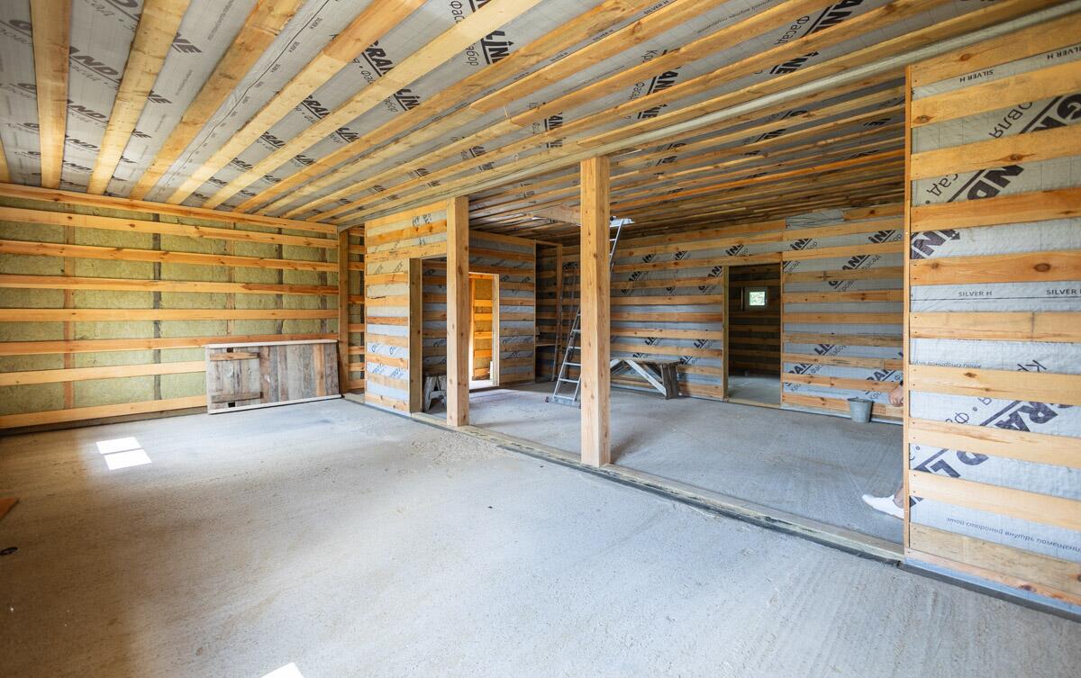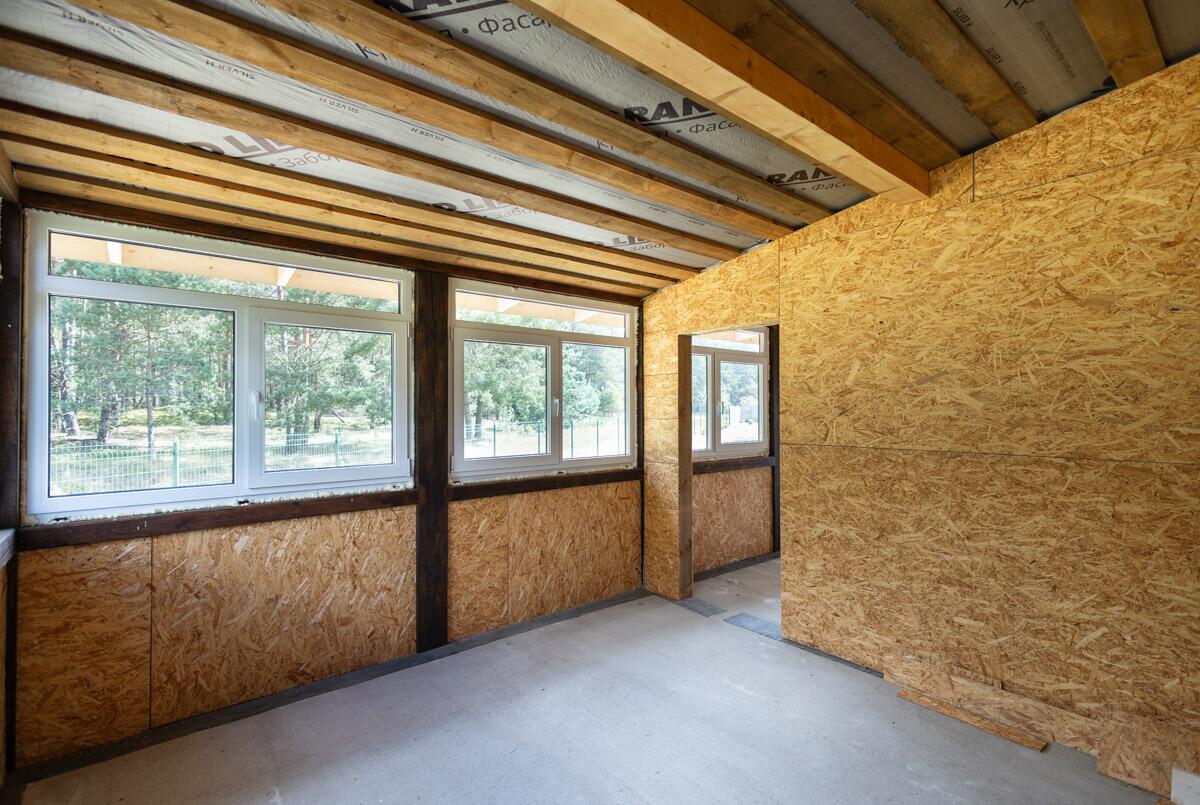 · Второй этаж построен по каркасной технологии: вертикальные стены — 200 мм, утеплитель, пароизоляция и внешняя гидроизоляция.