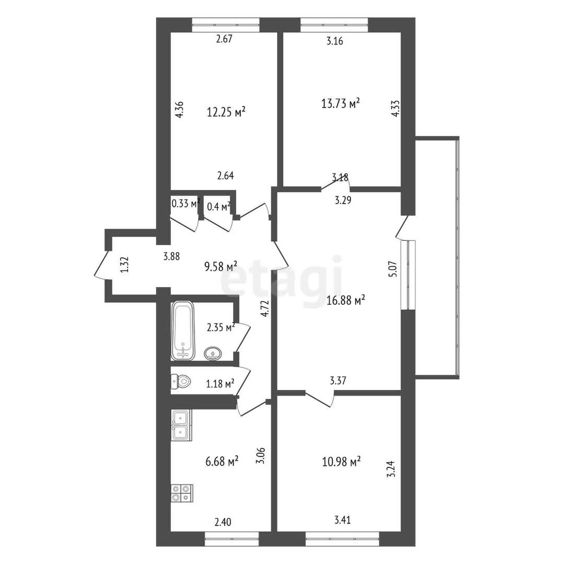 Функциональная планировка включает: четыре жилые комнаты, кухню, раздельный санузел, удобный просторный коридор с возможностью оборудовать гардеробную или систему хранения.