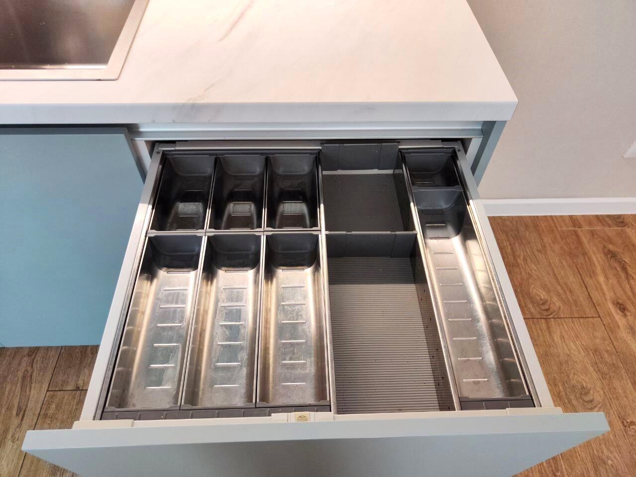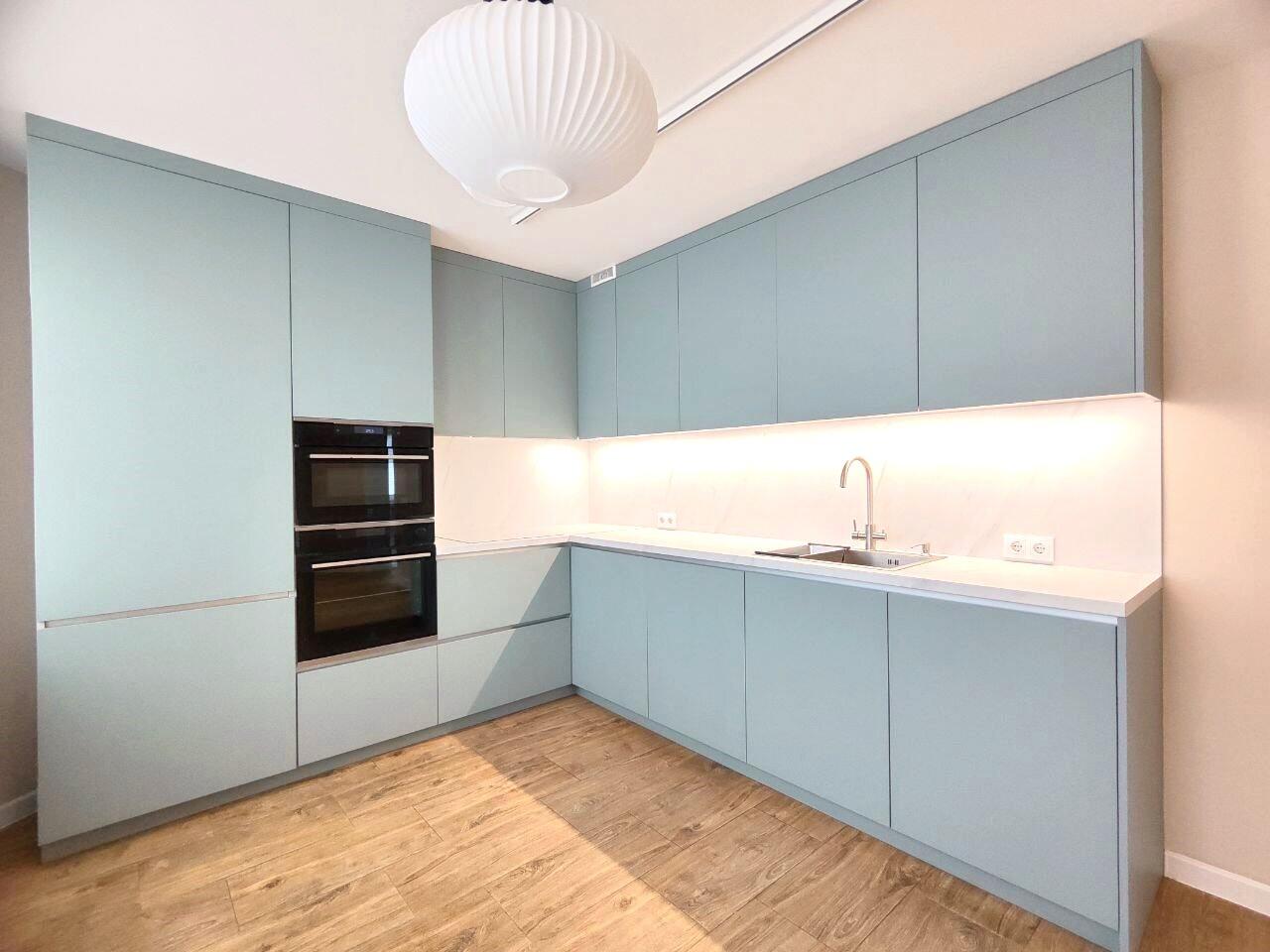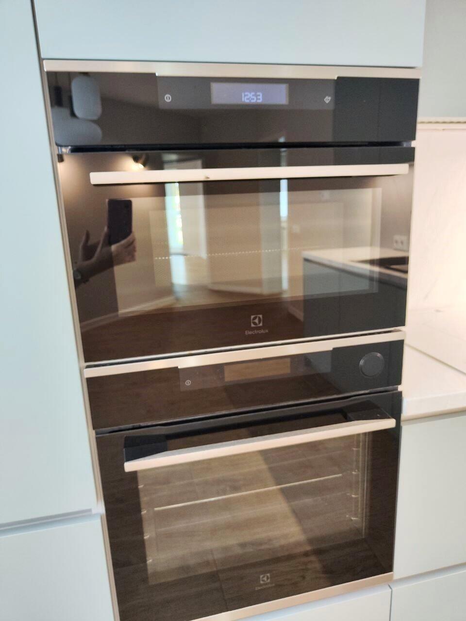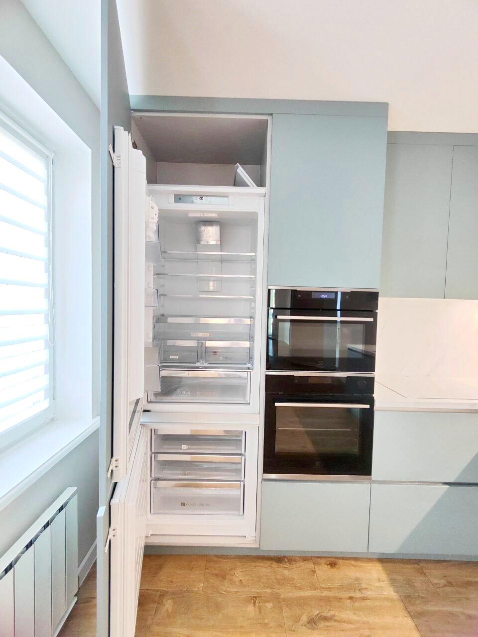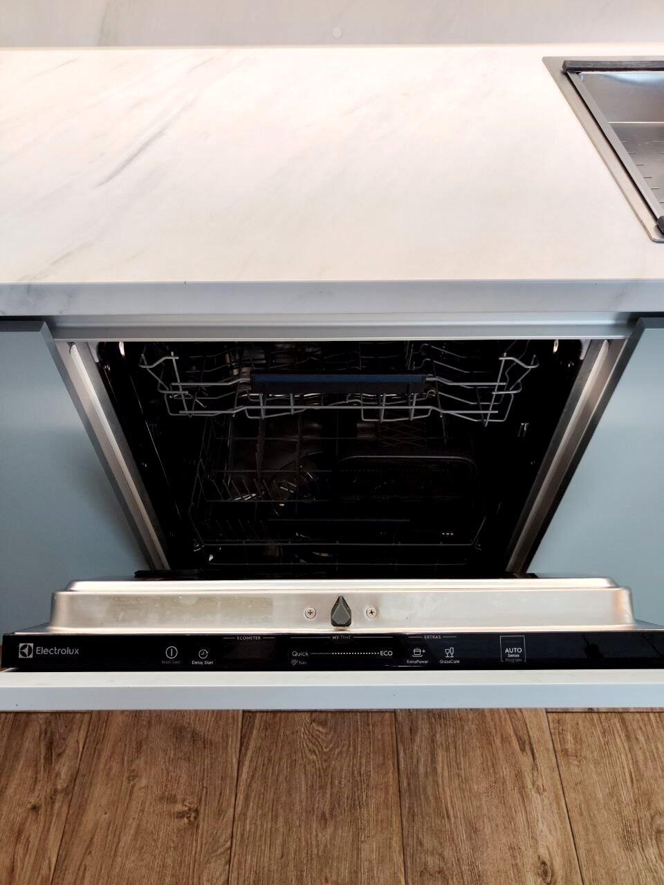Встроенная кухня со встроенной техникой Electrolux – микроволновка, духовой шкаф, посудомоечная машина, индукционная варочная панель, вытяжка. Встроенный холодильник высотой 2 м.
