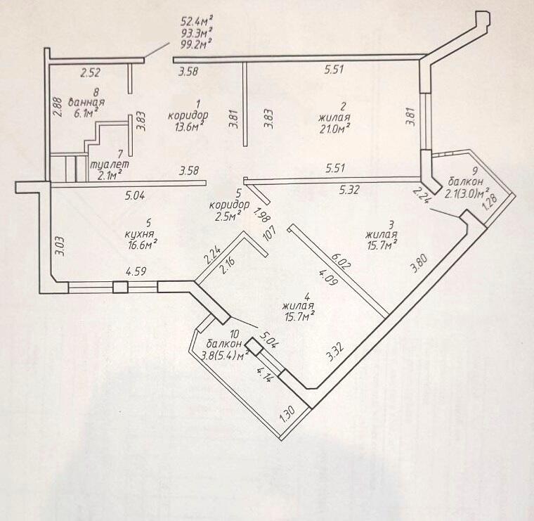 Площади квартиры: 99,2(СНБ)93,3/52,4/16,6, 2 балкона застеклены, 2 полноценных санузла (в одном санузле установлена ванна, во втором душевая), высота потолков -2,65 м, 1–й высокий этаж 9-ти этажного панельного дома 2011 года постройки
