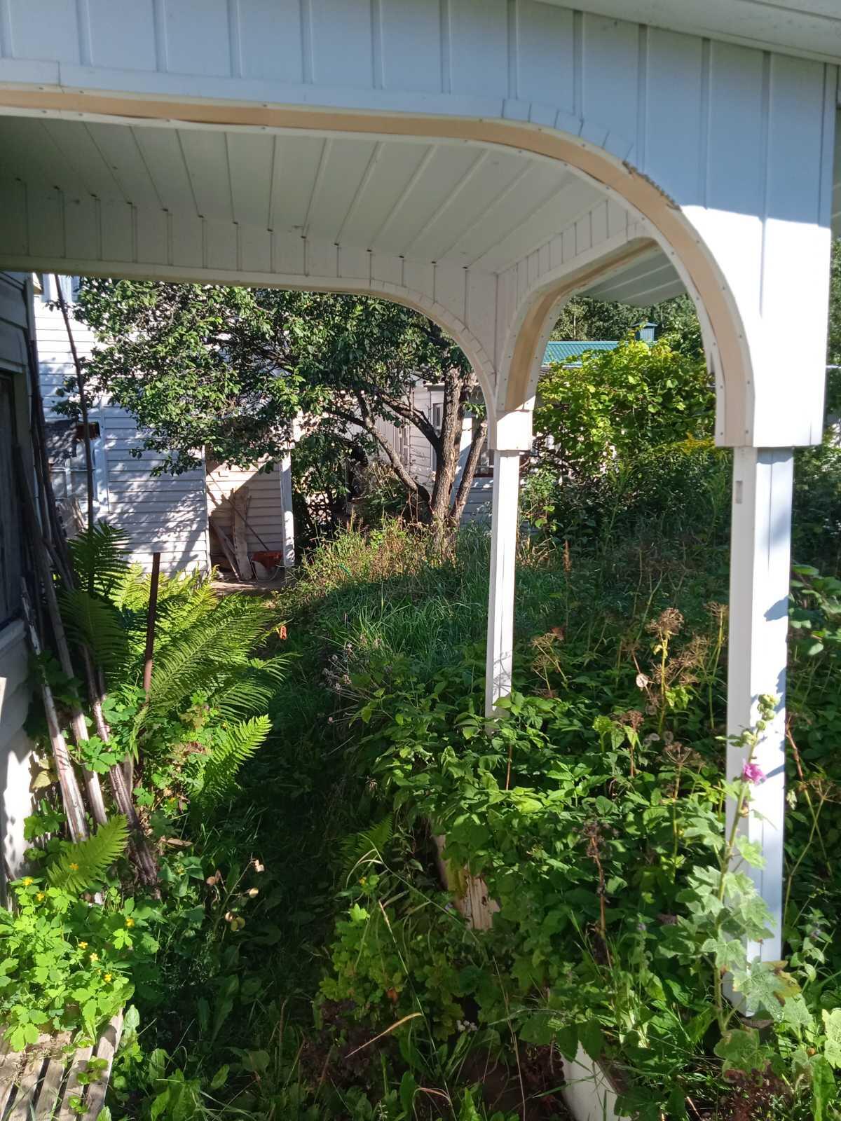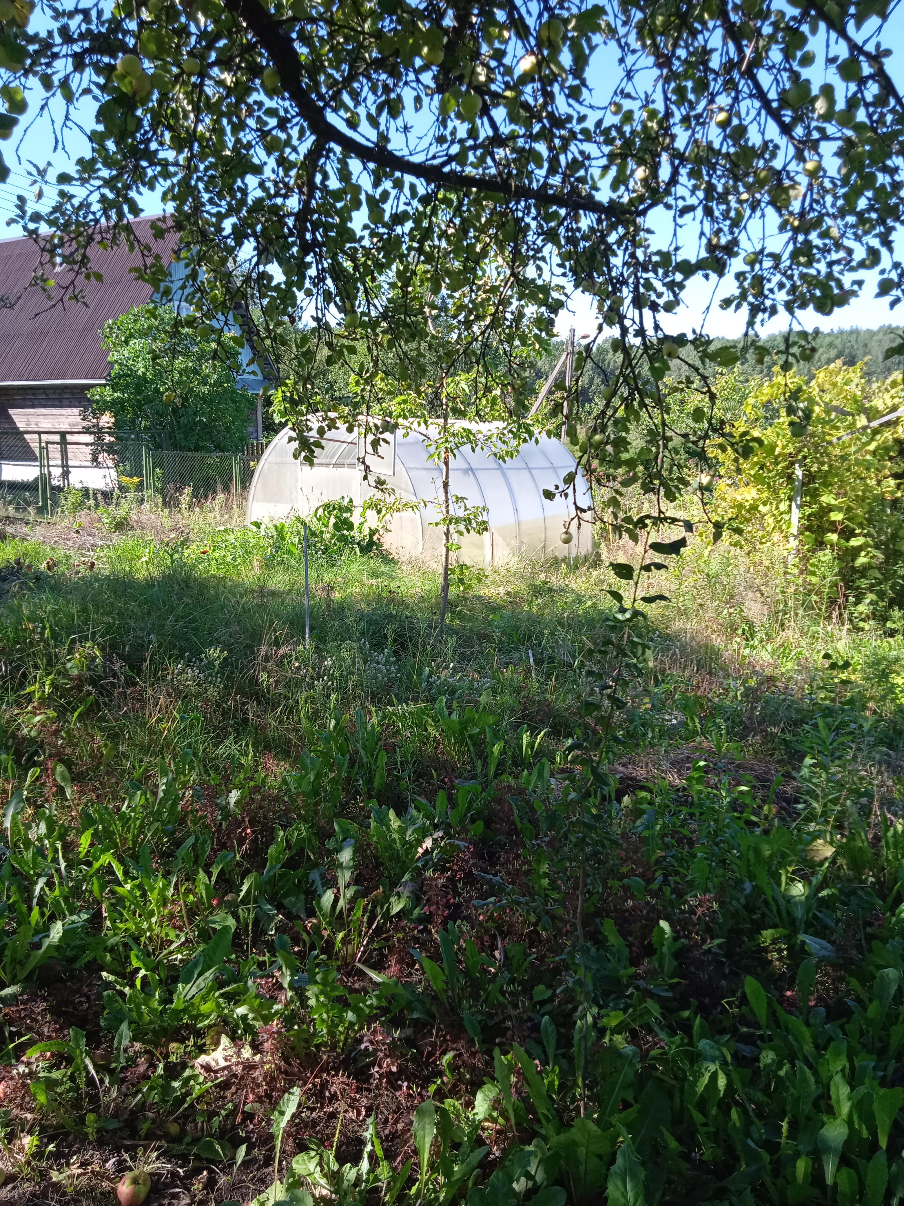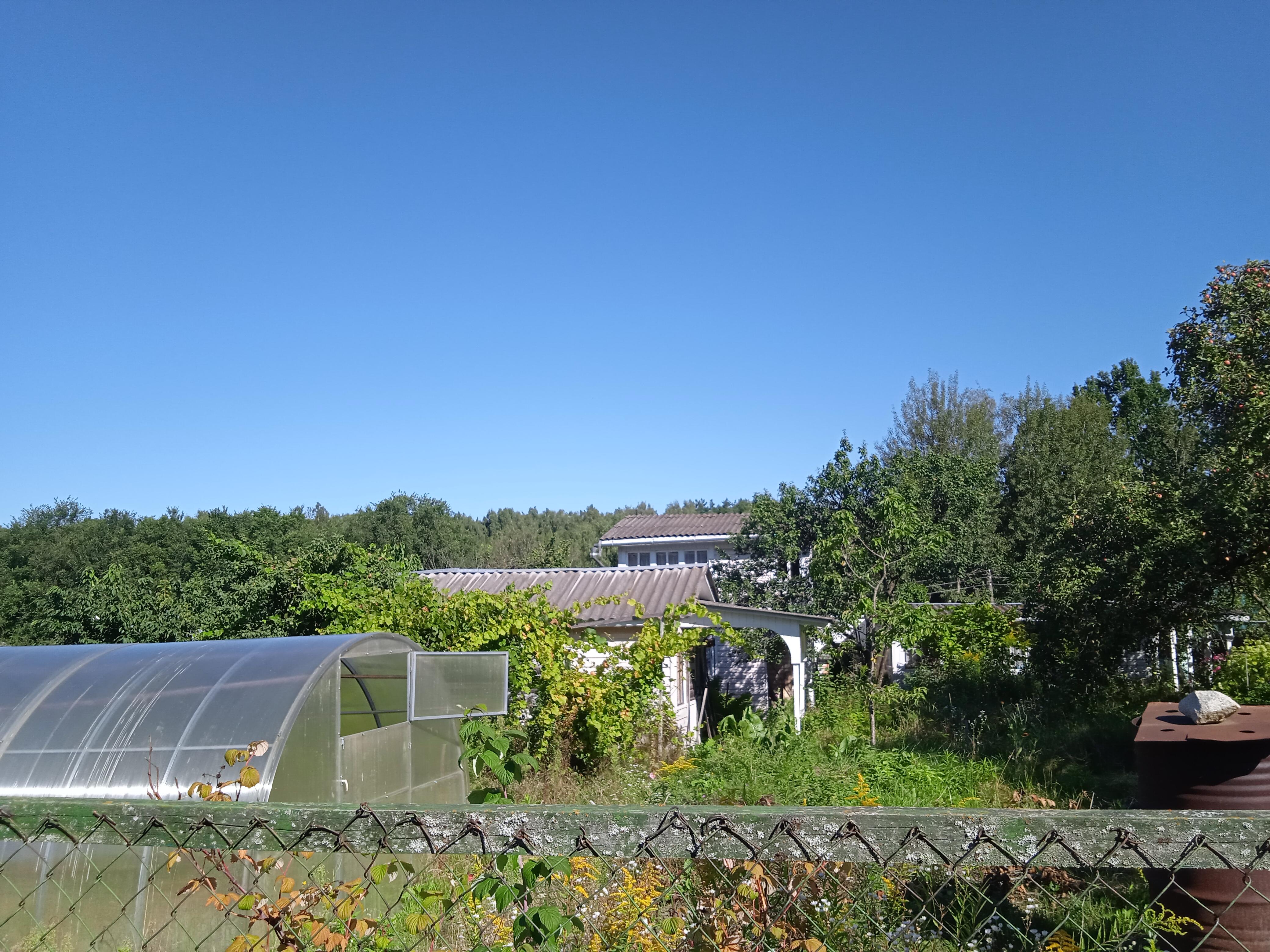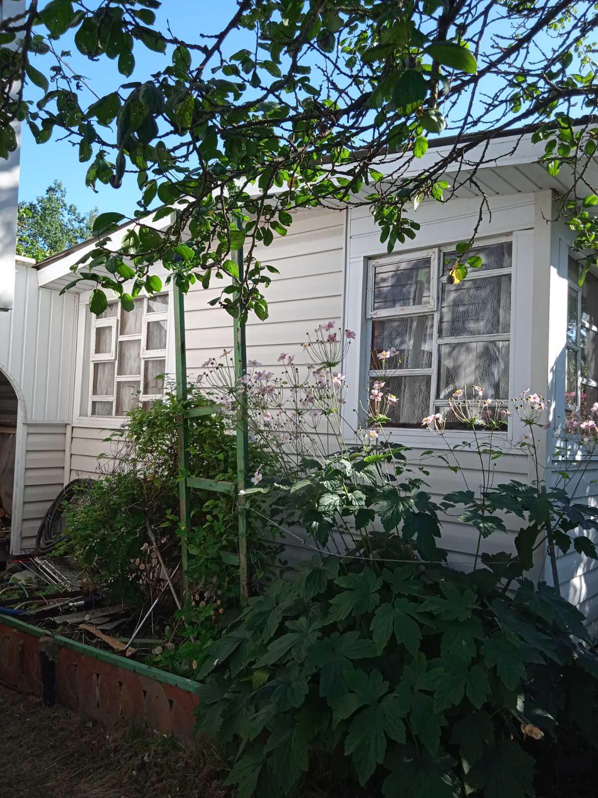 На участке растут яблони, черносливка, малина. Много декоративных цветов.