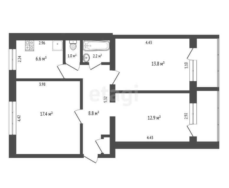 Три изолированные комнаты: 17,4 кв.м, 12,9 кв.м и 13,8 кв.м