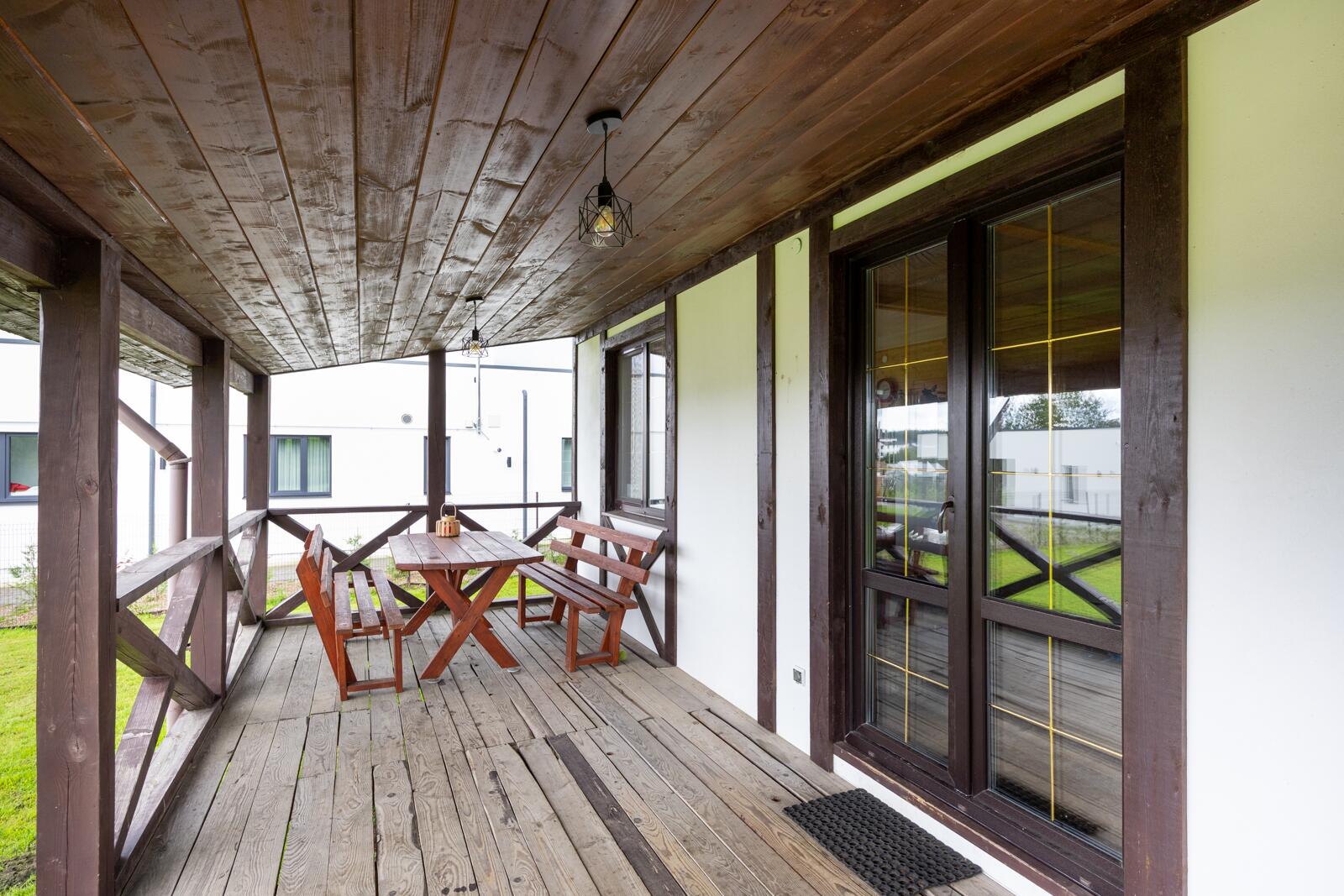 Дом построен профессиональной компанией с соблюдением всех строительных норм. Каркасный, с надёжным свайным фундаментом и брусом 20х20, с утеплёнными стенами и крышей, с качественной паро- и гидроизоляцией. Снаружи и внутри обшит деревом, окна — ПВХ KBE. Электропроводка разведена грамотно, с автоматами на каждую группу и запасом мощности. Предусмотрены розетки для электроконвекторов. Водоснабжение выполнено трубами ПВХ, установлен бойлер. Канализация — переливной септик на 4 кольца.