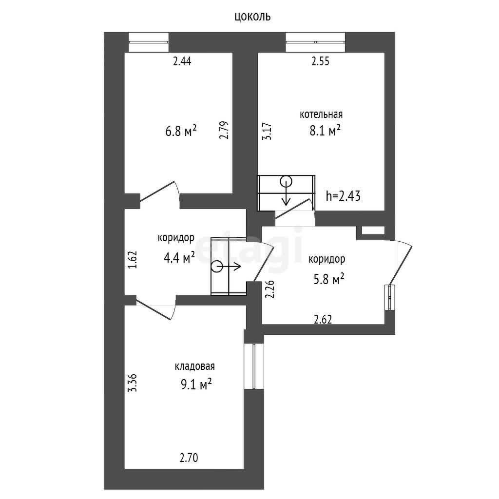 Цокольный этаж: ванная (6.8 м2), кладовая (9.1 м2), котельная (8.1м2).