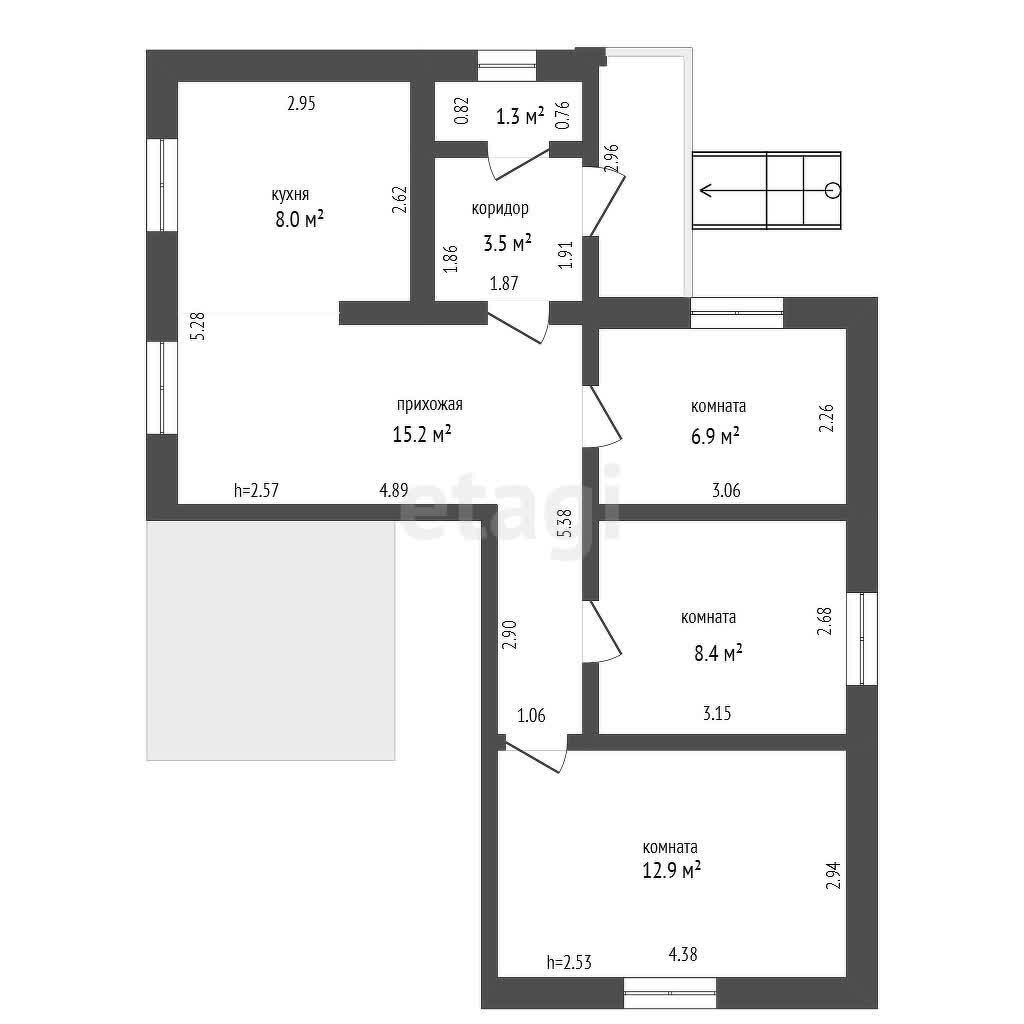 1 этаж: три отдельные жилые комнаты (12.9 м2, 8.4 м2 и 6.9 м2).