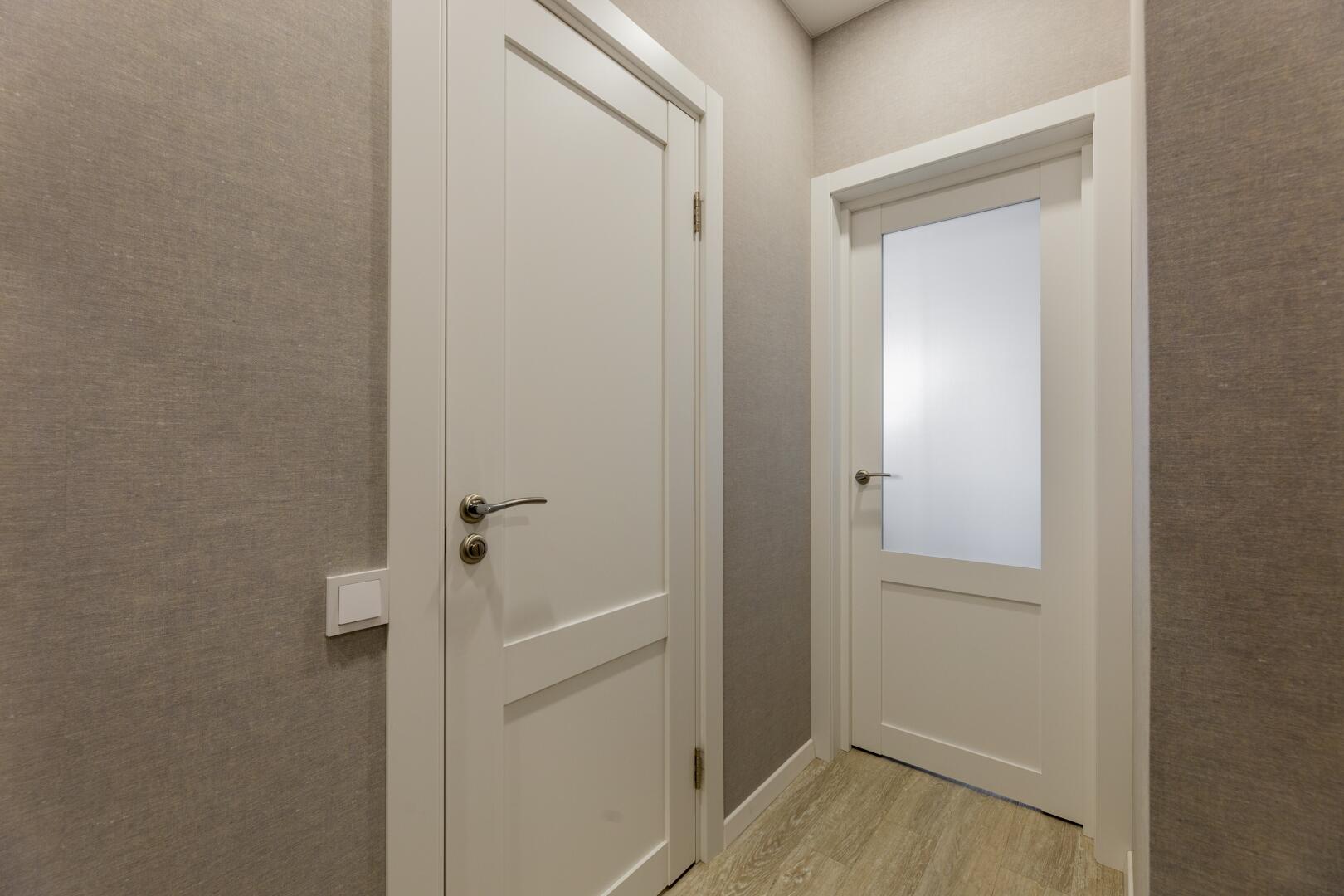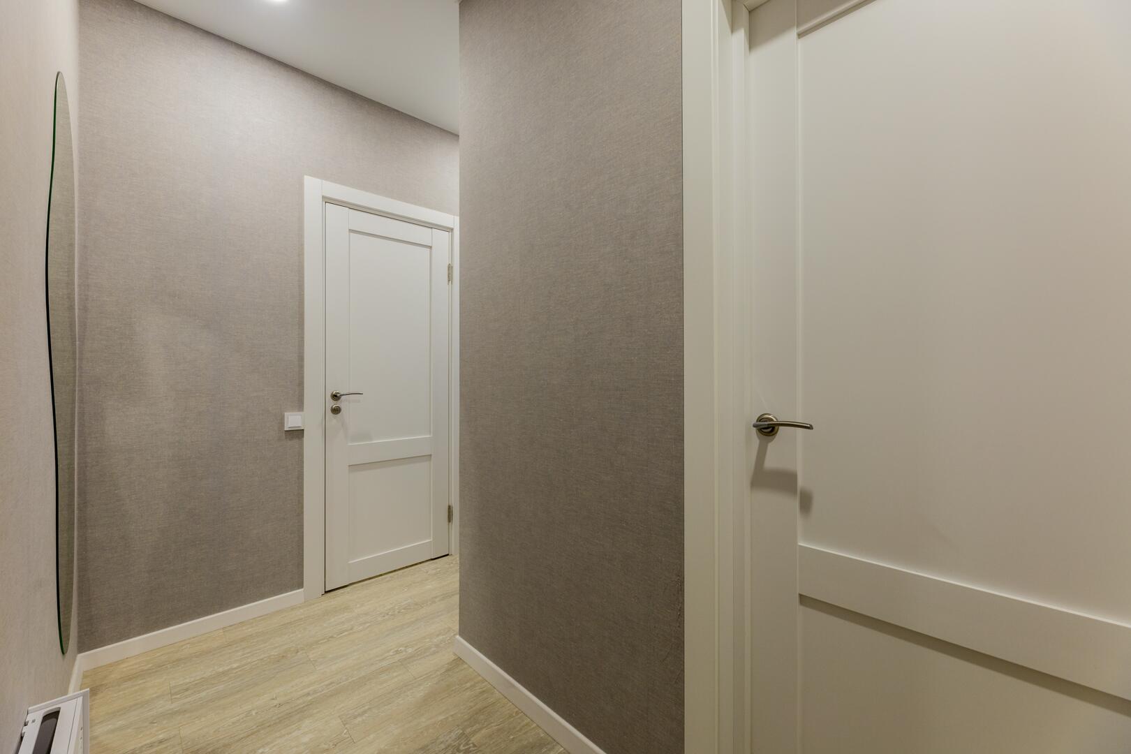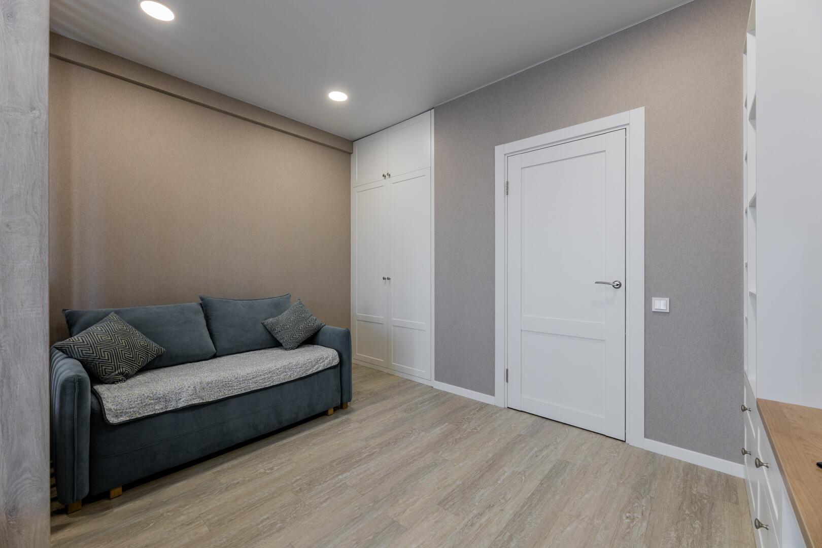 Новая, укрепленная входная дверь. Межкомнатные двери - экоэмаль. Шкафы в комнате и прихожей изготовлены из ЛДСП EGGER. Напольное покрытие - кварц-винил. Потолки натяжные. Комната оклеена светлыми обоями (производство Бельгия).